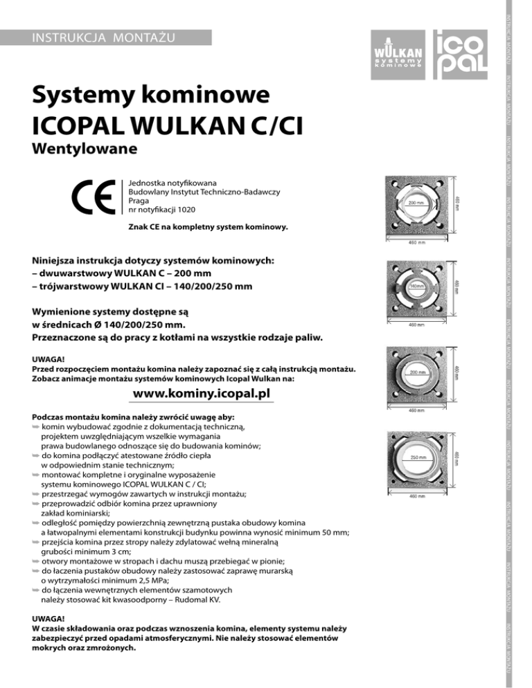 Znak CE na kompletny system kominowy. www.kominy.icopal.pl INSTRUKCJA MONTAŻU INSTRUKCJA MONTAŻU INSTRUKCJA MONTAŻU UWAGA! W czasie składowania oraz podczas wznoszenia komina, elementy systemu należy zabezpieczyć przed opadami atmosferycznymi. Nie należy stosować elementów mokrych oraz zmrożonych. INSTRUKCJA MONTAŻU Podczas montażu komina należy zwrócić uwagę aby:  komin wybudować zgodnie z dokumentacją techniczną, projektem uwzględniającym wszelkie wymagania prawa budowlanego odnoszące się do budowania kominów;  do komina podłączyć atestowane źródło ciepła w odpowiednim stanie technicznym;  montować kompletne i oryginalne wyposażenie systemu kominowego ICOPAL WULKAN C / CI;  przestrzegać wymogów zawartych w instrukcji montażu;  przeprowadzić odbiór komina przez uprawniony zakład kominiarski;  odległość pomiędzy powierzchnią zewnętrzną pustaka obudowy komina a łatwopalnymi elementami konstrukcji budynku powinna wynosić minimum 50 mm;  przejścia komina przez stropy należy zdylatować wełną mineralną grubości minimum 3 cm;  otwory montażowe w stropach i dachu muszą przebiegać w pionie;  do łaczenia pustaków obudowy należy zastosować zaprawę murarską o wytrzymałości minimum 2,5 MPa;  do łączenia wewnętrznych elementów szamotowych należy stosować kit kwasoodporny – Rudomal KV. INSTRUKCJA MONTAŻU UWAGA! Przed rozpoczęciem montażu komina należy zapoznać się z całą instrukcją montażu. Zobacz animacje montażu systemów kominowych Icopal Wulkan na: INSTRUKCJA MONTAŻU Wymienione systemy dostępne są w średnicach Ø 140/200/250 mm. Przeznaczone są do pracy z kotłami na wszystkie rodzaje paliw. INSTRUKCJA MONTAŻU Niniejsza instrukcja dotyczy systemów kominowych: – dwuwarstwowy WULKAN C – 200 mm – trójwarstwowy WULKAN CI – 140/200/250 mm INSTRUKCJA MONTAŻU Jednostka notyfikowana Budowlany Instytut Techniczno-Badawczy Praga nr notyfikacji 1020 INSTRUKCJA MONTAŻU Wentylowane INSTRUKCJA MONTAŻU Systemy kominowe ICOPAL WULKAN C/CI INSTRUKCJA MONTAŻU INSTRUKCJA MONTAŻU INSTRUKCJA MONTAŻU INSTRUKCJA MONTAŻU INSTRUKCJA MONTAŻU INSTRUKCJA MONTAŻU Na fundamencie wykonanym zgodnie z projektem budowlanym i zastosowaną izolacją przeciwwilgociową (PAPA FUNDAMENT SZYBKI PROFIL SBS) , układamy na zaprawie murarskiej pierwszy pustak obudowy pamietając o dokładnym ustawieniu pionu i poziomu. Następnie częściowo lub w całości zalewamy jego wnetrze betonem ustalając w ten sposób wysokość montażu skraplacza i w dalszej kolejności poziom trójnika przyłącza spalin. Oprócz sposobu opisanego powyżej, montaż skraplacza możemy rozpocząć na dowolnej wysokości pod warunkiem, że wykonamy podstawę komina z materiałów o wytrzymałości zapewniającej przeniesienie obciażenia z projektowanego pionu kominowego (np. bloczki betonowe, cegła). 2 Na przygotowanej podstawie osadzamy centralnie na zaprawie murarskiej zbiornik kondensatu (KJ20 / KJZ-UNI), pamiętając, aby otwór odpływowy skierowany był w stronę, gdzie będzie zamontowana kratka przewietrzająca (KW). Należy zwrócić szczególną uwagę na jego wypoziomowanie, gdyż stanowi on element startowy całego pionu spalinowego. 2.1 Dotyczy systemu CI-250 mm. Montując ceramiczny skraplacz (KJZ25) postępujemy zgodnie z pkt. 2. Stosując skraplacz stalowy (SK-250) należy w podstawie komina wyciąć za pomocą szlifierki katowej z tarczą do betonu, bruzdę o szerokości 20 mm, w której ułożymy rurkę odprowadzającą kondensat. 3 W kolejnym pustaku obudowy ustawianym na podstawie komina wycinamy centralnie otwór o wymiarach 140 x 200 mm pozwalający zamontować kratkę przewietrzającą (KW). Położenie kratki musi zapewniać swobodny przepływ powietrza. Do przecięcia pustaka obudowy używamy szlifierki kątowej z tarczą do betonu. Pustak osadzamy na zaprawie murarskiej. INSTRUKCJA MONTAŻU INSTRUKCJA MONTAŻU INSTRUKCJA MONTAŻU INSTRUKCJA MONTAŻU INSTRUKCJA MONTAŻU INSTRUKCJA MONTAŻU INSTRUKCJA MONTAŻU 1 4 Wykonujemy wycięcia w kolejnych pustakach obudowy w celu zamontowania drzwiczek rewizyjnych do trójnika wyczystki (KC). Otwór powinien być o wymiarach: dla systemów WULKAN C / CI:  Ø140mm, Ø200mm (szer. x wys.) 160mm x 290mm  Ø250mm (szer. x wys.) 235mm x 310mm 5 Przygotowujemy kit kwasoodporny do łączenia elementów szamotowych według instrukcji zamieszczonej na opakowaniu. Na 3 kg wiaderko suchego kitu potrzebujemy ok. 0,4 l wody. Ilość przygotowywanego kitu należy dopasować do postępu prac przy wznoszeniu komina (przy temp. 20oC czas stosowania wynosi 90 min.). Po dokładnym wymieszaniu potrzebnej porcji kitu czekamy 5 minut i ponownie mieszamy aż uzyskamy jednolitą masę. Czas utwardzenia przy temp. 20oC – 24 godziny. Temperatura stosowania: od +5oC do +25oC. 6 Układamy na zaprawie murarskiej pierwszy pustak z wycięciem pod drzwiczki rewizyjne (DRS) i osadzamy trójnik wyczystki. UWAGA! Przy łączeniu elementów szamotowych przygotowanym kitem kwasoodpornym, przed jego nałożeniem, należy zwilżyć klejone powierzchnie za pomocą wilgotnej gąbki. Montujemy kolejne pustaki obudowy oraz wewnętrzne rury szamotowe (KZ) pamiętając że: Kolejne czynności przeprowadzamy wg pkt. 8. W przypadku konieczności wykonania dodatkowej rewizji na poddaszu (strychu) montujemy trójnik wykonując czynności wg. pkt. 4 i pkt. 6. INSTRUKCJA MONTAŻU W części komina ponad dachem polecamy stosowanie gotowych – prefabrykowanych elementów obudowy imitujacych cegłę wykonanych z betonu barwionego w masie w kolorze ceglastym. Łączenie tych elementów wykonujemy za pomocą cienkowarstwowej zaprawy do elementów betonowych (np. elastyczny klej mrozoodporny). INSTRUKCJA MONTAŻU 12 INSTRUKCJA MONTAŻU 11 INSTRUKCJA MONTAŻU Pustą przestrzeń między pustakiem obudowy a trójnikiem przyłączenia spalin wypełniamy płytą czołową (PC-IK), aby zapewnić dylatację. W systemie Wulkan CI-140/200
