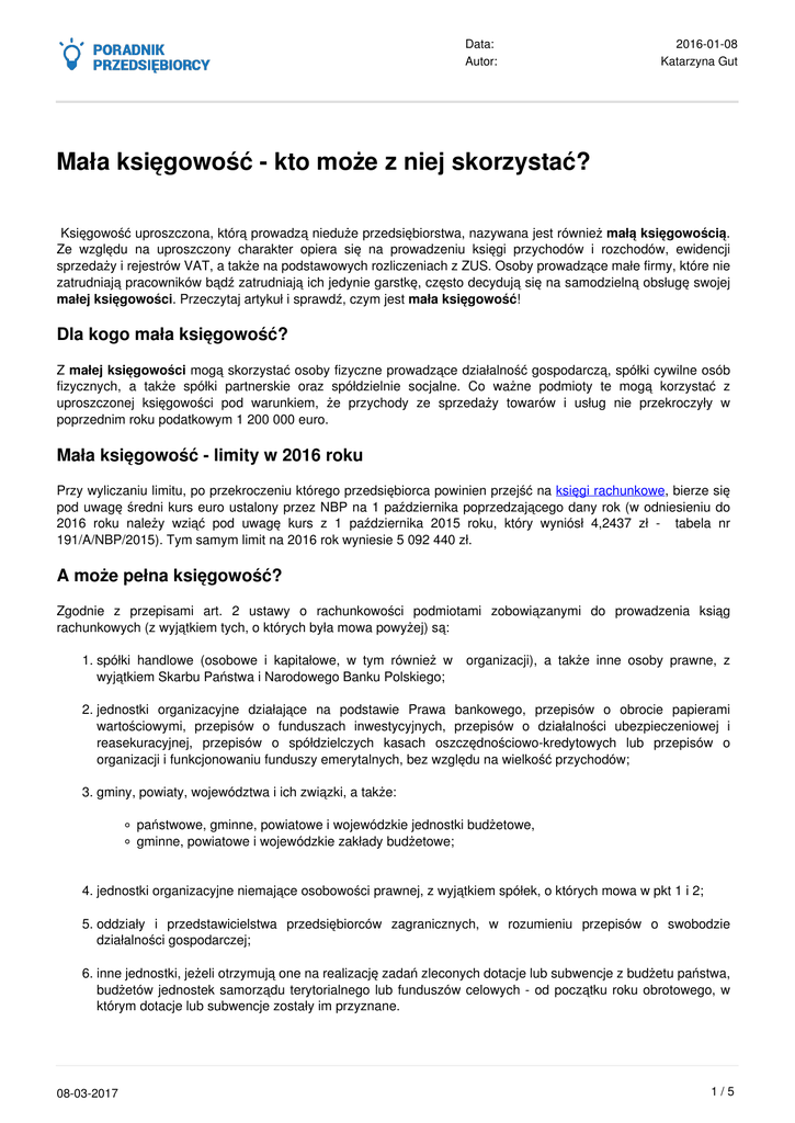 Data: Autor: 2016-01-08 Katarzyna Gut Mała księgowość - kto może z niej skorzystać? Księgowość uproszczona, którą prowadzą nieduże przedsiębiorstwa, nazywana jest również małą księgowością. Ze względu na uproszczony charakter opiera się na prowadzeniu księgi przychodów i rozchodów, ewidencji sprzedaży i rejestrów VAT, a także na podstawowych rozliczeniach z ZUS. Osoby prowadzące małe firmy, które nie zatrudniają pracowników bądź zatrudniają ich jedynie garstkę, często decydują się na samodzielną obsługę swojej małej księgowości. Przeczytaj artykuł i sprawdź, czym jest mała księgowość! Dla kogo mała księgowość? Z małej księgowości mogą skorzystać osoby fizyczne prowadzące działalność gospodarczą, spółki cywilne osób fizycznych, a także spółki partnerskie oraz spółdzielnie socjalne. Co ważne podmioty te mogą korzystać z uproszczonej księgowości pod warunkiem, że przychody ze sprzedaży towarów i usług nie przekroczyły w poprzednim roku podatkowym 1 200 000 euro. Mała księgowość - limity w 2016 roku Przy wyliczaniu limitu, po przekroczeniu którego przedsiębiorca powinien przejść na księgi rachunkowe, bierze się pod uwagę średni kurs euro ustalony przez NBP na 1 października poprzedzającego dany rok (w odniesieniu do 2016 roku należy wziąć pod uwagę kurs z 1 października 2015 roku, który wyniósł 4,2437 zł - tabela nr 191/A/NBP/2015). Tym samym limit na 2016 rok wyniesie 5 092 440 zł. A może pełna księgowość? Zgodnie z przepisami art. 2 ustawy o rachunkowości podmiotami zobowiązanymi do prowadzenia ksiąg rachunkowych (z wyjątkiem tych, o których była mowa powyżej) są: 1. spółki handlowe (osobowe i kapitałowe, w tym również w wyjątkiem Skarbu Państwa i Narodowego Banku Polskiego; organizacji), a także inne osoby prawne, z 2. jednostki organizacyjne działające na podstawie Prawa bankowego, przepisów o obrocie papierami wartościowymi, przepisów o funduszach inwestycyjnych, przepisów o działalności ubezpieczeniowej i reasekuracyjnej, przepisów o spółdzielczych kasach oszczędnościowo-kredytowych lub przepisów o organizacji i funkcjonowaniu funduszy emerytalnych, bez względu na wielkość przychodów; 3. gminy, powiaty, województwa i ich związki, a także: państwowe, gminne, powiatowe i wojewódzkie jednostki budżetowe, gminne, powiatowe i wojewódzkie zakłady budżetowe; 4. jednostki organizacyjne niemające osobowości prawnej, z wyjątkiem spółek, o których mowa w pkt 1 i 2; 5. oddziały i przedstawicielstwa przedsiębiorców zagranicznych, w rozumieniu przepisów o swobodzie działalności gospodarczej; 6. inne jednostki, jeżeli otrzymują one na realizację zadań zleconych dotacje lub subwencje z budżetu państwa, budżetów jednostek samorządu terytorialnego lub funduszów celowych - od początku roku obrotowego, w którym dotacje lub subwencje zostały im przyznane. 08-03-2017 1/5 Data: Autor: 2016-01-08 Katarzyna Gut Księga przychodów i rozchodów w małej księgowości Przedsiębiorcy, którzy zdecydowali się na prowadzenie księgi przychodów i rozchodów, rozliczają podatek uzależniony od wysokości poniesionych dochodów. Mogą oni opłacać go w formie liniowej (w wysokości 19%) lub na zasadach ogólnych (18% lub 32% w zależności od osiągniętego w danym roku podatkowym dochodu). Należy pamiętać, że KPiR powinna zostać założona na dzień prowadzenia działalności gospodarczej (lub na 1 stycznia danego roku podatkowego). Może być prowadzona zarówno w formie elektronicznej, jak i papierowej. W przypadku elektronicznej formy prowadzenia KPiR należy sporządzać wydruk komputerowy za poprzedni miesiąc w terminie do 20. dnia miesiąca. Koszty mogą być ujmowane na podstawie jednej z dwóch przyjętych metod: memoriałowej lub uproszczonej. Według memoriałowej metody rozliczania kosztów należy podzielić je na te bezpośrednio związane z przychodem osiągniętym w danym roku podatkowym oraz na koszty pośrednie. Te drugie obejmujące dwa lata podatkowe należy podzielić proporcjonalnie na lata których dotyczą. W przypadku metody uproszczonej koszt wykazuje się w dacie jego poniesienia. Mała księgowość - ryczałt ewidencjonowany Ryczałt od przychodów ewidencjonowanych stanowi formę opłacania podatku, na podstawie której podatek wylicza się jedynie od osiągniętych w danym okresie rozliczeniowym przychodów. Koszty w tej sytuacji nie są rozliczane. Z ryczałtu jednak nie mogą korzystać przedsiębiorcy, którzy prowadzą działalność w zakresie m.in: prowadzenia aptek, lombardów czy kantorów, udzielania pożyczek, wolnych zawodów (z wyjątkiem zawodu lekarza wszystkich specjalności, technika dentystycznego, felczera, położnej, pielęgniarki, tłumacza oraz nauczyciela w zakresie świadczenia usług edukacyjnych, polegających na udzielaniu lekcji na godziny), wytwarzania wyrobów opodatkowanych podatkiem akcyzowym (z wyjątkiem energii elektrycznej z odnawialnych źródeł energii). Wysokość stawki ryczałtu uzależniona jest od rodzaju prowadzonej działalności. Istnieje pięć stawek ryczałtu: 20%, 17%, 8,5%, 5,5% i 3%. Inne ewidencje księgowe w małej księgowości W niektórych przypadkach, uzależnionych od rodzaju prowadzonej działalności, przedsiębiorca powinien prowadzić dodatkowe ewidencje. Ewidencja środków trwałych i wartości niematerialnych i prawnych Przedsiębiorcy, którzy prowadzą KPiR w niektórych przypadkach dodatkowo są zobowiązani do prowadzenia wykazu środków trwałych i wartości niematerialnych i prawnych. Zgodnie z przepisami ustawy o PIT środkiem trwałym jest składnik majątku kompletny i zdatny do użytku, o przewidywanym okresie ekonomicznej użyteczności dłuższym niż rok, którego wartość początkowa przekracza 3500 zł. Składniki o wartości nieprzekraczającej kwoty 3500 zł mogą zostać ujęte bezpośrednio w kosztach podatkowyc