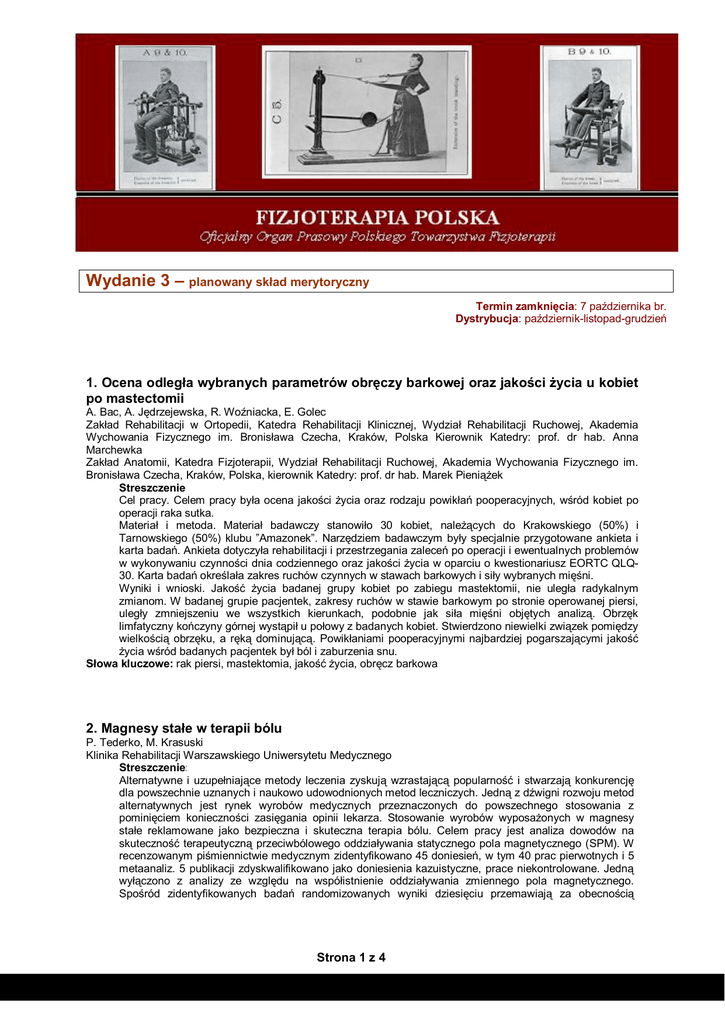 Wydanie 3 – planowany skład merytoryczny Termin zamknięcia: 7 października br. Dystrybucja: październik-listopad-grudzień 1. Ocena odległa wybranych parametrów obręczy barkowej oraz jakości życia u kobiet po mastectomii A. Bac, A. Jędrzejewska, R. Woźniacka, E. Golec Zakład Rehabilitacji w Ortopedii, Katedra Rehabilitacji Klinicznej, Wydział Rehabilitacji Ruchowej, Akademia Wychowania Fizycznego im. Bronisława Czecha, Kraków, Polska Kierownik Katedry: prof. dr hab. Anna Marchewka Zakład Anatomii, Katedra Fizjoterapii, Wydział Rehabilitacji Ruchowej, Akademia Wychowania Fizycznego im. Bronisława Czecha, Kraków, Polska, kierownik Katedry: prof. dr hab. Marek Pieniążek Streszczenie Cel pracy. Celem pracy była ocena jakości życia oraz rodzaju powikłań pooperacyjnych, wśród kobiet po operacji raka sutka. Materiał i metoda. Materiał badawczy stanowiło 30 kobiet, należących do Krakowskiego (50%) i Tarnowskiego (50%) klubu ”Amazonek”. Narzędziem badawczym były specjalnie przygotowane ankieta i karta badań. Ankieta dotyczyła rehabilitacji i przestrzegania zaleceń po operacji i ewentualnych problemów w wykonywaniu czynności dnia codziennego oraz jakości życia w oparciu o kwestionariusz EORTC QLQ30. Karta badań określała zakres ruchów czynnych w stawach barkowych i siły wybranych mięśni. Wyniki i wnioski. Jakość życia badanej grupy kobiet po zabiegu mastektomii, nie uległa radykalnym zmianom. W badanej grupie pacjentek, zakresy ruchów w stawie barkowym po stronie operowanej piersi, uległy zmniejszeniu we wszystkich kierunkach, podobnie jak siła mięśni objętych analizą. Obrzęk limfatyczny kończyny górnej wystąpił u połowy z badanych kobiet. Stwierdzono niewielki związek pomiędzy wielkością obrzęku, a ręką dominującą. Powikłaniami pooperacyjnymi najbardziej pogarszającymi jakość życia wśród badanych pacjentek był ból i zaburzenia snu. Słowa kluczowe: rak piersi, mastektomia, jakość życia, obręcz barkowa 2. Magnesy stałe w terapii bólu P. Tederko, M. Krasuski Klinika Rehabilitacji Warszawskiego Uniwersytetu Medycznego Streszczenie: Alternatywne i uzupełniające metody leczenia zyskują wzrastającą popularność i stwarzają konkurencję dla powszechnie uznanych i naukowo udowodnionych metod leczniczych. Jedną z dźwigni rozwoju metod alternatywnych jest rynek wyrobów medycznych przeznaczonych do powszechnego stosowania z pominięciem konieczności zasięgania opinii lekarza. Stosowanie wyrobów wyposażonych w magnesy stałe reklamowane jako bezpieczna i skuteczna terapia bólu. Celem pracy jest analiza dowodów na skuteczność terapeutyczną przeciwbólowego oddziaływania statycznego pola magnetycznego (SPM). W recenzowanym piśmiennictwie medycznym zidentyfikowano 45 doniesień, w tym 40 prac pierwotnych i 5 metaanaliz. 5 publikacji zdyskwalifikowano jako doniesienia kazuistyczne, prace niekontrolowane. Jedną wyłączono z analizy ze względu na współistnienie oddziaływania zmiennego pola magnetycznego. Spośród zidentyfikowanych badań randomizowanych wyniki dziesięciu przemawiają za obecnością Strona 1 z 4 korzystnego działania leczniczego urządzeń wyposażanych w magnesy stałe, ośmiu nie wykluczają możliwości istnienia takiego oddziaływania, zaś rezultaty z szesnastu publikacji wspierają tezę o braku przewagi SPM nad placebo. Wartość tych doniesień w sensie dowodu naukowego jest ograniczona ze względu na uchybienia w zaślepieniu próby, niską liczebność badanych grup, krótki czas obserwacji. Istotnym czynnikiem wpływających na obiektywność wniosków wydaje się również konflikt interesów wynikający ze sponsorowania badań przez wytwórców urządzeń. Efekt długotrwałej ekspozycji na SPM o indukcji zbliżonej do magnesów używanych w analizowanych urządzeniach był przedmiotem zbyt małej ilości badań, by ocenić bezpieczeństwo długotrwałego ich stosowania. Powszechnie przyjęte przeciwwskazania do stosowania wyrobów (ciąża, wiek niemowlęcy, obecność wszczepów elektronicznych, ferromagnetycznych, korzystanie z urządzeń elektronicznych wpływających na funkcje życiowe) wynika głownie z rozważań teoretycznych. Obecny stan wiedzy nie jest wystarczający dla jednoznacznego potwierdzenia skuteczności leczniczej SPM. Urządzenia do terapii z użyciem SPM nie powinny być wprowadzane na rynek jako wyroby przeznaczone do leczenia bólu bez udowodnienia ich skuteczności i bezpieczeństwa w każdym ze wskazań. Słowa kluczowe: Magnesy stałe – wyroby medyczne – ból - działanie przeciwbólowe 3. Obiektywna jakość życia i poziom satysfakcji życiowej osób chorujących na stwardnienie rozsiane T. Tasiemski, M. Koper, M.Miler Katedra Kultury Fizycznej Osób Niepełnosprawnych, Akademia Wychowania Fizycznego w Poznaniu; Kierownik Katedry: prof. dr hab. Stanisław Kowalik Streszczenie Wstęp. Przewlekły charakter schorzenia, towarzyszące mu liczne dolegliwości i nieprzewidywalne tempo pogarszania się stanu pacjenta negatywnie wpływają na jakość życia osób chorych na stwardnienie rozsiane (SM). Aby dokonać pełnej i rzetelnej oceny jakości życia pacjentów z SM należy uwzględniać jednocześnie jej obiektywny i subiektywny pomiar. Materiał i metody. W badaniach uczestniczyło 30 osób z SM i 60 osób zdrowych (OZ). Obiektywną jakość życia analizowano na podstawie czterech wskaźników: wykształcenia, zatrudnienia, wysokości dochodów, sposobu spędzania czasu wolnego. Do oceny subiektywnej jakości życia wykorzystano Kwestionariusz Satysfakcji Życiowej. Wyniki. W przypadku obiektywnych wyznaczników jakości życia odnotowano istotne zróżnicowanie pomiędzy badanymi grupami w zakresie zatrudnienia, dochodów i niektórych form spędzania czasu wolnego (czytanie książek, podróżowanie). Osoby z SM oceniły swoją ogólną sytuację życiową podobnie jak OZ, tj. jako raczej satysfakcjonującą. Dla osób z SM 