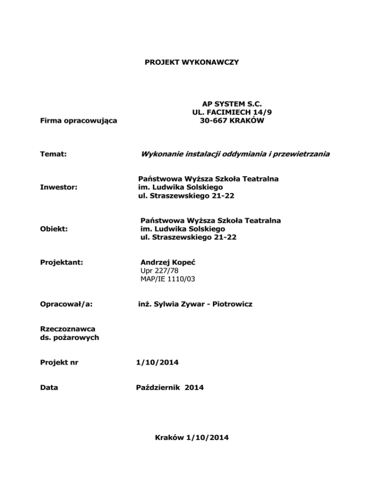 PROJEKT WYKONAWCZY AP SYSTEM S.C. UL. FACIMIECH 14/9 30-667 KRAKÓW Firma opracowująca Temat: Wykonanie instalacji oddymiania i przewietrzania Inwestor: Państwowa Wyższa Szkoła Teatralna im. Ludwika Solskiego ul. Straszewskiego 21-22 Obiekt: Państwowa Wyższa Szkoła Teatralna im. Ludwika Solskiego ul. Straszewskiego 21-22 Projektant: Opracował/a: Andrzej Kopeć Upr 227/78 MAP/IE 1110/03 inż. Sylwia Zywar - Piotrowicz Rzeczoznawca ds. pożarowych Projekt nr 1/10/2014 Data Październik 2014 Kraków 1/10/2014 Zawartość opracowania Oświadczenie projektanta …………………………………………………………………………………….………3 Uprawnienia 1. Dane ogólne ……………………………………………………………………………………………………………4 1.1. Podstawa prawna opracowania ………………………………………………………………………………4 1.2. Podstawa techniczna opracowania ………………………………………………………………………….4 1.3. Przedmiot i zakres opracowania ……………………………………………………………………………..5 2. Opis techniczny ……………………………………………………..…………………………………………….….5 2.1 Budynek Państwowej Wyższej Szkoły Teatralnej im. Ludwika Solskiego w Krakowie przy ul. Straszewskiego 21-22 ..………………………………………………………….…………..…..……..………5 2.1.1 Charakterystyka obiektu ……………………………………….……………………………………………..5 2.1.2 Wymagania w stosunku do materiałów i urządzeń ………………………………………………….5 2.1.3 Cel stosowania………………………………….. …………………………………….…………………………6 2.1.4 Instalacja oddymiania klatek schodowych …..……………………………………………….…….….6 2.1.4.1 Okna oddymiające ………………….………………………………………………………………….…....6 2.1.4.2 Instalacja elektryczna linii dozorowych i wykonawczych ……………………………....………6 2.1.4.3 Montaż urządzeń w liniach dozorowych ……………………………………………………….….….6 2.1.4.4 Montaż central oddymiania …………….………………………………………………………………….7 2.1.4.5 Sposób oddymiania klatek schodowych …….………..……………………………………….…..…7 3. Uwagi …………………………………………………………………………………………………….………..…....9 4. Zestawienie podstawowych materiałów……………………………………………………………….……10 5. Karty katalogowe …………………………………………………………………..…………..…………….……10 6. Certyfikaty i deklaracje.……………………….……………………………………………………………….…11 7. Spis rysunków ……………………………………………………………………………………………….………11 Projekt wykonawczy instalacji oddymiania i przewietrzania w Państwowej Wyższej Szkole Teatralnej im. Ludwika Solskiego w Krakowie przy ul. Straszewskiego 21-22 2 OŚWIADCZENIE PROJEKTANTA Oświadczam, że prace projektowe ujęte w niniejszym opracowaniu zostały wykonane zgodnie z Ustawą z 2000 roku - Prawo Budowlane (Dz.U. 2000 Nr 106 poz 1360 wraz z późniejszymi zmianami) warunkami technicznymi, obowiązującymi przepisami, Polskimi Normami. Równocześnie oświadczam, że dokumentacja projektowa jest wykonana zgodnie ze zleceniem i kompletna z punktu widzenia celu, któremu ma służyć. …………………………………… (Podpis projektanta) Projekt wykonawczy instalacji oddymiania i przewietrzania w Państwowej Wyższej Szkole Teatralnej im. Ludwika Solskiego w Krakowie przy ul. Straszewskiego 21-22 3 1. Dane ogólne 1.1 Podstawa prawna opracowania - Ustawa z dn. 24.08.1991 r. o ochronie przeciwpożarowej (Dz. U. Nr 81 z 1991 r. poz. 351 z późn. zm.), - Rozporządzenie Ministra Spraw Wewnętrznych i Administracji z dnia 07.06.2010 r. w sprawie ochrony przeciwpożarowej budynków, obiektów budowlanych i terenów (Dz.U. Nr 109 z 2010r. poz. 719), - Ustawa z dnia 7 lipca 1994 r. – Prawo budowlane (Dz.U. z 2003 r. Nr 207 poz. 2016 z późn. zm.), - Rozporządzenie Ministra Spraw Wewnętrznych i Administracji z dnia 16.06.2009 r. w sprawie uzgadniania projektu budowlanego pod względem ochrony przeciwpożarowej (Dz.U. Nr 121 z 2003 r. poz. 1137), - Rozporządzenie Ministra Infrastruktury z dnia 02.09.2004 r. w sprawie szczegółowego zakresu i formy dokumentacji projektowej, specyfikacji technicznych wykonania i odbioru robót budowlanych oraz programu funkcjonalnego-użytkowego (Dz.U. Nr 202 z 2004 r. poz. 2072), - Rozporządzenie Ministra Infrastruktury z dnia 12.04.2002 r. w sprawie warunków technicznych, jakim powinny odpowiadać budynki i ich usytuowanie. (Dz.U. Nr 75 z 2002 r. poz. 690 z pózn. zm.), - norma PN–B–02877–4 – Ochrona przeciwpożarowa budynków - Instalacje grawitacyjne do odprowadzania dymu i ciepła - Zasady projektowania, - Wytyczne projektowania i odbioru instalacji SAP opracowane przez inż. Ciszewskiego z CNBOP w Józefowie. 1.2 Podstawa techniczna opracowania: - uzgodnienia ze zleceniodawcą, karty katalogowe, normy i przepisy związane, podkłady budowlane. Projekt wykonawczy instalacji oddymiania i przewietrzania w Państwowej Wyższej Szkole Teatralnej im. Ludwika Solskiego w Krakowie przy ul. Straszewskiego 21-22 4 1.3 Przedmiot i zakres opracowania Przedmiotem niniejszego opracowania jest montaż instalacji oddymiania i przewietrzania 