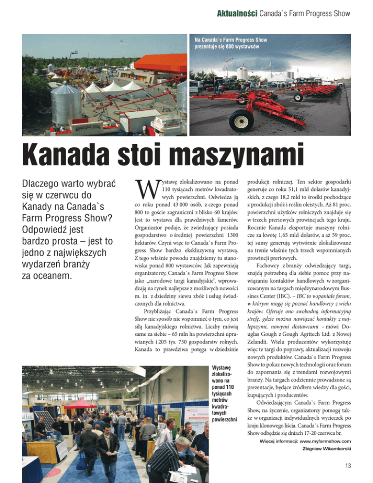 Aktualności Canada`s Farm Progress Show Na Canada`s Farm Progress Show prezentuje się 800 wystawców Kanada stoi maszynami Dlaczego warto wybrać się w czerwcu do Kanady na Canada`s Farm Progress Show? Odpowiedź jest bardzo prosta – jest to jedno z największych wydarzeń branży za oceanem. W ystawę zlokalizowano na ponad 110 tysiącach metrów kwadratowych powierzchni. Odwiedza ją co roku ponad 43 000 osób, z czego ponad 800 to goście zagraniczni z blisko 60 krajów. Jest to wystawa dla prawdziwych famerów. Organizator podaje, że zwiedzający posiada gospodarstwo o średniej powierzchni 1300 hektarów. Czyni więc to Canada`s Farm Progress Show bardzo ekskluzywną wystawą. Z tego właśnie powodu znajdziemy tu stanowiska ponad 800 wystawców. Jak zapewniają organizatorzy, Canada`s Farm Progress Show jako „narodowe targi kanadyjskie”, wprowadzają na rynek najlepsze z możliwych nowości m. in. z dziedziny siewu zbóż i usług świadczonych dla rolnictwa. Przybliżając Canada`s Farm Progress Show nie sposób nie wspomnieć o tym, co jest siłą kanadyjskiego rolnictwa. Liczby mówią same za siebie – 65 mln ha powierzchni uprawianych i 205 tys. 730 gospodarstw rolnych. Kanada to prawdziwa potęga w dziedzinie Wystawę zlokalizowano na ponad 110 tysiącach metrów kwadratowych powierzchni produkcji rolniczej. Ten sektor gospodarki generuje co roku 51,1 mld dolarów kanadyjskich, z czego 18,2 mld to środki pochodzące z produkcji zbóż i roślin oleistych. Aż 81 proc. powierzchni użytków rolniczych znajduje się w trzech preriowych prowincjach tego kraju. Rocznie Kanada eksportuje maszyny rolnicze za kwotę 1,65 mld dolarów, a aż 59 proc. tej sumy generują wytwórnie zlokalizowane na trenie właśnie tych trzech wspomnianych prowincji preriowych. Fachowcy z branży odwiedzający targi, znajdą potrzebną dla siebie pomoc przy nawiązaniu kontaktów handlowych w zorganizowanym na targach międzynarodowym Bussines Center (IBC). – IBC to wspaniałe forum, w którym mogą się poznać handlowcy z wielu krajów. Oferuje ono swobodną informacyjną strefę, gdzie można nawiązać kontakty z najlepszymi, nowymi dostawcami – mówi Douglas Gough z Gough Agritech Ltd. z Nowej Zelandii. Wielu producentów wykorzystuje więc te targi do poprawy, aktualizacji rozwoju nowych produktów. Canada`s Farm Progress Show to pokaz nowych technologii oraz forum do zapoznania się z trendami rozwojowymi branży. Na targach codziennie prowadzone są prezentacje, będące źródłem wiedzy dla gości, kupujących i producentów. Odwiedzającym Canada`s Farm Progress Show, na życzenie, organizatorzy pomogą także w organizacji indywidualnych wycieczek po kraju klonowego liścia. Canada`s Farm Progress Show odbędzie się dniach 17-20 czerwca br. Więcej informacji: www.myfarmshow.com Zbigniew Witamborski 13