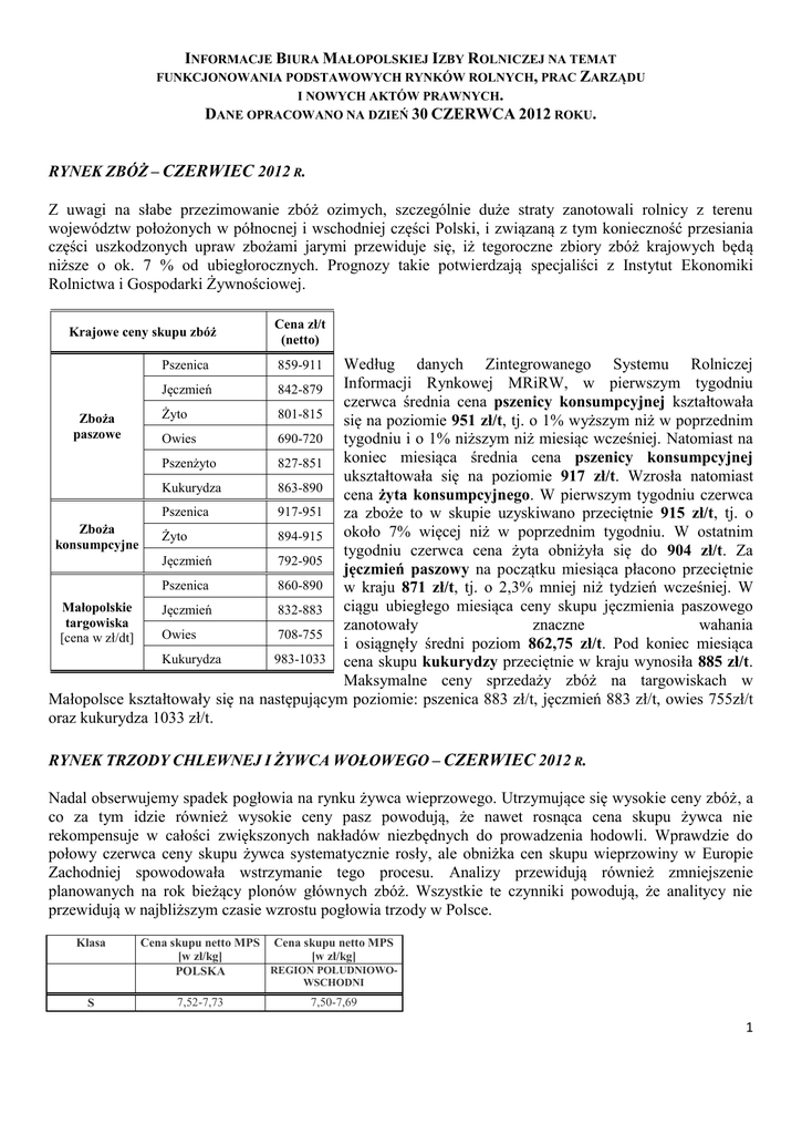 INFORMACJE BIURA MAŁOPOLSKIEJ IZBY ROLNICZEJ NA TEMAT FUNKCJONOWANIA PODSTAWOWYCH RYNKÓW ROLNYCH, PRAC ZARZĄDU I NOWYCH AKTÓW PRAWNYCH. DANE OPRACOWANO NA DZIEŃ 30 CZERWCA 2012 ROKU. RYNEK ZBÓŻ – CZERWIEC 2012 R. Z uwagi na słabe przezimowanie zbóż ozimych, szczególnie duże straty zanotowali rolnicy z terenu województw położonych w północnej i wschodniej części Polski, i związaną z tym konieczność przesiania części uszkodzonych upraw zbożami jarymi przewiduje się, iż tegoroczne zbiory zbóż krajowych będą niższe o ok. 7 % od ubiegłorocznych. Prognozy takie potwierdzają specjaliści z Instytut Ekonomiki Rolnictwa i Gospodarki Żywnościowej. Krajowe ceny skupu zbóż Cena zł/t (netto) Według danych Zintegrowanego Systemu Rolniczej Informacji Rynkowej MRiRW, w pierwszym tygodniu Jęczmień 842-879 czerwca średnia cena pszenicy konsumpcyjnej kształtowała Żyto 801-815 Zboża się na poziomie 951 zł/t, tj. o 1% wyższym niż w poprzednim paszowe Owies 690-720 tygodniu i o 1% niższym niż miesiąc wcześniej. Natomiast na koniec miesiąca średnia cena pszenicy konsumpcyjnej Pszenżyto 827-851 ukształtowała się na poziomie 917 zł/t. Wzrosła natomiast Kukurydza 863-890 cena żyta konsumpcyjnego. W pierwszym tygodniu czerwca Pszenica 917-951 za zboże to w skupie uzyskiwano przeciętnie 915 zł/t, tj. o Zboża około 7% więcej niż w poprzednim tygodniu. W ostatnim Żyto 894-915 konsumpcyjne tygodniu czerwca cena żyta obniżyła się do 904 zł/t. Za Jęczmień 792-905 jęczmień paszowy na początku miesiąca płacono przeciętnie Pszenica 860-890 w kraju 871 zł/t, tj. o 2,3% mniej niż tydzień wcześniej. W ciągu ubiegłego miesiąca ceny skupu jęczmienia paszowego Małopolskie Jęczmień 832-883 targowiska zanotowały znaczne wahania Owies 708-755 [cena w zł/dt] i osiągnęły średni poziom 862,75 zł/t. Pod koniec miesiąca Kukurydza 983-1033 cena skupu kukurydzy przeciętnie w kraju wynosiła 885 zł/t. Maksymalne ceny sprzedaży zbóż na targowiskach w Małopolsce kształtowały się na następującym poziomie: pszenica 883 zł/t, jęczmień 883 zł/t, owies 755zł/t oraz kukurydza 1033 zł/t. Pszenica 859-911 RYNEK TRZODY CHLEWNEJ I ŻYWCA WOŁOWEGO – CZERWIEC 2012 R. Nadal obserwujemy spadek pogłowia na rynku żywca wieprzowego. Utrzymujące się wysokie ceny zbóż, a co za tym idzie również wysokie ceny pasz powodują, że nawet rosnąca cena skupu żywca nie rekompensuje w całości zwiększonych nakładów niezbędnych do prowadzenia hodowli. Wprawdzie do połowy czerwca ceny skupu żywca systematycznie rosły, ale obniżka cen skupu wieprzowiny w Europie Zachodniej spowodowała wstrzymanie tego procesu. Analizy przewidują również zmniejszenie planowanych na rok bieżący plonów głównych zbóż. Wszystkie te czynniki powodują, że analitycy nie przewidują w najbliższym czasie wzrostu pogłowia trzody w Polsce. Klasa Cena skupu netto MPS Cena skupu netto MPS [w zł/kg] [w zł/kg] REGION POŁUDNIOWOPOLSKA WSCHODNI S 7,52-7,73 7,50-7,69 1 E 7,40-7,63 7,29-7,48 U 7,04-7,28 6,94-7,19 R 6,62-6,85 6,45-6,86 O P 6,32-6,46 5,38-5,88 5,97-6,16 5,90-6,40 Ceny skupowe żywca wieprzowego w regionie południowo-wschodnim nie odbiegały znacząco od średnich cen skupu w Polsce. Schłodzone mięso wieprzowe w klasie S osiągnęło w miesiącu czerwcu średnią cenę w wysokości 7,62 zł/kg, co stanowi wzrost cen o 6,2% w stosunku do miesiąca ubiegłego. Podobnie kształtowały się ceny mięsa z kolejnych klas jakości. Mięso w klasie E zdrożało o 6,52% osiągając średnią cenę 7,51 zł/kg, mięso w klasie U zdrożało o 6,94% osiągając średnią cenę 7,16 zł/kg, mięso w klasie R zdrożało o 7,41% osiągając średnią cenę 6,73 zł/kg, mięso w klasie O zdrożało o 7,84% osiągając średnią cenę 6,39 zł/kg, zaś mięso w klasie P zdrożało o 9,21% osiągając średnią cenę 5,63 zł/kg, Ceny żywca wołowego w handlu targowiskowym [zł/kg] Małopolska Kraj cielęta 60-100 kg 10,50 9,00-13,50 młode bydło opasowe 6,50 4,90-7,50 krowy wybrakowane 5,20 3,60-5,00 W miesiącu czerwcu ceny skupowe bydła przestały spadać. Z uwagi na nikłą podaż w II dekadzie czerwca zanotowano nieznaczny na razie wzrost cen skupu żywca. Sytuację utrudnia fakt podjęcia decyzji o zmniejszeniu dopłat eksportowych przez Unię Europejską i wprowadzenia wysokich ceł importowych przez Turcję. Według opinii skupujących większych wzrostów cen producenci powinni się spodziewać w lipcu br. Wyhamowanie tendencji spadkowych cen skupu bydła rzeźnego i powolny proces odbudowywania ceny rozpoczęty w II dekadzie miesiąca spowodował, że średnia cena skupowa byków do 2 lat wynosiła w czerwcu 6,95 zł/kg i była byki do 2 lat 6,80-7,10 niższa o 1,83% w stosunku do poprzedniego miesiąca. Podobnie wyglądała byki pow. 2 sytuacja w grupie zwierząt powyżej 2 lat. Średnia cena skupu wynosiła tu 6,69-7,03 lat bowiem 6,86 zł/kg i była niższa o 2,69% w stosunku do ubiegłego miesiąca. jałówki 6,31-6,33 Nieco lepiej udawało się tylko sprzedać hodowcom jałówki, których średnia krowy 5,19-5,34 cena wynosiła 6,32 zł/kg i praktycznie nie zmieniała swojej wartości w stosunku do ubiegłego miesiąca. Wzrosła nieco cena skupowa wybrakowanych krów, których średnia cena wyniosła 5,24 zł/kg i byłą wyższa o 1,35 % niż przed miesiącem. Ceny skupu netto w zakładach mięsnych wg w.ż. [zł/kg] Ceny prosiąt za parę na małopolskich targowiskach Zakliczyn Miechów Proszowice Wadowice Wolbrom 170 170 190 200 177 Według danych ZSRIR na koniec miesiąca czerwca na małopolskich targowiskach za prosięta uzyskiwano średnio ponad 184 zł za sztukę. Cena ta pozostała niezmienna od poprzedniego miesiąca. RYNEK OWOCÓW I WARZYW – CZERWIEC 2012 R. Niekorzystny przebieg warunków pogodowych oraz niskie temperatury opóźniły wegetację warzyw w miesiącu maju. Również pierwsza połowa czerwca nie napawała 