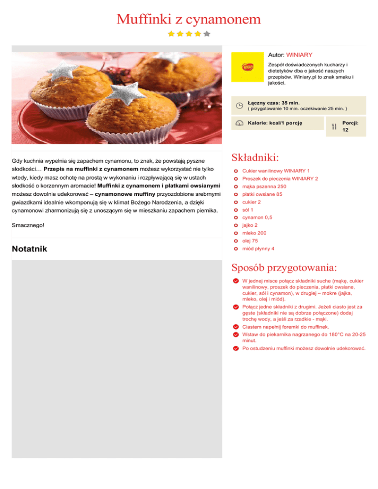 Muffinki z cynamonem Autor: WINIARY Zespół doświadczonych kucharzy i dietetyków dba o jakość naszych przepisów. Winiary.pl to znak smaku i jakości. Łączny czas: 35 min. ( przygotowanie 10 min. oczekiwanie 25 min. ) Kalorie: kcal/1 porcję Gdy kuchnia wypełnia się zapachem cynamonu, to znak, że powstają pyszne słodkości… Przepis na muffinki z cynamonem możesz wykorzystać nie tylko Porcji: 12 Składniki: Cukier wanilinowy WINIARY 1 wtedy, kiedy masz ochotę na prostą w wykonaniu i rozpływającą się w ustach słodkość o korzennym aromacie! Muffinki z cynamonem i płatkami owsianymi Proszek do pieczenia WINIARY 2 możesz dowolnie udekorować – cynamonowe muffiny przyozdobione srebrnymi płatki owsiane 85 gwiazdkami idealnie wkomponują się w klimat Bożego Narodzenia, a dzięki cynamonowi zharmonizują się z unoszącym się w mieszkaniu zapachem piernika. cukier 2 mąka pszenna 250 sól 1 cynamon 0,5 Smacznego! jajko 2 mleko 200 olej 75 Notatnik miód płynny 4 Sposób przygotowania: W jednej misce połącz składniki suche (mąkę, cukier wanilinowy, proszek do pieczenia, płatki owsiane, cukier, sól i cynamon), w drugiej – mokre (jajka, mleko, olej i miód). Połącz jedne składniki z drugimi. Jeżeli ciasto jest za gęste (składniki nie są dobrze połączone) dodaj trochę wody, a jeśli za rzadkie mąki. Ciastem napełnij foremki do muffinek. Wstaw do piekarnika nagrzanego do 180°C na 2025 minut. Po ostudzeniu muffinki możesz dowolnie udekorować.