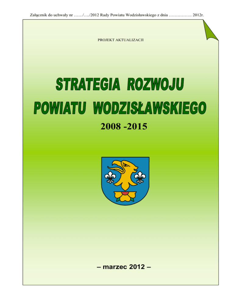 Załącznik do uchwały nr ……/…./2012 Rady Powiatu Wodzisławskiego z dnia ……………. 2012r. PROJEKT AKTUALIZACJI 2008 -2015 – marzec 2012 – Spis treści 1. METODOLOGIA TWORZENIA STRATEGII POWIATU ............................................ 5 1.1. Zakres i struktura strategii ......................................................................................... 6 1.2. Zadania i cele strategii ................................................................................................. 8 1.3. Procedura tworzenia strategii ..................................................................................... 9 2. STRATEGIA ROZWOJU POWIATU WODZISŁAWSKIEGO ....................................... 14 2.1. Podstawy strategii ...................................................................................................... 15 2.2. Wizja i misja powiatu wodzisławskiego ................................................................... 17 2.3. Obszary strategiczne .................................................................................................. 18 2.4. Cele strategiczne ......................................................................................................... 19 3. ZADANIA REALIZACYJNE W POSZCZEGÓLNYCH OBSZARACH STRATEGICZNYCH .......................................................................................................... 22 Powiat Wodzisławski POWIAT WODZISŁAWSKI MIEJSCEM LUDZI SPOKOJNYCH O SWOJĄ PRZYSZŁOŚĆ, MIEJSCEM BOGATYM W INWESTYCJE, Z ROZWINIĘTĄ TURYSTYKĄ, MINIMALNYM BEZROBOCIEM I BARDZO DOBRZE ROZWINIĘTYM SEKTOREM MSP OFEROWANIE WARUNKÓW GODNEGO ŻYCIA MIESZKAŃCOM ORAZ ROZWOJU SPOŁECZNO-GOSPODARCZEGO STR ATEGI A ROZWOJU POWI ATU WODZ ISŁ AW SKI EGO strona 4 Szanowni Państwo, Dzięki współpracy z Zakładem Badań Ekonomicznych i Społecznych Głównego Instytutu Górnictwa w Katowicach 25 czerwca 2001 roku Rada Powiatu Wodzisławskiego przyjęła Strategię Rozwoju Powiatu Wodzisławskiego. Z uwagi, iż strategia powinna być z upływem czasu weryfikowana podjęte zostały działania aktualizujące cele strategiczne oraz zadania realizacyjne w danych obszarach strategicznych. Funkcjonowanie Powiatu w nowej rzeczywistości Wspólnoty Europejskiej wymaga odniesienia strategii rozwoju do strategicznych zapisów zawartych w dokumentach obowiązujących państwa należące do Unii Europejskiej. Mamy nadzieję, że dokument ten pozwoli nam kontynuować proces integracji lokalnej i rozwoju społeczno – gospodarczego naszego powiatu. Zarząd Powiatu Wodzisławskiego STR ATEGI A ROZWOJU POWI ATU WODZ ISŁ AW SKI EGO 1. METODOLOGIA TWORZENIA STRATEGII POWIATU strona 5 STR ATEGI A ROZWOJU POWI ATU WODZ ISŁ AW SKI EGO strona 6 1.1. ZAKRES I STRUKTURA STRATEGII Przedstawiona strategia nie jest jedynie dokumentem obligującym lokalne władze samorządowe. Jest to program rozwoju całej społeczności lokalnej, w którym „aktorami” społecznymi i instytucjonalnymi oprócz samorządu są partnerzy społeczni. Program ten powinien aktywnie wpisywać się w koncepcję rozwoju subregionu i województwa, preferując przede wszystkim działania ukierunkowane na społeczność lokalną. Szczególny charakter ma strategia tworzona dla powiatu. Powiat oprócz zadań wynikających z zapisów prawnych, powinien przejmować również szereg funkcji programujących, koordynujących i inicjujących działania w szerszym wymiarze. Przyjmuje się, że prace prowadzone w ramach szeroko rozumianej Strategii powinny być dalej kontynuowane w postaci budowy odpowiednich programów, w których należy określać siły i środki potrzebne do ich realizacji, terminy graniczne oraz kryteria oceny skuteczności i efektywności działań. Punktem odniesienia do budowy tych Programów powinny być zapisy w zatwierdzonej przez Radę Powiatu Strategii. STRATEGIA ROZWOJU POWIATU oznacza koncepcję funkcjonowania w dłuższym okresie czasu, tj. w perspektywie do 2015 roku. Zawiera ona główne cele rozwojowe powiatu, konkretne zadania wraz z jednostkami odpowiedzialnymi za ich realizację. Strategia koncentruje się na podstawowych i najważniejszych problemach powiatu, warunkujących jego rozwój społeczny i gospodarczy (rys. 1). STR ATEGI A ROZWOJU POWI ATU WODZ ISŁ AW SKI EGO Rysunek 1. strona 7 System programowania rozwoju na szczeblu powiatu. Strategia Rozwoju Powiatu Plany i programy realizacyjne Budżet STRATEGIA POWIATU – ROZWOJU to koncepcja systemowego działania władz i partnerów społecznych, która polega na: formułowaniu zbioru perspektywicznych celów rozwojowych i ich modyfikacji w zależności od zmieniających się uwarunkowań zewnętrznych i wewnętrznych, określaniu potrzebnych zasobów ludzkich, rzeczowych, finansowych i naturalnych, niezbędnych do realizacji przyjętych celów, określaniu sposobów postępowania (reguł działania, dyrektyw) zapewniających realizację przyjętych perspektywicznych celów rozwojowych oraz optymalne wykorzystanie i rozmieszczenie przestrzenne zasobów. STRATEGIA ROZWOJU powinna dać odpowiedź na pytanie: CO NALEŻY ZROBIĆ, aby powiat funkcjonował i rozwijał się w przyszłości w celu optymalnego zaspokojenia zbiorowych potrzeb lokalnej społeczności ? STR ATEGI A ROZWOJU POWI ATU WODZ ISŁ AW SKI EGO strona 8 1.2. ZADANIA I CELE STRATEGII ZADANIEM STRATEGII JEST STWORZENIE PODSTAW DO: sprawnego, skutecznego i efektywnego zarządzania powiatem przez jego władze, tak w dłuższym, jak i w krótkim horyzoncie czasu, w tym koordynowania i zapewnienia zgodności działań bieżących z perspektywicznymi, przygotowania władz samorządowych do działań w sytuacji niepewności i ryzyka, wynikających ze zmieniających się uwarunkowań rozwojowych, stwarzania warunków do przełamywania barier rozwojowych, pozyskiwania przez Powiat środków finansowych ze źródeł zewnętrznych na realizację przewidzianych w strategii zadań, pozyskiwania funduszy na działania objęte in