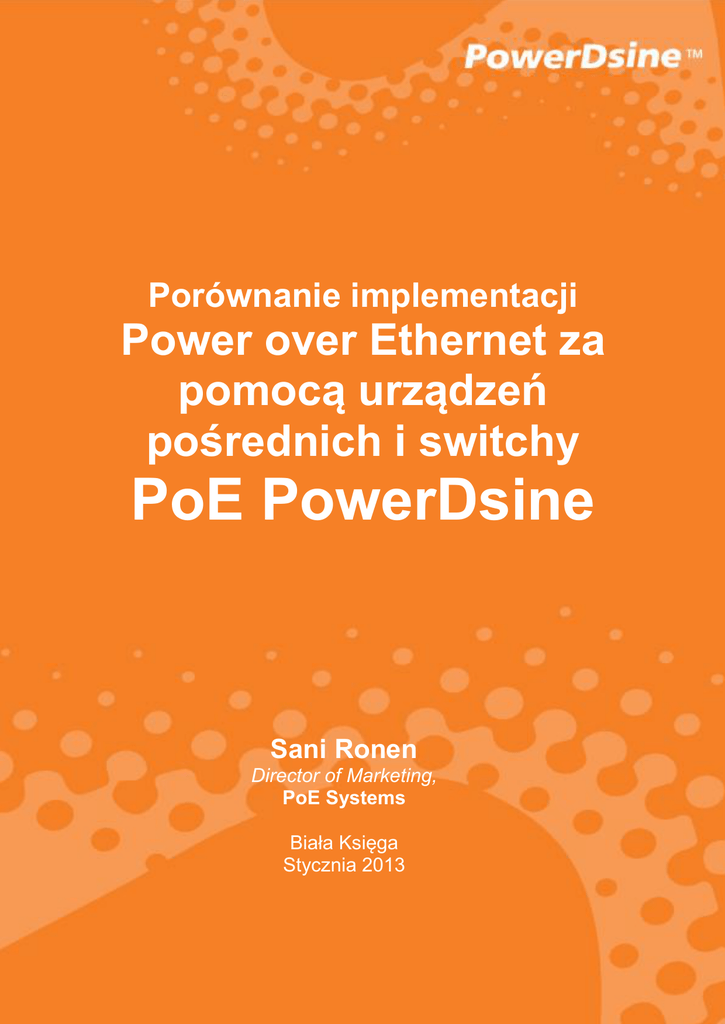 Porównanie implementacji Power over Ethernet za pomocą urządzeń pośrednich i switchy PoE PowerDsine Sani Ronen Director of Marketing, PoE Systems Biała Księga Stycznia 2013 Porównanie implementacji Power over Ethernet za pomocą urządzeń pośrednich i switchy PoE Wprowadzenie Istnieją dwie metody implementacji najnowszej technologii PoE dużej mocy. Pierwsza sprowadza się do wymiany istniejących switchy ethernetowych na nowsze, wspierające PoE. Druga polega na instalacji urządzeń pośrednich - injektorów PoE, określanych również angielskim mianem “midspans”, które uzupełniają obecną instalację o napięcie zasilające. Zaletą switchy PoE jest fakt, że są to urządzenia zintegrowane, które podłączane są pojedynczymi kablami sieciowymi. Jednakże, wcale nie musi być to najlepsze rozwiązanie. O ile w danym przypadku, ich ograniczona przepustowość i wydajność nie stanowią powodu do wymiany switchy na nowsze, pośrednie urządzenia PoE będą lepszym wyborem. Są one nie tylko prostsze w podłączeniu, zarządzaniu i utrzymaniu, ale też pozwalają bardziej elastycznie, niezawodnie, bezpiecznie i energooszczędnie rozbudować sieć o funkcję PoE. Urządzenia pośrednie nie wymagają wymiany istniejących switchy ani okablowania i są generalnie kompatybilne z dowolnymi switchami ethernetowymi. Urządzanie te są instalowane pomiędzy switch i zasilane urządzenia, tak jak to przedstawiono na rysunku 1. Rys. 1. Urządzenia pośrednie PoE są instalowane pomiędzy switch ethernetowy, a urządzenia sieciowe. Dzięki rozdzieleniu infrastruktury danych od zasilającej za pomocą urządzeń pośrednich możliwe jest zoptymalizowanie topologii sieci i dostosowywanie jej do zmieniających się wymagań. Jeśli zajdzie PoE Systems Zycko Polska Sp. z o.o. Autoryzowany Dystrybutor PowerDsine w Polsce ul. Zagaje 71/1, 30-437 Kraków E: [email protected] W:pl.zycko.com T: +48 12 262 55 99 Porównanie implementacji Power over Ethernet za pomocą urządzeń pośrednich i switchy PoE potrzeba dostarczenia większej mocy zasilania, procedurę wymiany komponentów zasilających można przeprowadzić niezależnie od switchy. Tak samo dzieje się w przypadku, gdy konieczna jest wymiana switcha – wtedy nie trzeba już przejmować się zapewnieniem odpowiedniego zasilania urządzeniom PoE. Urządzenia pośrednie typu „midspans” wspierają też mechanizm łączenia ich obudów i zapewniają łatwiejszą skalowalność instalacji. Firmy mogą rozbudowywać swoją sieć o moduły wyposażone w 1, 4, 6, 12 lub 24 porty. Dla porównania, tworząc nowe instalacje w oparciu o switche z funkcją PoE zaleca się, by tak wiele portów w szafie rackowej, jak to tylko możliwe pozwalało na zasilanie podłączanych do nich urządzeń, aby w przyszłości umożliwić rozwój sieci. Na rysunku 2 zilustrowano, jak urządzenia pośrednie rozdzielają dane od linii zasilania w aplikacji systemu bezpieczeństwa. Rys. 2. Urządzenia pośrednie rozdzielają infrastrukturę odpowiedzialną za przesyłanie danych od linii zasilającej. Ta elastyczność jest szczególnie ważna dla firm, które nie mogą pozwolić sobie na wymianę całego switcha ethernetowego na model wspierający PoE. Jeśli ich obecny switch nie jest przestarzały, albo potrzebne jest jedynie kilka portów z funkcją PoE, zakup całego, nowego switcha będzie nieuzasadniony. Swoboda konfiguracji, jaką zapewniają urządzenia pośrednie wynika też z ich dodatkowych cech. Injektory PoE zawierają gigabitowe interfejsy ethernetowe, dzięki czemu pozwalają na sprawną pracę PoE Systems Zycko Polska Sp. z o.o. Autoryzowany Dystrybutor PowerDsine w Polsce ul. Zagaje 71/1, 30-437 Kraków E: [email protected] W:pl.zycko.com T: +48 12 262 55 99 Porównanie implementacji Power over Ethernet za pomocą urządzeń pośrednich i switchy PoE kamer ethernetowych i stacji roboczych intensywnie korzystających z sieci. Injektory mogą mieć wbudowane wejścia stałoprądowe, które pozwalają na podłączanie zewnętrznych zasilaczy do zwiększenia możliwej do dostarczenia mocy lub do zapewnienia redundancji. W efekcie, urządzenia pośrednie mogą czerpać energię do zasilania urządzeń sieciowych ze źródeł prądu przemiennego, stałego, a nawet z innych injektorów. W tym ostatnim przypadku, poszczególne urządzenia pośrednie współpracują ze sobą, tak by zapewnić jak największą niezawodność instalacji. Po zakończeniu instalacji, infrastruktura PoE oparta o urządzenia pośrednie jest także bezpieczniejsza i łatwiejsza w zarządzaniu i utrzymaniu. Poziom bezpieczeństwa zostaje podniesiony dzięki temu, że injektory potrafią wykrywać i automatycznie odłączać urządzenia sieciowe niekompatybilne z PoE w przypadku wystąpienia przeładowania, zwarcia lub problemu z dostarczeniem wystarczającej ilości prądu. Injektory umożliwiają również zdalne zarządzanie mocą z uwzględnieniem harmonogramów i monitorowania systemu UPS. Administrator może też podglądać stan zasilania sieci z użyciem interfejsu WWW. Wsparcie dla adresowania zgodnego z protokołem IPv4 i IPv4/6 ułatwia zadania administracyjne. Zdalne zarządzanie mocą ma tym większe znaczenie, im większy jest rozmiar i złożoność sieci. Wadliwie działające urządzenia mogą być zdalnie resetowane, co pozwala uniknąć kosztownego wzywania obsługi na miejsce. Administratorzy sieci mogą centralnie kontrolować infrastrukturę rozmieszczoną w wielu miejscach, czy w różnych budynkach i błyskawicznie wzywać pomoc, gdy zajdzie taka potrzeba. Jeśli urządzenie pośrednie jest zintegrowane z systemem UPS, możliwe jest odcinanie zasilania do portów sieciowych o niskim priorytecie w sytuacji, gdy nastąpi przerwa w dostawie prądu sieciowego. Oczywiście, zdalne zarządzanie mocą musi być przeprowadzane w bezpieczny sposób. Z tego powodu zaleca się stosowanie protokołu SNMPv3, by zapobiec niepowołanym osobom dostępu do kontro