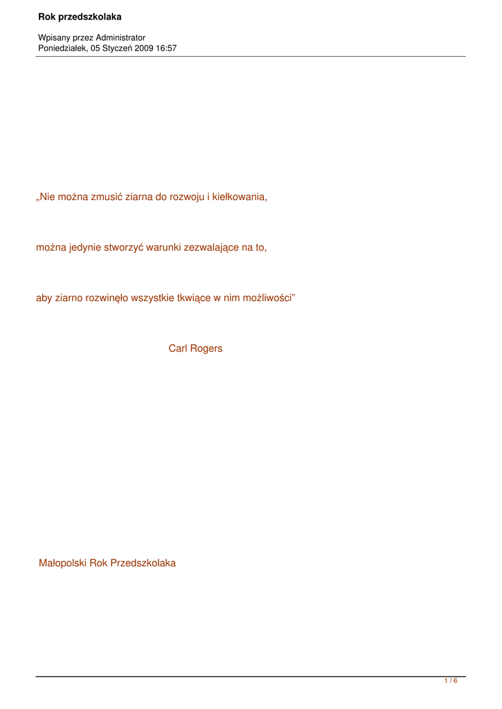 Rok przedszkolaka Wpisany przez Administrator Poniedziałek, 05 Styczeń 2009 16:57 „Nie można zmusić ziarna do rozwoju i kiełkowania, można jedynie stworzyć warunki zezwalające na to, aby ziarno rozwinęło wszystkie tkwiące w nim możliwości” Carl Rogers Małopolski Rok Przedszkolaka 1/6 Rok przedszkolaka Wpisany przez Administrator Poniedziałek, 05 Styczeń 2009 16:57 Program jest skierowany do dzieci w wieku od 3 do 6 lat, ich rodziców oraz nauczycieli przedszkoli publicznych, niepublicznych i innych form wychowania przedszkolnego. I. Organizator: Małopolski Kurator Oświaty. Instytucje wspomagające: Wojewoda Małopolski, Prezydenci, Burmistrzowie i Wójtowie, Akademia Pedagogiczna, Uniwersytet Jagielloński, Wyższa Szkoła Filozoficzno-Pedagogiczna Ignatianum, Małopolskie Centrum Doskonalenia Nauczycieli, Instytucje Kultury, Stowarzyszenie Lekarzy Pediatrów, Centrum Edukacyjne Bliżej Przedszkola, Przedszkola i Szkoły Podstawowe, Poradnie Psychologiczno - Pedagogiczne, Młodzieżowe Domy Kultury. II. Patronaty: MEN,TVP, Radio Kraków, prasa regionalna i lokalna, Rzecznik Praw Dziecka. III. Proponowane działania dla organów prowadzących i rodziców. 1. „Miejsce dziecka w edukacji” - prowadzenie kampanii informacyjnej w miastach i gminach województwa małopolskiego – październik 2008 roku - czerwiec 2009 roku /audycje, spoty reklamowe, artykuły w prasie regionalnej i czasopismach pedagogicznych, plakaty opracowane przez przedszkola i szkoły podstawowe, strony internetowe urzędów miast i gmin, strona www czasopisma „Bliżej Przedszkola”/. 2. Prezentacje działań i osiągnięć związanych z upowszechnianiem wychowania przedszkolnego na terenie gmin i powiatów . 2/6 Rok przedszkolaka Wpisany przez Administrator Poniedziałek, 05 Styczeń 2009 16:57 3. „Miejsce małego dziecka w edukacji” - konferencja naukowa przy współpracy z wyższymi uczelniami z udziałem przedstawicieli JST – luty 2009 roku. 4. Ogólnopolskie Forum Wychowania Przedszkolnego – finał i wręczenie nagród im. Marii Weryho organizowana przez Centrum Edukacji Bliżej Przedszkola w dniach 2 - 3 kwietnia 2009 roku . 5. Dyskusja panelowa z udziałem nauczycieli, dyrektorów, rodziców, psychologów: „Jak z przedszkolaka zrobić pierwszaka” – tworzenie pomostu między przedszkolem a szkołą - maj 2009 roku. 6. Małopolski Festiwal dziecięcy – Święto przedszkolaków /imprezy organizowane w każdej gminie - 5 czerwca 2009 roku/. IV. Proponowane działania dla dzieci: 1. Spotkania ze sztuką /muzea, teatry, Filharmonia, MDK, biblioteki, twórcy regionalni – od października 2008 roku do maja 2009 roku. 2. Przegląd Małych Form Scenicznych pod nazwą: „Kto Ty jesteś - Polak Mały”. Ogłoszenie konkursu w listopadzie 2008 roku, finał w Teatrze Groteska – marzec 2009 roku. Prezentacja 3/6 Rok przedszkolaka Wpisany przez Administrator Poniedziałek, 05 Styczeń 2009 16:57 zwycięzcy podczas Ogólnopolskiego Forum Wychowania Przedszkolnego. 3. Gminne konkursy plastyczne dla dzieci 5 - 6 letnich „Moje przedszkole”; ogłoszenie konkursów: luty 2009 roku, finał – 5 czerwca 2009 roku. V. Proponowane działania dla nauczycieli przedszkoli i oddziałów przedszkolnych oraz innych form wychowania przedszkolnego: 1. Konkurs dla nauczycieli wychowania przedszkolnego na Projekt działań edukacyjnych wspomagających rozwój dziecka 2,5-letniego. Ogłoszenie konkursu w listopadzie 2008 roku przez MCDN, rozstrzygnięcie w lutym 2009 roku. 2. Konkurs na film psychoedukacyjny dla rodziców „Zaspakajanie potrzeb dziecka”. Ogłos zenie konkursu w styczniu 2009 roku, finał w czerwcu 2009 roku. Prezentacja nagrodzonego filmu podczas konferencji podsumowującej realizację programu. 3. Szkolenia i warsztaty dla dyrektorów szkół podstawowych prowadzących oddziały przedszkolne: od października 2008 roku do maja 2009 roku. 4. Szkolenia i warsztaty dla nauczycieli i rodziców „Bezpieczne, przyjazne miejsce zabawy i wypoczynku dzieci” – od listopada 2008 r. do maja 2009 r. 4/6 Rok przedszkolaka Wpisany przez Administrator Poniedziałek, 05 Styczeń 2009 16:57 VI. Proponowane działania dla przedszkoli i oddziałów przedszkolnych: 1. Opracowanie projektów działań związanych z Rokiem Przedszkolaka. 2. „Przedszkole - dobry start Twojego dziecka” – warsztaty, szkolenia opracowywanie i upowszechnienia materiałów dla rodziców . 3. Tworzenie warunków środowiskowych do optymalnego rozwoju dziecka. 4. Promocja dobrej praktyki - zainicjowanie Zespołów Samokształceniowych Nauczycieli Wychowania Przedszkolnego i Kształcenia Zintegrowanego. Konferencja podsumowująca realizację programu – czerwiec 2009 roku. 5/6 Rok przedszkolaka Wpisany przez Administrator Poniedziałek, 05 Styczeń 2009 16:57 Małopolski Kurator Oświaty Artur Dzigański 6/6
