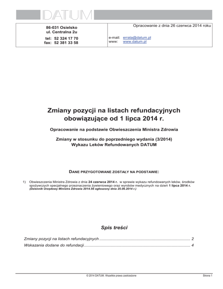 Opracowanie z dnia 26 czerwca 2014 roku 86-031 Osielsko ul. Centralna 2u tel: 52 324 17 70 fax: 52 381 33 58 e-mail: [email protected] www: www.datum.pl Zmiany pozycji na listach refundacyjnych obowiązujące od 1 lipca 2014 r. Opracowanie na podstawie Obwieszczenia Ministra Zdrowia Zmiany w stosunku do poprzedniego wydania (3/2014) Wykazu Leków Refundowanych DATUM DANE PRZYGOTOWANE ZOSTAŁY NA PODSTAWIE: 1) Obwieszczenia Ministra Zdrowia z dnia 24 czerwca 2014 r. w sprawie wykazu refundowanych leków, środków spożywczych specjalnego przeznaczenia żywieniowego oraz wyrobów medycznych na dzień 1 lipca 2014 r. (Dziennik Urzędowy Ministra Zdrowia 2014.56 ogłoszony dnia 25.06.2014 r.) Spis treści Zmiany pozycji na listach refundacyjnych .............................................................................. 2 Wskazania dodane do refundacji ........................................................................................... 4 © 2014 DATUM. Wszelkie prawa zastrzeżone Strona 1 Zmiany pozycji na listach refundacyjnych obowiązujące od 1 lipca 2014 r. Zmiany w stosunku do poprzedniego wydania (3/2014) Wykazu Leków Refundowanych DATUM UWAGA: W poniższym wykazie zmian, w nawiasie (przy wielkości opakowania), umieszczony został kod EAN danej pozycji. Prosimy, aby państwo zwrócili na to uwagę - szczególnie przy pozycjach wykazanych jako usunięte z list. Zdarza się, że z list leków usunięte zostają określone pozycje, a inne o tej samej nazwie, posiadające inny kod EAN (najczęściej również inne opakowanie), pozostają na listach refundacyjnych. Pozycje dopisane do list refundacyjnych Odp. Nazwa, postać i dawka (opakowanie, kod EAN) Wskazanie 30% Agen 10 tabl. 10mg(60 tabl. 5909991067540) wzw+wsk212 30% Agen 5 tabl. 5mg(60 tabl. 5909991067533) wzw+wsk212 30% Aledronic Acid Genoptim tabl.70mg(4 tabl. 5909990675302) Osteopor. 30% Allevyn Life Heel opatr.specj. rozm.25x25.2cm(545cm2)(1 szt. 5000223482503) Owrzodzen. 0% Allevyn Life Heel opatr.specj. rozm.25x25.2cm(545cm2)(1 szt. 5000223482503) Epider.bul 30% Allevyn Life opatr.specj. rozm.10,3x10,3cm(93cm2)(1 szt. 5000223477981) Owrzodzen. 0% Allevyn Life opatr.specj. rozm.10,3x10,3cm(93cm2)(1 szt. 5000223477981) Epider.bul 30% Allevyn Life opatr.specj. rozm.12,9x12,9cm(146cm2)(1 szt. 5000223478018) Owrzodzen. 0% Allevyn Life opatr.specj. rozm.12,9x12,9cm(146cm2)(1 szt. 5000223478018) Epider.bul 30% Allevyn Life opatr.specj. rozm.15,4x15,4cm(211cm2)(1 szt. 5000223478049) Owrzodzen. 0% Allevyn Life opatr.specj. rozm.15,4x15,4cm(211cm2)(1 szt. 5000223478049) Epider.bul 30% Allevyn Life opatr.specj. rozm.21x21cm(392cm2)(1 szt. 5000223478070) Owrzodzen. 0% Allevyn Life opatr.specj. rozm.21x21cm(392cm2)(1 szt. 5000223478070) Epider.bul 30% Allevyn Life Sacrum opatr.specj. rozm.17,2x17,5cm(235cm2) (1 szt. 5000223481421) Owrzodzen. 0% Allevyn Life Sacrum opatr.specj. rozm.17,2x17,5cm(235cm2) (1 szt. 5000223481421) Epider.bul 30% Allevyn Life Sacrum opatr.specj. rozm.21,6x23cm(386cm2) (1 szt. 5000223481452) Owrzodzen. 0% Allevyn Life Sacrum opatr.specj. rozm.21,6x23cm(386cm2)(1 szt. 5000223481452) Epider.bul 30% Amlodipine Aurobindo tabl. 5mg(30 szt. 5909990954254) wzw 30% Amlodipine Aurobindo tabl.10mg(30 szt. 5909990955008) wzw 30% Amlopin 10 tabl.10mg(30 tabl. 5909997218090) wzw 30% Amlopin 5 tabl. 5mg(30 tabl. 5909997218113) wzw 30% Atorvagen tabl.powl.10mg(30 tabl. 5909990938841) wzw 30% Atorvagen tabl.powl.20mg(30 tabl. 5909990938926) wzw 30% Atorvagen tabl.powl.40mg(30 tabl. 5909990938995) wzw 50% Auglavin pr.zaw.doust.400+57mg/5ml(35ml (but.) 5909991050443, 70ml (but.) 5909991050467, 140ml (but.) 5909991050665) wzw 50% Auglavin tabl.powl.500+125mg(14 tabl. 5909990815623) wzw 50% Auglavin tabl.powl.875+125mg(14 tabl. 5909990815883) wzw 50% Augmentin tabl.powl. 875mg+125mg(14 tabl. 5909997230740) wzw 50% AzitroLEK 250 tabl.powl.250mg(6 tabl. 5909997223537) wzw 50% AzitroLEK 500 tabl.powl.500mg(3 tabl. 5909997223551) wzw 50% Ceclor gran.zaw.250mg/5ml(1 fl. 100 ml 5909997203836) wzw 50% Cefuroxime Aurobindo tabl.250mg(10 tabl. 5909990934058) wzw 50% Cefuroxime Aurobindo tabl.500mg(10 tabl. 5909990934171) wzw 50% Cefuroximum 123ratio tabl.powl.250g(10 tabl. 5909990785643) wzw 50% Cefuroximum 123ratio tabl.powl.500mg(10 tabl. 5909990785674) wzw 30% Cera-Chek 1 Code test paskowy(50 pasków 8809242521845) Cukrzyca R Cera-Chek 1 Code test paskowy(50 pasków 8809242521845) Cuk.typ1 50% Cetrotide rozt.wstrz.0,25mg(1 fiol.+1 amp.-strz. 5909990488926) wsk231 30% Co-Valsacor tabl.powl.160+12,5mg(90 tabl. 5909990740260) wzw 30% Co-Valsacor tabl.powl.160+25mg(90 tabl. 5909990740291) wzw 30% Co-Valsacor tabl.powl.80+12,5mg(98 tabl. 5909990740239) wzw R Daneb tabl.5mg(28 tabl. 5909990750290) wzw 0% Decaldol inj. 50mg/ml(5 amp.1ml 5909990077311) Ch.psych. 30% Defur kaps.tw.prz.uw.4mg(28 tabl. 5909991055271) Ze.p.nadre 50% Dermovate rozt.skór.0,5mg/ml(25 ml 5909997201375) wzw R Desinobon konc.sp.inf.4mg/5ml(1 fiol. (5 ml) 5909991009250) wzw 30% Doreta tabl.powl.37,5+325mg(60 tabl. 5909990735167) wzw 0% Doreta tabl.powl.37,5+325mg(60 tabl. 5909990735167) Nowotwory 30% Doreta tabl.powl.75+650mg(60 tabl. 5909990936595) wzw 0% Doreta tabl.powl.75+650mg(60 tabl. 5909990936595) Nowotwory 30% Eliquis tabl.powl.2,5mg(20 tabl. 5909990861040) Żyl.p.zakA R Elonva rozt.wstrz.100mcg(1 amp.-strz. 5909997077482) wsk233 R Elonva rozt.wstrz.150mcg(1 amp.-strz. 5909997077499) wsk233 30% Evertas system transdermalnyplaster 4,6mg/24h(30 szt. 5909991078386) Ch.Alzhei. 30% Evertas system transdermalnyplaster 9,5mg/24h(30 szt. 5909991078454) Ch.Alzhei. R Fayton konc.roz.inf.4mg/5ml(1 fiol. (5ml) 5909991016197) wzw R Fayton rozt.inf.4mg/100mg(1 fiol. (100 ml) 5909991078577) wzw 50% Fluconazole Aurobindo kaps.tw. 50mg(7 szt. 5909990912346, 14 szt. 5909990912360) wzw 50% Fluconazole Aurobindo kaps.tw.100mg(7 szt. 5909990912896, 28 szt. 5909990912988) wzw 50% Fluconazole Aurobindo kaps.tw.200mg(7 szt. 5909990913466) wzw R Fostimon pr.roz.wstrz.75 j.m.(1
