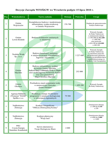 Decyzje Zarządu WFOŚiGW we Wrocławiu podjęte 15 lipca 2010 r. Poz. Wnioskodawca Nazwa zadania Dotacja 1 Gmina Wojcieszów Kompleksowa budowa i modernizacja infrastruktury wodno-ściekowej w Gminie Wojcieszów 376 700 Pożyczka Uwagi Dopłata do oprocentowania kredytu bankowego Budowa kolektorów sanitarnych w Jeleniowie Wniosek Zarządu do Rady Nadzorczej o zmniejszenie dotacji z 1.992.900 do 912.400 o 1.080.500 oraz pożyczki z 854.100 do 414.000 o 440.100 Średzka Woda Sp. z o.o. Budowa kanalizacji sanitarnej w miejscowościach: Chwalimierz, Jugowiec i Kryniczno 3 227 600 Wniosek Zarządu do Rady Nadzorczej o udzielenie pożyczki na zachowanie płynności finansowej przedsięwzięcia współfinansowanego ze środków Unii Europejskiej 4 Gmina Męcinka Budowa infrastruktury wodnej na terenie Gminy Męcinka: budowa Stacji Uzdatniania Wody w Słupie, sieci wodociągowej Sichówek-Sichów oraz sieci przesyłowej Słup-Chroślice-Męcinka 252 000 5 Gmina Oleśnica Przebudowa stacji uzdatniania wody w miejscowości Zarzysko gmina Oleśnica 1 499 200 6 Agencja Reklamy i Promocji "DAMI" Spółka z o.o. Produkcja i emisja 10 odcinków programów o tematyce ekologicznej w telewizjach regionalnych 7 Nadleśnictwo Złotoryja Konkurs fotograficzny "Oblicza Złotoryjskiej Krainy" Zmniejszono dotację z 5.400 do 5.150 o 250 8 Nadleśnictwo Złotoryja Konkurs plastyczny "Wizje lasu" Zmniejszono dotację z 4.600 do 3.000 o 1.600 9 PHU Czysta Energia Stanisław Kondratiuk Serwis internetowy: Twoje Ekologiczne Biuro 2 3 Gmina Lewin Kłodzki Wniosek Zarządu do Rady Nadzorczej 79 500 2 000 10 PHU Czysta Energia Stanisław Kondratiuk Serwis internetowy: Twój Ekologiczny Dom 11 Gmina Pęcław Konkurs dla dzieci "Szkolna Akcja Segregacja" 12 Stowarzyszenie Komitet Obywatelski Ziemi Kłodzkiej Wydawanie dodatku proekologicznego w tygodniku "Gazeta Noworudzka" 13 Stowarzyszenie Wydawanie dodatku proekologicznego Komitet Obywatelski pn. "Oficynka pod różą kłodzką" Ziemi Kłodzkiej w miesięczniku "Ziemia Kłodzka" 10 800 14 ZIELONE STRONY NWW ERRATA Cykl artykułów podnoszących Spółka z ograniczoną świadomość ekologiczną mieszkańców odpowiedzialnością powiatu wałbrzyskiego 25 500 2 000 Zmniejszono dotację z 3.500 do 3.050 o 450 Odmowa Stowarzyszenie Centrum Rozwiązań Systemowych Zrównoważona Gospodarka Wodno-Ściekowa w obiektach zabudowy rozproszonej. Przykład Stacji Ekologicznej Uniwersytetu Wrocławskiego "Storczyk" w Karpaczu Zmniejszono dotację z 27.400 do 24.900 o 2.500 16 Fundacja Ekorozwoju "Klimat do działania" tematyczny numer czasopisma ekologicznego Kropla poświęcony tematyce COP15, zmianom klimatycznym i oszczędzaniu energii Zmniejszono dotację z 28.300 do 28.000 o 300 17 "Telewizja Dolnośląska" Spółka z ograniczoną odpowiedzialnością Cykl 10 programów telewizyjnych pt. "EkoDekalog Telewizyjny Magazyn Proekologiczny" 62 500 Polskie Radio Eko Magazyn - cykl programów Regionalna Rozgłośnia edukacyjnych podnoszących 18 we Wrocławiu świadomość ekologiczną mieszkańców Radio Wrocław Dolnego Śląska Spółka Akcyjna 16 000 15 19 Fundacja Dzika Polska ZWIERZPOSPOLITA POLSKA edukacyjna plenerowa wystawa wielkoformatowych fotografii przyrodniczych na Rynku Głównym we Wrocławiu. 20 Polski Klub Ekologiczny Okręg Dolnośląski Biuletyn ekologiczny "Zielona Planeta" 33 000 21 Telewizja Polska S.A. Oddział Terenowy we Wrocławiu "EKOREGION" edukacja ekologiczna poprzez cykliczny program telewizyjny 70 000 22 Towarzystwo Przyjaciół Dzieci Oddział Dolnośląski Profilaktyka zdrowotna kolonia profilaktyczna 28 000 23 Gmina Dobroszyce Porządkowanie gospodarki ściekowej we wsi Sadków 26 500 Wniosek Zarządu do Rady Nadzorczej o anulowanie pożyczki w kwocie 771.600 na zachowanie płynności finansowej przedsięwzięcia współfinansowanego ze środków Unii Europejskiej