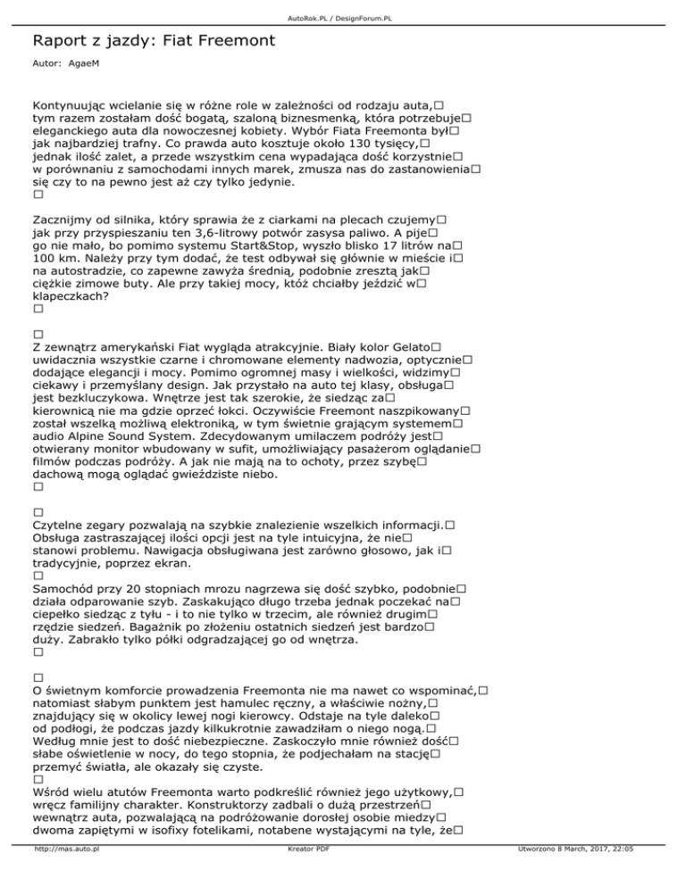 AutoRok.PL / DesignForum.PL Raport z jazdy: Fiat Freemont Autor: AgaeM Kontynuując wcielanie się w różne role w zależności od rodzaju auta, tym razem zostałam dość bogatą, szaloną biznesmenką, która potrzebuje eleganckiego auta dla nowoczesnej kobiety. Wybór Fiata Freemonta był jak najbardziej trafny. Co prawda auto kosztuje około 130 tysięcy, jednak ilość zalet, a przede wszystkim cena wypadająca dość korzystnie w porównaniu z samochodami innych marek, zmusza nas do zastanowienia się czy to na pewno jest aż czy tylko jedynie. Zacznijmy od silnika, który sprawia że z ciarkami na plecach czujemy jak przy przyspieszaniu ten 3,6-litrowy potwór zasysa paliwo. A pije go nie mało, bo pomimo systemu Start&Stop, wyszło blisko 17 litrów na 100 km. Należy przy tym dodać, że test odbywał się głównie w mieście i na autostradzie, co zapewne zawyża średnią, podobnie zresztą jak ciężkie zimowe buty. Ale przy takiej mocy, któż chciałby jeździć w klapeczkach? Z zewnątrz amerykański Fiat wygląda atrakcyjnie. Biały kolor Gelato uwidacznia wszystkie czarne i chromowane elementy nadwozia, optycznie dodające elegancji i mocy. Pomimo ogromnej masy i wielkości, widzimy ciekawy i przemyślany design. Jak przystało na auto tej klasy, obsługa jest bezkluczykowa. Wnętrze jest tak szerokie, że siedząc za kierownicą nie ma gdzie oprzeć łokci. Oczywiście Freemont naszpikowany został wszelką możliwą elektroniką, w tym świetnie grającym systemem audio Alpine Sound System. Zdecydowanym umilaczem podróży jest otwierany monitor wbudowany w sufit, umożliwiający pasażerom oglądanie filmów podczas podróży. A jak nie mają na to ochoty, przez szybę dachową mogą oglądać gwieździste niebo. Czytelne zegary pozwalają na szybkie znalezienie wszelkich informacji. Obsługa zastraszającej ilości opcji jest na tyle intuicyjna, że nie stanowi problemu. Nawigacja obsługiwana jest zarówno głosowo, jak i tradycyjnie, poprzez ekran. Samochód przy 20 stopniach mrozu nagrzewa się dość szybko, podobnie działa odparowanie szyb. Zaskakująco długo trzeba jednak poczekać na ciepełko siedząc z tyłu - i to nie tylko w trzecim, ale również drugim rzędzie siedzeń. Bagażnik po złożeniu ostatnich siedzeń jest bardzo duży. Zabrakło tylko półki odgradzającej go od wnętrza. O świetnym komforcie prowadzenia Freemonta nie ma nawet co wspominać, natomiast słabym punktem jest hamulec ręczny, a właściwie nożny, znajdujący się w okolicy lewej nogi kierowcy. Odstaje na tyle daleko od podłogi, że podczas jazdy kilkukrotnie zawadziłam o niego nogą. Według mnie jest to dość niebezpieczne. Zaskoczyło mnie również dość słabe oświetlenie w nocy, do tego stopnia, że podjechałam na stację przemyć światła, ale okazały się czyste. Wśród wielu atutów Freemonta warto podkreślić również jego użytkowy, wręcz familijny charakter. Konstruktorzy zadbali o dużą przestrzeń wewnątrz auta, pozwalającą na podróżowanie dorosłej osobie miedzy dwoma zapiętymi w isofixy fotelikami, notabene wystającymi na tyle, że http://mas.auto.pl Kreator PDF Utworzono 8 March, 2017, 22:05 AutoRok.PL / DesignForum.PL po postawieniu odpowiednio fotelika zaczep sam się zatrzaskuje. Jednocześnie możemy przewozić dwoje dzieci na zewnętrznych fotelach bądź - co jest rzadkością - jedno wpinając fotelik w dodatkowym isofixie na środkowym siedzeniu. W zewnętrznych siedzeniach drugiego rzędu wmontowano system childbooster, który dzięki specjalnym poduszkom umożliwia bezpieczne przewożenie dzieci o wadze 15-36 kg bez konieczności używania fotelików. Nie zabrakło też niezliczonych schowków (między innymi w podłodze) oraz magicznego lusterka, dzięki któremu kierowca może spoglądać na swoje pociechy. Na pochwałę zasługuje również kolorystyka wnętrza. Zastosowano czarną skórzaną tapicerkę, obicia drzwi i deskę rozdzielczą z chromowanymi akcentami oraz zupełnie odcinające się jasne słupki i dach. Wszystko zostało dobrze i ładnie skomponowane. Pomijając koszty eksploatacji (które nie dla każdego muszą być problemem), auto trafia w mój gust. AgaeM Zapraszamy do galerii zdjęć http://mas.auto.pl Kreator PDF Utworzono 8 March, 2017, 22:05