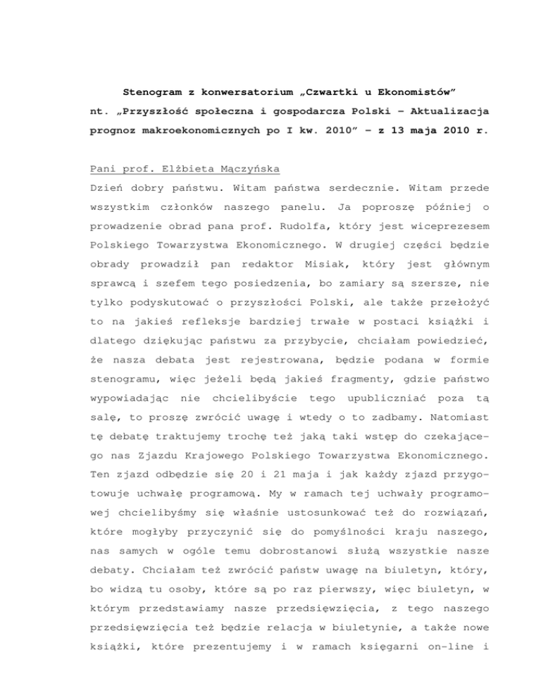 Stenogram z konwersatorium „Czwartki u Ekonomistów” nt. „Przyszłość społeczna i gospodarcza Polski - Aktualizacja prognoz makroekonomicznych po I kw. 2010” - z 13 maja 2010 r. Pani prof. Elżbieta Mączyńska Dzień dobry państwu. Witam państwa serdecznie. Witam przede wszystkim członków naszego panelu. Ja poproszę później o prowadzenie obrad pana prof. Rudolfa, który jest wiceprezesem Polskiego Towarzystwa Ekonomicznego. W drugiej części będzie obrady prowadził pan redaktor Misiak, który jest głównym sprawcą i szefem tego posiedzenia, bo zamiary są szersze, nie tylko podyskutować o przyszłości Polski, ale także przełożyć to na jakieś refleksje bardziej trwałe w postaci książki i dlatego dziękując państwu za przybycie, chciałam powiedzieć, że nasza debata jest rejestrowana, będzie podana w formie stenogramu, więc jeżeli będą jakieś fragmenty, gdzie państwo wypowiadając nie chcielibyście tego upubliczniać poza tą salę, to proszę zwrócić uwagę i wtedy o to zadbamy. Natomiast tę debatę traktujemy trochę też jaką taki wstęp do czekającego nas Zjazdu Krajowego Polskiego Towarzystwa Ekonomicznego. Ten zjazd odbędzie się 20 i 21 maja i jak każdy zjazd przygotowuje uchwałę programową. My w ramach tej uchwały programowej chcielibyśmy się właśnie ustosunkować też do rozwiązań, które mogłyby przyczynić się do pomyślności kraju naszego, nas samych w ogóle temu dobrostanowi służą wszystkie nasze debaty. Chciałam też zwrócić państw uwagę na biuletyn, który, bo widzą tu osoby, które są po raz pierwszy, więc biuletyn, w którym przedstawiamy nasze przedsięwzięcia, z tego naszego przedsięwzięcia też będzie relacja w biuletynie, a także nowe książki, które prezentujemy i w ramach księgarni on-line i 2 Konwersatorium „Czwartki u Ekonomistów” - 13 maja 2010 r. nie tylko, więc zachęcam państwa do lektur. Nasza debata spotkała się już z zainteresowaniem mediów, już są pytania, wywiady. Pan premier Pawlak, który myśleliśmy, że zaszczyci nasze spotkanie, ale ta trudna atmosfera przedwyborcza nie sprzyja takiemu uczestnictwu, ale zostaliśmy zaproszeni na 18, czyli jeszcze przed zjazdem na taką debatę w Ministerstwie Gospodarki, więc ja mogę państwa zapewnić, że państwa rekomendacje, wobec tego. opinie zostaną Zapraszam pana przekazane. prof. Rudolfa Dziękuję do bardzo prowadzenia dalszej części spotkania. Pan prof. Stanisław Rudolf - przewodniczący Dziękuję bardzo. Moim zadaniem jest sprawne przeprowadzenie tego spotkania i skończenie tak, żebyśmy mogli wyjść na posiłek o odpowiedniej godzinie. Pani prof. Elżbieta Mączyńska O 13-tej. Pan prof. Stanisław Rudolf - przewodniczący Po drugiej stronie naszego korytarza. Proszę państwa, dyskusja na temat przyszłości toczy się od dawna w tej sali i wielokrotnie w czasie czwartków, które odbywają się i w środy, w poniedziałki, itd., ale nazywamy to czwartkami, była bardzo szeroka. Również razem z Klubem Rzymskim były organizowane spotkania, więc to nie jest nowe spotkanie. Natomiast nowością jest to, że ileś tam prognoz powstało wcześniej. Od lat te prognozy przecież są dyskutowane. Prognozy pana prof. Welfe są znane, od samego początku ..., jeszcze wcześniej nawet, więc teraz jest czas jakby na skorygowanie tego, czy te prognozy się sprawdzają, czy idą we właściwym kierunku, co należałoby w nich zmienić, zaakcentować itd. W związku z tym mamy liczne grono panelistów, bo będzie aż 8 panelistów. Na 3 Konwersatorium „Czwartki u Ekonomistów” - 13 maja 2010 r. liście jest dziewiątka, ale jeden z profesorów nie mógł przyjechać, w związku z tym nie będę szczegółowo przedstawiał, bo te osoby są powszechnie znane, natomiast chciałem tylko podać zasady naszej dyskusji. Otóż, paneliści będą mieli około 10 minut, powiedzmy, że to jest taki czas standardowy i dla pewnej kontroli, ale i zdyscyplinowania będę pokazywał po pewnym czasie takie informacje, 2 minuty. Kiedy się czas skończy będę pokazywał, że czas się skończył. W ten sposób z doświadczenia wiem, że to pomaga, żeby dyscyplinować naszych panelistów. Dziewięć osób, czy osiem to jest dużo, więc jak każdy by przekroczył o 2, 3 minuty, to już się to bardzo wydłuża. Natomiast dyskusja będzie dopiero po drugiej sesji, na zakończenie, wtedy oczywiście państwo będziecie mogli dowolnie dyskutować, zgłaszać się do dyskusji na specjalnych kartach, które zostały państwu dostarczone. Pani prof. Elżbieta Mączyńska Ja jeszcze tylko sekundę jedną, przepraszam, że przerywam, ale wiem, że panowie paneliści sugerowali, że niektórzy będą wychodzili wcześniej, to chciałam przekazać państwu już teraz nasze publikacje i prosić o przyjęcie dlatego, że boję się, że jak ktoś wyjdzie wcześniej, to ich nie otrzyma, a państwu przy okazji zwracam uwagę na właśnie te książki. Proszę państwa tu są jeszcze kolejne, więc proszę przy wychodzeniu częstować się tymi książkami. Dziękuję bardzo. Pan prof. Stanisław Rudolf - przewodniczący Dziękuję bardzo. Proszę państwa w takim razie przystępujemy do naszej debaty. Jak chodzi o kolejność wystąpień, to będzie poza jednym wyjątkiem taka jak w programie, w zaproszeniu. Pan Paweł Duriasz, główny ekonomista PZU prosił, żeby przenieść jego wystąpienie na nieco później, ponieważ w związku z 4 Konwersatorium „Czwartki u Ekonomistów” - 13 maja 2010 r. debiutem PZU ma obowiązki, nie może być punktualnie, ale powinien się w tej sesji zmieścić. Zgodnie z tym planem jako pierwszy wystąpi pan Tadeusz Chrościcki, ekspert niezależny. 10 minut bardzo proszę. Pan Tadeusz Chrościcki Dziękuję. Dziękuję bardzo za zaproszenie. Od razu przystępuję do meritum ze względu na to, że 10 minut to rzeczywiście jest dosyć mało czasu, ale postaram się zmieścić. Co najbardziej w t