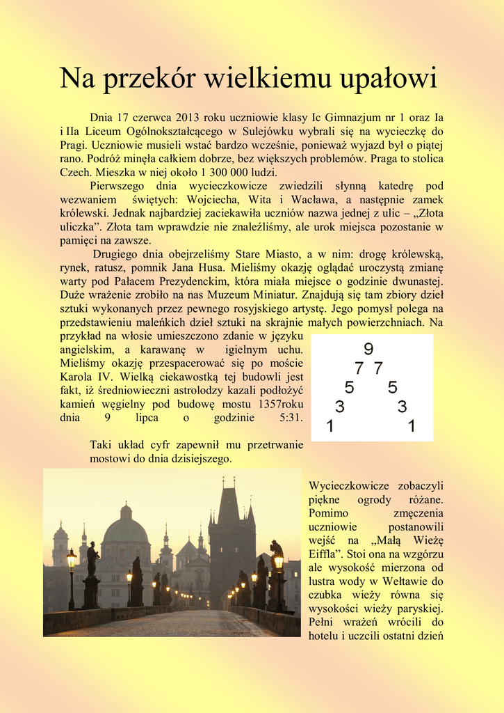 Na przekór wielkiemu upałowi Dnia 17 czerwca 2013 roku uczniowie klasy Ic Gimnazjum nr 1 oraz Ia i IIa Liceum Ogólnokształcącego w Sulejówku wybrali się na wycieczkę do Pragi. Uczniowie musieli wstać bardzo wcześnie, ponieważ wyjazd był o piątej rano. Podróż minęła całkiem dobrze, bez większych problemów. Praga to stolica Czech. Mieszka w niej około 1 300 000 ludzi. Pierwszego dnia wycieczkowicze zwiedzili słynną katedrę pod wezwaniem świętych: Wojciecha, Wita i Wacława, a następnie zamek królewski. Jednak najbardziej zaciekawiła uczniów nazwa jednej z ulic – „Złota uliczka”. Złota tam wprawdzie nie znaleźliśmy, ale urok miejsca pozostanie w pamięci na zawsze. Drugiego dnia obejrzeliśmy Stare Miasto, a w nim: drogę królewską, rynek, ratusz, pomnik Jana Husa. Mieliśmy okazję oglądać uroczystą zmianę warty pod Pałacem Prezydenckim, która miała miejsce o godzinie dwunastej. Duże wrażenie zrobiło na nas Muzeum Miniatur. Znajdują się tam zbiory dzieł sztuki wykonanych przez pewnego rosyjskiego artystę. Jego pomysł polega na przedstawieniu maleńkich dzieł sztuki na skrajnie małych powierzchniach. Na przykład na włosie umieszczono zdanie w języku angielskim, a karawanę w igielnym uchu. Mieliśmy okazję przespacerować się po moście Karola IV. Wielką ciekawostką tej budowli jest fakt, iż średniowieczni astrolodzy kazali podłożyć kamień węgielny pod budowę mostu 1357roku dnia 9 lipca o godzinie 5:31. Taki układ cyfr zapewnił mu przetrwanie mostowi do dnia dzisiejszego. Wycieczkowicze zobaczyli piękne ogrody różane. Pomimo zmęczenia uczniowie postanowili wejść na „Małą Wieżę Eiffla”. Stoi ona na wzgórzu ale wysokość mierzona od lustra wody w Wełtawie do czubka wieży równa się wysokości wieży paryskiej. Pełni wrażeń wrócili do hotelu i uczcili ostatni dzień wycieczki śpiewem i grą na gitarze. Trzeciego dnia zwiedzili Nowe Miasto. Zobaczyli plac oraz pomnik świętego Wacława. Podziwiali obrazy w muzeum Alfonsa Muchy. Uczniowie jechali całą noc. Wrócili do Sulejówka około godziny piątej. Wszystkim bardzo podobała się ta wycieczka. Katedra pod wezwaniem Witolda , Wojciecha i Wacława Złota uliczka Brama przed kompleksem pałaców i katedry Katedra Witolda, Wojciecha i Wacława w środku Opr. Agnieszka Lodoń Klaudia Dobosz Kacper Bielecki kl. Ic Gim. Fot. Kacper Bielecki