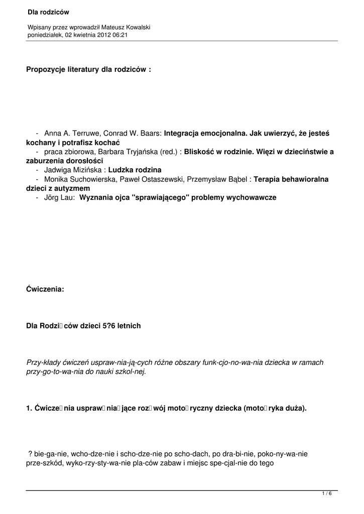 Dla rodziców Wpisany przez wprowadził Mateusz Kowalski poniedziałek, 02 kwietnia 2012 06:21 Propozycje literatury dla rodziców : - Anna A. Terruwe, Conrad W. Baars: Integracja emocjonalna. Jak uwierzyć, że jesteś kochany i potrafisz kochać - praca zbiorowa, Barbara Tryjańska (red.) : Bliskość w rodzinie. Więzi w dzieciństwie a zaburzenia dorosłości - Jadwiga Mizińska : Ludzka rodzina - Monika Suchowierska, Paweł Ostaszewski, Przemysław Bąbel : Terapia behawioralna dzieci z autyzmem - Jörg Lau: Wyznania ojca "sprawiającego" problemy wychowawcze Ćwiczenia: Dla Rodziców dzieci 5?6 letnich Przykłady ćwiczeń usprawniających różne obszary funkcjonowania dziecka w ramach przygotowania do nauki szkolnej. 1. Ćwiczenia usprawniające rozwój motoryczny dziecka (motoryka duża). ? bieganie, wchodzenie i schodzenie po schodach, po drabinie, pokonywanie przeszkód, wykorzystywanie placów zabaw i miejsc specjalnie do tego 1/6 Dla rodziców Wpisany przez wprowadził Mateusz Kowalski poniedziałek, 02 kwietnia 2012 06:21 przygotowanych w celu rozwijania sprawności ruchowej ? stanie na jednej nodze, wykonywanie podskoków obunóż i na jednej nodze ? rzucanie i łapanie piłki w grze, z różnych odległości ? rzucanie piłeczkami, lotkami, kulami z papieru ? przerzucanie piłki z jednej ręki do drugiej ? uczestnictwo w zabawach ruchowych, grupowych, zwracanie uwagi na aktywność fizyczną 2. Ćwiczenia rozwijające funkcje wzrokowe dziecka: - odnajdywanie na obrazkach drobnych szczegółów (pokaż gdzie jest.?) ? odnajdywanie podobieństw i różnic w prezentowanych dziecku obrazkach o tej samej tematyce ? dobieranie par jednakowych obrazków ? można wykorzystać grę ?memory? ? składanie obrazka pociętego na części (można wykorzystać pocztówki) ? układanie elementów wg wzoru ? klocki, puzzle, pocztówki ? dobieranie elementów do całości obrazka ? np. sklep z warzywami, spożywczy; poszukujemy odpowiednich produktów pasujących do danego sklepu ? rysowanie kompozycji z figur geometrycznych za pomocą szablonów; powtarzanie elementów wg. schematu ? rysowanie demonstrowanych przedmiotów np. samochodu, domku, drzewa - spostrzeganie zmian w układaniu elementów ( dół, góra, prawa, lewa strona itd.) ? klasyfikowanie przedmiotów według rodzaju, kształtu, ilości, koloru ? rysowanie po śladzie (łączenie kresek w linie tworzące element) ? kalkowanie przez kalkę techniczną ? przerysowywanie figur geometrycznych (według wzoru) 3. Ćwiczenia usprawniające funkcje słuchowe dziecka: - dzielenie zdań na wyrazy 2/6 Dla rodziców Wpisany przez wprowadził Mateusz Kowalski poniedziałek, 02 kwietnia 2012 06:21 ? wyszukiwanie obrazków na dana głoskę np. ?p? ? ?pies? ? dzielenie wyrazów na sylaby z klaskaniem np. ?ka-wa? ? rozróżnianie dźwięków np.: pluskanie w wodzie, gniecenie papieru, rozpoznawanie po głosie różnych osób ? gry i zabawy rytmiczne (wykonywanie ruchów na hasło muzyczne) ? wydzielanie głoski na początku, na końcu i w środku wyrazu ? nauka krótkich wierszyków i piosenek ? ćwiczenie różnicowania dźwięków z otoczenia (co teraz słychać?) ? odtwarzanie struktur dźwiękowych w układach przestrzennych np. z klocków ? grupowanie obrazków na tą samą głoskę (pies, pióro, papier) ? odgadywanie głosek na początku wyrazu i szukanie kolejnych, podejmowanie prób tworzenia sylab i czytanie prostych wyrazów 4. Ćwiczenia usprawniające precyzję ruchów rąk i koordynację wzrokowo ? ruchową dziecka - ćwiczenia dłoni (machanie, krążenie, klaskanie, naśladowanie np. gry na skrzypcach, na trąbce, układanie modeli z dłoni np. dziób, kula, kwiat, piramidka, wchodzenie po schodach) ? ćwiczenia palców (naśladowanie pisania na komputerze, gry na pianinie, deszczu, rysowania kółek w powietrzu, składanie i rozkładanie palców, układanie modeli z palców np. koszyk, koło) ? lepienie z plasteliny, również gliny prostych kształtów (np. kulek, wałków, rogalików, ludzi, koszyków, liter, zwierząt i innych elementów) ? wycinanie nożyczkami pasków z papieru i innych wzorów ? malowanie palcem i pęczkiem waty umaczanym w farbie ? zamalowanie kartki farbami (z góry w dół, od lewej do prawej strony) ? odrysowanie własnej dłoni, odrysowywanie płaskich przedmiotów np. monet, talerzyków itp. ? układanie i przyklejanie na kartce wzorów z kolorowego papieru ? naklejanie nalepek na właściwy schemat na kartce papieru ? robienie kulek z bibułki lub krepiny, wyklejanie nimi konturów ? obrysowywanie konturów (pogrubienie konturów, kalkowanie) ? rysowanie równocześnie obiema rękami tych samych elementów ? łączenie kropek obrazujących różne przedmioty ? rysowanie szlaczków i wzorów z elementów litero podobnych ? nawlekanie koralików, przewlekanie sznurków, tasiemek, sznurowadeł przez różne rzeczy i otwory, szycie igłą z wykorzystywaniem zabawek dla dzieci ? wieszanie ubranek dla lalek na sznurku i przyczepianie ich klamerkami do bielizny ? zamalowywanie obrazków w książeczkach do malowania ? odrysowywanie szablonów ? wciskanie w tablicę korkową pinezek ? wyjmowanie ich z podłoża 3/6 Dla rodziców Wpisany przez wprowadził Mateusz Kowalski poniedziałek, 02 kwietnia 2012 06:21 ? zbieranie palcami drobnych elementów (pinezki, ziarenka, guziczki) ? dwoma palcami, kciukiem i wskazującym, zbieranie wyżej wymienionych elementów pęsetą ? cięcie nożyczkami po narysowanych liniach ? prostych, falistych ? wycinanie najpierw prostych, potem nieco bardziej skomplikowanych kształtów z papieru kolorowego ? wyrabianie ciasta podczas prac domowych ? stemplowanie wzorów na kartkach papieru w różnych układach ? wydzieranie kawałków kolorowego papieru i naklejanie na narysowany schemat zamiast malowania kredkami ? strząsanie wody z palców ? zgniatanie większego papieru jedną ręką, dwoma rękoma w kulkę ? zabawy z użyciem pacynek (manipulacja rękoma) ? próby przysz