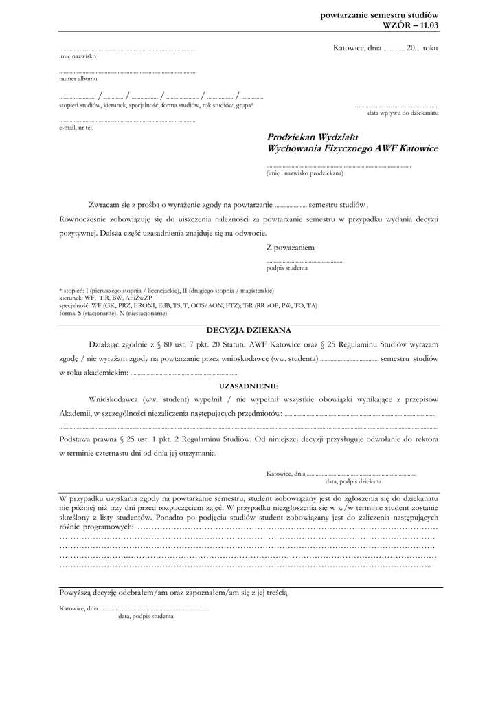 powtarzanie semestru studiów WZÓR – 11.03 Katowice, dnia ..... . ...... 20.... roku .............................................................................................. imię nazwisko .............................................................................................. numer albumu ......................... / ............. / .................. / ...................... / .................. / ............... stopień studiów, kierunek, specjalność, forma studiów, rok studiów, grupa* ............................................................................................. e-mail, nr tel. ........................................................ data wpływu do dziekanatu Prodziekan Wydziału Wychowania Fizycznego AWF Katowice ................................................................................................... (imię i nazwisko prodziekana) Zwracam się z prośbą o wyrażenie zgody na powtarzanie ...................... semestru studiów . Równocześnie zobowiązuję się do uiszczenia należności za powtarzanie semestru w przypadku wydania decyzji pozytywnej. Dalsza część uzasadnienia znajduje się na odwrocie. Z poważaniem ..................................................... podpis studenta * stopień: I (pierwszego stopnia / licencjackie), II (drugiego stopnia / magisterskie) kierunek: WF, TiR, BW, AFiŻwZP specjalność: WF (GK, PRZ, ERONI, EdB, TS, T, OOS/AON, FTZ); TiR (RR zOP, PW, TO, TA) forma: S (stacjonarne); N (niestacjonarne) DECYZJA DZIEKANA Działając zgodnie z § 80 ust. 7 pkt. 20 Statutu AWF Katowice oraz § 25 Regulaminu Studiów wyrażam zgodę / nie wyrażam zgody na powtarzanie przez wnioskodawcę (ww. studenta) ........................................ semestru studiów w roku akademickim: .......................................................................... UZASADNIENIE Wnioskodawca (ww. student) wypełnił / nie wypełnił wszystkie obowiązki wynikające z przepisów Akademii, w szczególności niezaliczenia następujących przedmiotów: ....................................................................................................... ................................................................................................................................................................................................................................................................... Podstawa prawna § 25 ust. 1 pkt. 2 Regulaminu Studiów. Od niniejszej decyzji przysługuje odwołanie do rektora w terminie czternastu dni od dnia jej otrzymania. Katowice, dnia ........................................................................... data, podpis dziekana W przypadku uzyskania zgody na powtarzanie semestru, student zobowiązany jest do zgłoszenia się do dziekanatu nie później niż trzy dni przed rozpoczęciem zajęć. W przypadku niezgłoszenia się w w/w terminie student zostanie skreślony z listy studentów. Ponadto po podjęciu studiów student zobowiązany jest do zaliczenia następujących różnic programowych: ……………………………………………………………………………………………… ……………………………………………………………………………………………………………………… ……………………………………………………………………………………………………………………… …………………….………………………………………………………………………………………………… …………………………………………………………………………………………………………………….. Powyższą decyzję odebrałem/am oraz zapoznałem/am się z jej treścią Katowice, dnia ........................................................................... data, podpis studenta
