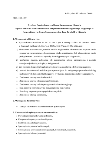 Kalisz, dnia 15 kwietnia 2009r. ŚDS.1118-1/09 Dyrektor Środowiskowego Domu Samopomocy Liskowie ogłasza nabór na wolne kierownicze urzędnicze stanowisko głównego księgowego w Środowiskowym Domu Samopomocy im. Jana Pawła II w Liskowie 1. Wymagania obligatoryjne: ● Wykształcenie określone w art. 45 ust.2 pkt 4 ustawy z dnia 30 czerwca 2005r. o finansach publicznych (Dz. U. z 2005r., Nr 249 poz. 2104 z późn. zm.) 1) ukończone ekonomiczne jednolite studia magisterskie, ekonomiczne wyŜsze studia zawodowe, uzupełniające ekonomiczne studia magisterskie lub ekonomiczne studia podyplomowe i posiada co najmniej 3-letnią praktykę w księgowości, 2) ukończoną średnią, policealną lub pomaturalną szkołę ekonomiczną i posiada co najmniej 6-letnią praktykę w księgowości, 3) jest wpisana do rejestru biegłych rewidentów na podstawie odrębnych przepisów, 4) posiada świadectwo kwalifikacyjne uprawniające do usługowego prowadzenia ksiąg rachunkowych lub certyfikat księgowy, wydane na podstawie odrębnych przepisów. • Znajomość ustawy o rachunkowości. • Znajomość ustawy o finansach publicznych. • Znajomość ustawy kodeks postępowania administracyjnego. • Stan zdrowia pozwalający na zatrudnienie na stanowisku, • Brak kary za przestępstwa popełnione umyślnie, • Znajomość obsługi komputera, 2. Wymagania fakultatywne: • Kursy i szkolenia w zakresie finansów publicznych 3. Zakres zadań wykonywanych na stanowisku: ● Prowadzenie rachunkowości jednostki, ● Księgowanie syntetyczne i analityczne, ● Elektroniczna obsługa bankowa, ● Sporządzanie planów budŜetowych, ● Sporządzanie sprawozdań: miesięcznych, kwartalnych, rocznych, ● Sporządzanie bilansu jednostki, ● Dokonywanie kontroli wewnętrznej w jednostce, ● Wystawianie zaświadczeń finansowych, ● Archiwizowanie dokumentów księgowych, ● Przygotowywanie korespondencji związanej z księgowością 4. Wymagane dokumenty: • Ŝyciorys (CV), • list motywacyjny, • dokument poświadczający wykształcenie (dyplom lub zaświadczenie), • oświadczenie o braku kary za przestępstwa popełnione z winy umyślnej, Wymagane dokumenty aplikacyjne naleŜy składać w Środowiskowym Domu Samopomocy Liskowie ul. Twórców Liskowa 3 w terminie do dnia 4 maja 2009r z dopiskiem „Nabór Główny Księgowy” Aplikacje, które wpłyną do Urzędu po wyŜej określonym terminie nie będą rozpatrywane. Informacja o wyniku naboru będzie umieszczona na stronie internetowej Biuletynu Informacji Publicznej (www.bip.powiat.kalisz.pl ) oraz na tablicy informacyjnej w Środowiskowym Domu Samopomocy w Liskowie Wymagane dokumenty aplikacyjne: list motywacyjny, CV, powinny być opatrzone klauzulą „WyraŜam zgodę na przetwarzanie moich danych osobowych zawartych w ofercie pracy dla potrzeb niezbędnych do realizacji procesu rekrutacji zgodnie z ustawą z dnia 29.08.1997r. o ochronie danych osobowych (Dz. U. z 2002 Nr 101, poz. 926 z późn.zm.) oraz ustawą z dnia 21 listopada 2008r.. o pracownikach samorządowych (Dz. U. z 2008r. Nr 223 poz. 1458)