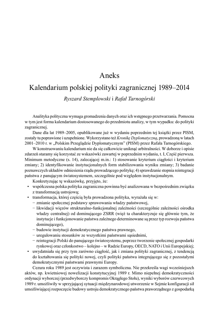 Aneks Kalendarium polskiej polityki zagranicznej 1989–2014 Ryszard Stemplowski i Rafał Tarnogórski Analityka polityczna wymaga gromadzenia danych oraz ich wstępnego przetwarzania. Pomocna w tym jest forma kalendarium dostosowanego do przedmiotu analizy, w tym wypadku: do polityki zagranicznej. Dane dla lat 1989–2005, opublikowane już w wydaniu poprzednim tej książki przez PISM, zostały tu poprawione i uzupełnione. Wykorzystano też Kronikę Dyplomatyczną, prowadzoną w latach 2001–2010 r. w „Polskim Przeglądzie Dyplomatycznym” (PISM) przez Rafała Tarnogórskiego. W konstruowaniu kalendarium nie da się całkowicie uniknąć arbitralności. W doborze i opisie zdarzeń staramy się korzystać ze wskazówki zawartej w poprzednim wydaniu, t. I, Część pierwsza. Minimum metodyczne (s. 14), zalecającej m.in.: 1) stosowanie kryterium ciągłości i kryterium zmiany; 2) identyfikowanie instytucjonalnych form stabilizowania wyniku zmiany; 3) badanie poznawczych układów odniesienia rządu prowadzącego politykę; 4) sprawdzanie stopnia reintegracji państwa z panującym światosystemem, szczególnie pod względem instytucjonalnym. Konkretyzując tę wskazówkę, przyjęto, że: • współczesna polska polityka zagraniczna powinna być analizowana w bezpośrednim związku z transformacją ustrojową; • transformacja, której częścią była prowadzona polityka, wyrażała się w: − zmianie społecznej podstawy sprawowania władzy państwowej, − likwidacji więzów strukturalno-funkcjonalnej zależności (szczególnie zależności ośrodka władzy centralnej) od dominującego ZSRR (więź ta charakteryzuje się głównie tym, że instytucje i funkcjonowanie państwa zależnego determinowane są przez typ rozwoju państwa dominującego), − budowie instytucji demokratycznego państwa prawnego, − uregulowaniu stosunków ze wszystkimi państwami sąsiednimi, − reintegracji Polski do panującego światosystemu, poprzez tworzenie społecznej gospodarki rynkowej oraz członkostwo – kolejno – w Radzie Europy, OECD, NATO i Unii Europejskiej; • uwydatniała się przy tym zarówno ciągłość, jak i zmiana polityki zagranicznej, z tendencją do kształtowania się polityki nowej, czyli polityki państwa integrującego się z pozostałymi demokratycznymi państwami prawnymi Europy. Cezura roku 1989 jest oczywista i zarazem symboliczna. Nie przekreśla wagi wcześniejszch aktów, np. kwietniowej nowelizacji konstytucyjnej 1989 r. Mimo niepełnej demokratyczności ordynacji wyborczej (przedwyborczy kompromis Okrągłego Stołu), wyniki wyborów czerwcowych 1989 r. umożliwiły w sprzyjającej sytuacji międzynarodowej utworzenie w Sejmie konfiguracji sił umożliwiającej rozpoczęcie budowy ustroju demokratycznego państwa praworządnego z gospodarką 276 Aneks. Kalendarium polskiej polityki zagranicznej 1989–2014 rynkową, poczynając od zniesienia kierowniczej roli PZPR w państwie i powołania rządu Tadeusza Mazowieckiego z przewagą reprezentacji demokratycznej. Cezura roku 2014 zbiega się z 25-leciem Rzeczypospolitej Polskiej w pełni suwerennej. Nie jest to jeszcze pełne kalendarium polityki zagranicznej. Przeważa problematyka tradycyjnie pojmowanej dyplomacji, a baza źródłowa, chociaż już szersza, nadal nie jest jeszcze pełna. Stan badań nad prowadzeniem polityki w Polsce nie pozwala jeszcze na pełne uwzględnienie wyeksponowanej w tej książce i książce O prowadzeniu i analizowaniu polityki państwa (2013) zasady podejścia holistycznego do polityki. Czytelnik znajdzie tam jednak rozważania odnoszące się do znaczenia terminów (pojęć) spotykanych w niniejszym kalendarium. Więcej uwagi poświęciliśmy identyfikowaniu tekstów przemówień, decyzji, aktów prawnych etc. aniżeli wizytom czy uczestnictwu w sesjach ONZ; niektóre serie zdarzeń nie znalazły tu jeszcze pełnego odbicia – np. Inicjatywa Środkowoeuropejska, Rada Państw Morza Bałtyckiego, CEFTA – brakuje wielu danych z zakresu gospodarki, działalności ministra obrony, ministra Skarbu Państwa, Rady Polityki Pieniężnej etc. Korzystaliśmy z Dziennika Ustaw, Monitora Polskiego, Sprawozdań Stenograficznych z posiedzeń Sejmu (najważniejsze przemówienia premiera i ministra spraw zagranicznych z lat 1989–2007 zostały opublikowane w t. II poprzedniego wydania), biuletynów komisji sejmowych, czasopism – przede wszystkim takich, jak „Zbiór dokumentów” (wydawany do 2000 r. przez MSZ), „Polski Przegląd Dyplomatyczny”, „Rocznik Polskiej Polityki Zagranicznej” – informacji mediów, tekstów dostępnych w Internecie, opublikowanych wspomnień, rozmów z politykami i urzędnikami, opracowań. Jeden bardzo ważny wątek polskiej polityki zagranicznej ma wyjątkową dokumentację w postaci zbioru 98 dokumentów opublikowanych pod redakcją Włodzimierza Borodzieja (Polska wobec zjednoczenia Niemiec 1989–1991. Dokumenty dyplomatyczne, współpraca: Dominik Pick, Wydawnictwo Naukowe Scholar, Warszawa 2006). Dane dla pierwszych lat transformacji obejmuje wykaz sporządzony przez Aleksandra Kochańskiego (Polska 1944–1991. Informator historyczny, t. III, cz. 2: /1983–1991/. Ważniejsze akty prawne, decyzje i enuncjacje państwowe 1971–1991, Wydawnictwo Sejmowe, Warszawa 2005). W zakresie wizyt prezydenta albo u prezydenta pierwszeństwo dajemy informacji zamieszczonej na stronie internetowej www.prezydent.pl. Wykorzystywaliśmy też inne kalendaria. (1) Kalendarium autorstwa Barbary Janickiej zawierające informację wytwarzaną w MSZ, zamieszczone w opracowaniu redagowanym przez wysokich urzędników MSZ, będące przez to formalnie źródłem wysoce autorytatywnym (Kuźniar R., Szczepanik K., red., Polityka zagraniczna RP 1989–2002, Wydawnictwo Askon, Fundacja Stosunków Międzynarodowych, Warszawa 2002, s. 449–481). Z tego źródła mogliśmy zaczerpnąć niektóre dane o wymienionych tam wizytach z okresu do czerwca 2002 r., nie uwzględniaj