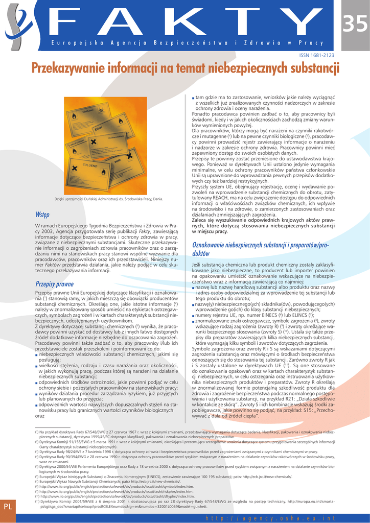 35 E u r o p e j s k a A g e n c j a B e z p i e c z e ƒ s t w a i Z d r o w i a w P r a c y ISSN 1681-2123 Przekazywanie informacji na temat niebezpiecznych substancji tam gdzie ma to zastosowanie, wniosków jakie nale˝y wyciàgnàç z wszelkich ju˝ zrealizowanych czynnoÊci nadzorczych w zakresie ochrony zdrowia i oceny nara˝enia. Ponadto pracodawca powinien zadbaç o to, aby pracownicy byli Êwiadomi, kiedy i w jakich okolicznoÊciach zachodzà zmiany warunków wymienionych powy˝ej. Dla pracowników, którzy mogà byç nara˝eni na czynniki rakotwórcze i mutagenne (4) lub na pewne czynniki biologiczne (5), pracodawcy powinni prowadziç rejestr zawierajàcy informacje o nara˝eniu i nadzorze w zakresie ochrony zdrowia. Pracownicy powinni mieç zapewniony dost´p do swoich osobistych danych. Przepisy te powinny zostaç przeniesione do ustawodawstwa krajowego. Poniewa˝ w dyrektywach Unii ustalono jedynie wymagania minimalne, w celu ochrony pracowników paƒstwa cz∏onkowskie Unii sà uprawnione do wprowadzania pewnych przepisów dodatkowych czy te˝ bardziej restrykcyjnych. Przysz∏y system UE, obejmujàcy rejestracj´, ocen´ i wydawanie pozwoleƒ na wprowadzenie substancji chemicznych do obrotu, zatytu∏owany REACH, ma na celu zwi´kszenie dost´pu do odpowiednich informacji o w∏aÊciwoÊciach zwiàzków chemicznych, ich wp∏ywie na Êrodowisko i na zdrowie, o zamierzonych zastosowaniach oraz dzia∏aniach zmniejszajàcych zagro˝enia. Zaleca si´ wyszukiwanie odpowiednich krajowych aktów prawnych, które dotyczà stosowania niebezpiecznych substancji w miejscu pracy. ■ Dzi´ki uprzejmoÊci Duƒskiej Administracji ds. Ârodowiska Pracy, Dania. Wst´p W ramach Europejskiego Tygodnia Bezpieczeƒstwa i Zdrowia w Pracy 2003, Agencja przygotowa∏a seri´ publikacji Fakty, zawierajàcà informacje dotyczàce bezpieczeƒstwa i ochrony zdrowia w pracy, zwiàzane z niebezpiecznymi substancjami. Skuteczne przekazywanie informacji o zagro˝eniach zdrowia pracowników oraz o zarzàdzaniu nimi na stanowiskach pracy stanowi wspólne wyzwanie dla pracodawców, pracowników oraz ich przedstawicieli. Niniejszy numer Faktów przedstawia dzia∏ania, jakie nale˝y podjàç w celu skutecznego przekazywania informacji. Przepisy prawne Przepisy prawne Unii Europejskiej dotyczàce klasyfikacji i oznakowania (1) stanowià ramy, w jakich mieszczà si´ obowiàzki producentów substancji chemicznych. OkreÊlajà one, jakie istotne informacje (2) nale˝y w znormalizowany sposób umieÊciç na etykietach ostrzegawczych, symbolach zagro˝eƒ i w kartach charakterystyk substancji niebezpiecznych, udost´pnianych u˝ytkownikom. Z dyrektywy dotyczàcej substancji chemicznych (3) wynika, ˝e pracodawcy powinni uzyskaç od dostawcy lub z innych ∏atwo dost´pnych êróde∏ dodatkowe informacje niezb´dne do oszacowania zagro˝eƒ. Pracodawcy powinni tak˝e zadbaç o to, aby pracownicy i/lub ich przedstawiciele zostali przeszkoleni i poinformowani co do: ■ niebezpiecznych w∏aÊciwoÊci substancji chemicznych, jakimi si´ pos∏ugujà; ■ wielkoÊci st´˝enia, rodzaju i czasu nara˝ania oraz okolicznoÊci, w jakich wykonujà prac´, podczas której sà nara˝eni na dzia∏anie niebezpiecznych substancji; ■ odpowiednich Êrodków ostro˝noÊci, jakie powinni podjàç w celu ochrony siebie i pozosta∏ych pracowników na stanowiskach pracy; ■ wyników dzia∏ania procedur zarzàdzania ryzykiem, ju˝ przyj´tych lub planowanych do przyj´cia; ■ odpowiednich wartoÊci najwy˝szych dopuszczalnych st´˝eƒ na stanowisku pracy lub granicznych wartoÊci czynników biologicznych oraz PL Oznakowanie niebezpiecznych substancji i preparatów/produktów JeÊli substancja chemiczna lub produkt chemiczny zosta∏y zaklasyfikowane jako niebezpieczne, to producent lub importer powinien na opakowaniu umieÊciç oznakowanie wskazujàce na niebezpieczeƒstwo wraz z informacjà zawierajàcà co najmniej: ■ nazw´ lub nazw´ handlowà substancji albo produktu oraz nazw´ i adres osoby odpowiedzialnej za wprowadzenie tej substancji lub tego produktu do obrotu; ■ nazw´(y) niebezpiecznego(ych) sk∏adnika(ów), powodujàcego(ych) wprowadzenie go(ich) do klasy substancji niebezpiecznych; 6 7 ■ numery rejestru UE, np. numer EINECS ( ) lub ELINCS ( ); 8 ■ znormalizowane znaki ostrzegawcze, symbole zagro˝enia ( ), zwroty wskazujàce rodzaj zagro˝enia (zwroty R) (9) i zwroty okreÊlajàce warunki bezpiecznego stosowania (zwroty S) (10). Ustala si´ tak˝e przepisy dla preparatów zawierajàcych kilka niebezpiecznych substancji, które wymagajà kilku symboli i zwrotów dotyczàcych zagro˝enia. Symbole zagro˝enia oraz zwroty R i S sà wskazaniami dotyczàcymi zagro˝enia substancjà oraz mówiàcymi o Êrodkach bezpieczeƒstwa odnoszàcych si´ do stosowania tej substancji. Zarówno zwroty R jak i S zosta∏y ustalone w dyrektywach UE (11). Sà one stosowane do oznakowania opakowaƒ oraz w kartach charakterystyk substancji niebezpiecznych, w celu ostrzegania oraz instruowania u˝ytkownika niebezpiecznych produktów i preparatów. Zwroty R okreÊlajà w znormalizowanej formie potencjalnà szkodliwoÊç produktu dla zdrowia i zagro˝enie bezpieczeƒstwa podczas normalnego post´powania i u˝ytkowania substancji, na przyk∏ad R21: „Dzia∏a szkodliwie w kontakcie ze skórà”. Zwroty S i ich kombinacje wskazujà Êrodki zapobiegawcze, jakie powinno si´ podjàç, na przyk∏ad: S15: „Przechowywaç z dala od êróde∏ ciep∏a”. (1) Na przyk∏ad dyrektywa Rady 67/548/EWG z 27 czerwca 1967 r. wraz z kolejnymi zmianami, przedstawiajàca wymagania dotyczàce badania, klasyfikacji, pakowania i oznakowania niebezpiecznych substancji, dyrektywa 1999/45/EC dotyczàca klasyfikacji, pakowania i oznakowania niebezpiecznych preparatów. (2) Dyrektywa Komisji 91/155/EWG z 5 marca 1991 r. wraz z kolejnymi zmianami, okreÊlajàca i prezentujàca szczegó∏owe ustalenia dotyczàce systemu przygotowania szczególnyc