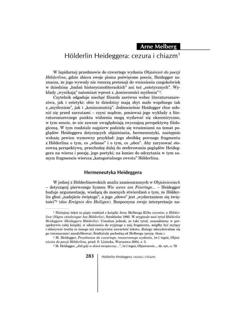 BArne MelbergB Hölderlin Heideggera: cezura i chiazm1 W lapidarnej przedmowie do czwartego wydania Objaśnień do poezji Hölderlina, gdzie zbiera swoje pisma poświęcone poecie, Heidegger zaznacza, że jego wywody nie roszczą pretensji do wniesienia czegokolwiek w dziedzinę „badań historycznoliterackich” ani też „estetycznych”. Wykłady „wynikają” natomiast wprost z „konieczności myślenia” 2. Czytelnik odgaduje niechęć filozofa zarówno wobec literaturoznawstwa, jak i estetyki: obie te dziedziny mają zbyt mało wspólnego tak z „myśleniem”, jak i „koniecznością”. Jednocześnie Heidegger chce osłonić się przed zarzutami – czyni mądrze, ponieważ jego wykłady z literaturoznawczego punktu widzenia mogą wydawać się ekscentryczne, w tym sensie, że nie zawsze uwzględniają zwyczajną perspektywę filologiczną. W tym rozdziale najpierw podzielę się wrażeniami na temat poglądów Heideggera dotyczących objaśniania, hermeneutyki, następnie wskażę pewien wymowny przykład: jego obróbkę pewnego fragmentu z Hölderlina o tym, co „własne” i o tym, co „obce”. Aby zarysować stosowną perspektywę, przechodzę dalej do zreferowania poglądów Heideggera na wiersz i poezję, jego poetyki; na koniec do odczytania w tym samym fragmencie wiersza „kategorialnego zwrotu” Hölderlina. Hermeneutyka Heideggera W jednej z Hölderlinowskich analiz zamieszczonych w Objaśnieniach – dotyczącej pierwszego hymnu Wie wenn am Feiertage... – Heidegger buduje argumentację, wiodącą do mocnych stwierdzeń o tym, że Hölderlin głosi „nadejście świętego”, a jego „słowo” jest „wydarzaniem się świętości”3 (das Ereignis des Heiligen). Rozpoczyna swoje interpretacje na________________________ 1 Niniejszy tekst to piąty rozdział z książki Arne Melberga Kilka zwrotów u Hölderlina (Några vändningar hos Hölderlin), Sztokholm 1995. W oryginale nosi tytuł Hölderlin Heideggera (Heideggers Hölderlin). Uznałam jednak, że taki tytuł, uzasadniony w perspektywie całej książki, w odniesieniu do wyjętego z niej fragmentu, mógłby być mylący i obiecywać trochę co innego niż rzeczywista zawartość tekstu, dlatego zdecydowałam się go (nieznacznie) zmodyfikować. Śródtytuły pochodzą od Melberga (przyp. tłum.). 2 M. Heidegger, Przedmowa do czwartego, rozszerzonego wydania, [w:] tegoż, Objaśnienia do poezji Hölderlina, przeł. S. Lisiecka, Warszawa 2004, s. 5. 3 M. Heidegger, „Jak gdy w dzień świąteczny…”, [w:] tegoż, Objaśnienia..., dz. cyt., s. 79. 283 Hölderlin Heideggera: cezura i chiazm stępującą deklaracją: „Wzięty tu za podstawę tekst, zbadany na nowo zgodnie z oryginalnymi szkicami, polega na próbie poniższej wykładni”4. Heidegger utrzymuje zatem, że postąpił zgodnie z zasadami filologii, w tym sensie, że dotarł do rękopiśmiennych, „oryginalnych” wariantów wiersza; zarazem w duchu hermeneutyki głosi dobitnie, że to interpretacja przesądza o ostatecznym kształcie tekstu. To gęste sformułowanie wskazuje, że Heidegger zorientował się w problematycznym statusie tekstu omawianego wiersza, wszelako jego interpretacja, głosząca „nadejście świętego”, pozostaje rozstrzygająca. Pchnęła go ona do postawienia pauzy po trzecim wersie ósmej strofy, gdzie również kończy się wariant metryczny w rękopisie. W manuskrypcie następuje potem trzykrotny okrzyk: „Biada mi!”5 („Weh mir!”) – rozwinięcie, które pozostaje w sprzeczności z kojącą Heideggerowską egzegezą6. Jak była o tym mowa w rozdziale pierwszym, gdzie przedstawiłem synoptycznie czystopis kluczowego fragmentu rękopisu, wokół końcówki tego wiersza istnieje cała wojna interpretacji. W tym miejscu można wskazać, że Paul de Man w kilku wczesnych tekstach rozprawił się z Heideggerowską skłonnością do traktowania Hölderlina jako nieomylnej wyroczni i stwierdził, że Hölderlin nie wyraża języka bycia, że „błaga o paruzję zamiast ustanawiać obecność bogów”, że, po prostu, wyraża czyste przeciwieństwo tego, co dostrzegł w jego wierszach Heidegger7. W dyskusję zaangażował się także Maurice Blanchot, wykorzystując (bez wspominania choćby słowem o Heideggerze) wstępną część L’entretien infini do analizy dokładnie tych samych wersów utworu, które Heidegger omawiał w swoim wywodzie. Blanchot dochodzi jednak do wniosku, że Hölderlin albo głosił „nadejście świętego”, albo wykazywał jego nieobecność. Francuski badacz znajduje, by tak rzec, wyjście pośrednie między Heideggerem a de Manem i wyobraża sobie, że „nadejście”, o którym pisze Hölderlin, dotyczy niemożliwej do określenia „neutralności”, a poeta wyraża raczej „życzenie” samo niż jego konkretną treść8. Bardziej generalna krytyka Heideggerowskiego sposobu czytania Hölderlina pochodzi od Adorna, który w obszernym eseju Parataksa utrzymuje, że Heidegger „przerywa” swoje odczytania, gdy tylko zbliżają się do tego, czego „filozofii wolno oczekiwać od poezji”, mianowicie – za________________________ Tamże, s. 53. F. Hölderlin, Jak w święto, [w:] tegoż, Co się ostaje, ustanawiają poeci, wybór i przekład A. Libera, Kraków 2003, s. 175 (przyp. tłum.). 6 Jak jednak wskazano w pierwszym rozdziale książki, Heidegger skomentował ciąg dalszy manuskryptu o „niebezpiecznym języku” w innym kontekście. 7 P. de Man, Heidegger’s Exegesis of Hölderlin, [w:] tegoż, Blindness and Insight, London 1983 (II wyd.), zwłaszcza s. 254 oraz 263. 8 M. Blanchot, L’entretien infini, Paris 1969, s. 55 i nast. 4 5 Arne Melberg 284 leżności treści od formy, i dlatego uczynił Hölderlina świadkiem we własnej sprawie, którą Adorno piętnuje jako Mythos9. Krytyka Adorna jest naturalnie jedną z licznych prób uczynienia lektury Hölderlina na powrót możliwą po tym, jak jego dzieło zostało wykorzystane przez ideologię nazistows