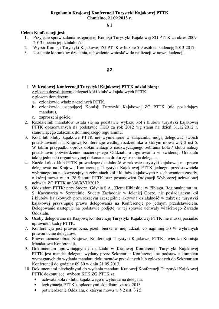 Regulamin Krajowej Konferencji Turystyki Kajakowej PTTK Chmielno, 21.09.2013 r. §1 Celem Konferencji jest: 1. Przyjęcie sprawozdania ustępującej Komisji Turystyki Kajakowej ZG PTTK za okres 20092013 i ocena jej działalności, 2. Wybór Komisji Turystyki Kajakowej ZG PTTK w liczbie 5-9 osób na kadencję 2013-2017, 3. Ustalenie kierunków działania, uchwalenie wniosków do realizacji w nowej kadencji. §2 1. W Krajowej Konferencji Turystyki Kajakowej PTTK udział biorą: z głosem decydującym delegaci kół i klubów kajakowych PTTK. z głosem doradczym: a. członkowie władz naczelnych PTTK, b. członkowie ustępującej Komisji Turystyki Kajakowej ZG PTTK (nie posiadający mandatu), c. zaproszeni goście. 2. Rozdzielnik mandatów ustala się na podstawie wykazu kół i klubów turystyki kajakowej PTTK opracowanych na podstawie TKO za rok 2012 wg stanu na dzień 31.12.2012 r. stanowiącego załącznik do niniejszego regulaminu. 3. Koła lub kluby kajakowe PTTK nie wymienione w załączniku mogą delegować swoich przedstawicieli na Krajową Konferencje według rozdzielnika o którym mowa w § 2 ust 5. W takim przypadku oprócz dokumentacji z nadzwyczajnego zebrania koła / klubu naleŜy przedstawić potwierdzenie macierzystego Oddziału o figurowaniu w ewidencji Oddziału takiej jednostki organizacyjnej dokonane na druku zgłoszenia delegata. 4. KaŜde kolo / klub PTTK prowadzące działalność w zakresie turystyki kajakowej ma prawo delegować na Krajową Konferencję Turystyki Kajakowej PTTK jednego przedstawiciela wybranego na nadzwyczajnych zebraniach kół i klubów kajakowych z zachowaniem zasady, o której mowa w art. 28 Statutu PTTK oraz postanowień Ordynacji Wyborczej uchwalonej uchwałą ZG PTTK nr 338/XVII/2012. 5. Oddziałom PTTK: przy Stoczni Gdynia S.A., Ziemi Elbląskiej w Elblągu, Regionalnemu im. S. Kaczmarka w Szczecinie, Sudety Zachodnie w Jeleniej Górze, nie posiadającym kół i klubów kajakowych prowadzącym szczególnie aktywną działalność w zakresie turystyki kajakowej przysługuje prawo delegowania na Konferencję po jednym przedstawicielu. Delegowanie następuje na podstawie podjętej w tej sprawie uchwały właściwego Zarządu Oddziału. 6. Osoby delegowane na Krajową Konferencję Turystyki Kajakowej PTTK nie muszą posiadać uprawnień kadry PTTK. 7. Konferencja jest prawomocna, jeŜeli bierze w niej udział, co najmniej 50 % wybranych prawomocnie delegatów. 8. Prawomocność obrad Krajowej Konferencji Turystyki Kajakowej PTTK stwierdza Komisja Mandatowa Konferencji. 9. Dokumentem uprawniającym do udziału w Krajowej Konferencji Turystyki Kajakowej PTTK jest mandat delegata wydany przez Sekretariat Konferencji na podstawie kompletu wymaganych do wydania mandatu dokumentów przesłanych lub zgłoszonych do Sekretariatu Konferencji do godziny 09.30 w dniu 21.09.2013. 10. Dokumentami niezbędnymi do wydania mandatu Krajowej Konferencji Turystyki Kajakowej PTTK dokonującej wyboru KTK ZG PTTK są: • uchwała koła / klubu kajakowego o wyborze na delegata, • legitymacja PTTK z opłaconymi składkami za rok 2013 • potwierdzenie Oddziału, o którym mowa w § 2 ust. 3 i 5. 11. Prawo głosowania przysługuje wyłącznie delegatom, głosowanie odbywa się za pomocą mandatu przy zachowaniu zasady, o której mowa w art. 28 Statutu PTTK. 12. Głosy w czasie głosowań, z wyłączeniem głosowań w sprawie wyboru Komisji Kajakowej ZG PTTK, oblicza Prezydium Obrad. §3 Wybory Komisji Turystyki Kajakowej ZG PTTK. 1. Wybory KTK ZG PTTK odbywają się w głosowaniu tajnym. Przeprowadza je Komisja Skrutacyjna Konferencji. 2. Czynne prawo wyborcze przysługuje delegatom kół / klubów PTTK wymienionych w § 2 ust 2 - 5 niniejszego regulaminu posiadającym mandat wydany w trybie § 2 ust 10 niniejszego regulaminu. 3. Bierne prawo wyborcze przysługuje wszystkim przodownikom turystyki kajakowej PTTK w tym równieŜ nieobecnym w czasie Krajowej Konferencji Turystyki Kajakowej PTTK pod warunkiem spełnienia warunku opisanego w § 3 ust 4. 4. Zgłoszenia kandydatów odbywają się w formie pisemnej, złoŜonej do Komisji Wyborczej przez Delegata Konferencji, zawierającej zgodę proponowanego kandydata na kandydowanie do Komisji Turystyki Kajakowej ZG PTTK. 5. Za wybranych do Komisji Turystyki Kajakowej ZG PTTK uwaŜa się tych kandydatów, którzy otrzymali kolejno największą liczbę głosów i więcej niŜ połowę waŜnie oddanych głosów. a. JeŜeli w wyborach nie wybrano pełnej liczby członków przeprowadza się wybory uzupełniające, w których biorą udział wyłącznie kandydaci, którzy nie zostali wybrani w pierwszym głosowaniu i uzyskali kolejno największą ilość głosów. Liczba kandydatów w wyborach uzupełniających nie moŜe być większa niŜ dwukrotność liczby osób wybieranych w tej turze wyborów. Przy wyborach uzupełniających stosuje się zasadę, o której mowa w § 3 ust. 5 niniejszego regulaminu. b. W razie dalszego braku rozstrzygnięcia wyborów przeprowadza się wybory dodatkowe, w których biorą udział wyłącznie kandydaci, którzy nie zostali wybrani w wyborach uzupełniających i uzyskali kolejno największą ilość głosów. Liczba kandydatów w wyborach dodatkowych nie moŜe być większa niŜ dwukrotność liczby osób wybieranych w tej turze wyborów. O wyborze w wyborach dodatkowych decyduje zwykła większość głosów. 6. Wybrani członkowie Komisji wybierają spośród siebie w głosowaniu tajnym Przewodniczącego Komisji, wg tych samych zasad. 7. Postanowienia Krajowej Konferencji Turystyki Kajakowej PTTK nie mogą być sprzeczne z aktualnie obowiązującym w PTTK aktami prawnymi. §4 Dokumentami Krajowej Konferencji Turystyki Kajakowej PTTK są: 1. regulamin obrad, 2. lista obecności delegatów, 3. protokoły Komisji: Mandatowej, Wyborczej i Skrutacyjnej, 4. protokół z obrad Krajowej Konferencji Turystyki Kajakowej PTTK, 5. uchwały i wnioski Krajowej Konferencji Turystyki Kajakowej PTTK, 6. spra