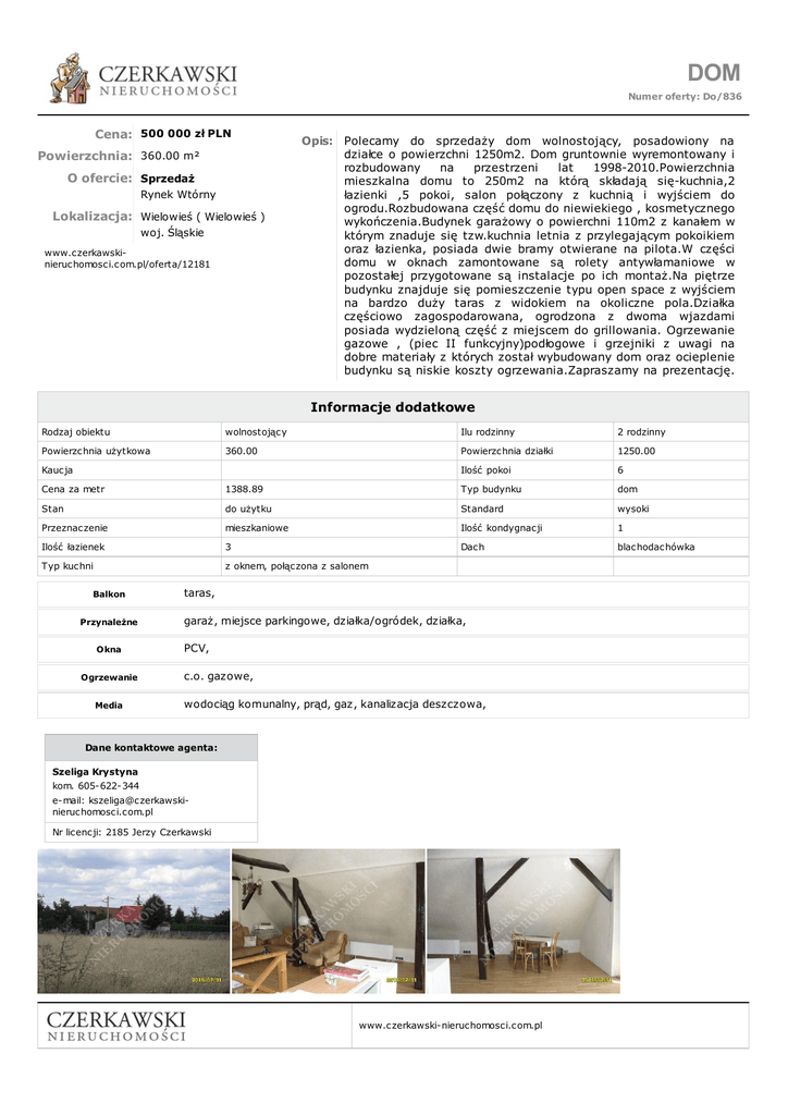 DOM Numer oferty: Do/836 Cena: 500 000 zł PLN Powierzchnia: 360.00 m² O ofercie: Sprzedaż Rynek Wtórny Lokalizacja: Wielowieś ( Wielowieś ) woj. Śląskie www.czerkawskinieruchomosci.com.pl/oferta/12181 Opis: Polecamy do sprzedaży dom wolnostojący, posadowiony na działce o powierzchni 1250m2. Dom gruntownie wyremontowany i rozbudowany na przestrzeni lat 1998-2010.Powierzchnia mieszkalna domu to 250m2 na którą składają się-kuchnia,2 łazienki ,5 pokoi, salon połączony z kuchnią i wyjściem do ogrodu.Rozbudowana część domu do niewiekiego , kosmetycznego wykończenia.Budynek garażowy o powierchni 110m2 z kanałem w którym znaduje się tzw.kuchnia letnia z przylegającym pokoikiem oraz łazienka, posiada dwie bramy otwierane na pilota.W części domu w oknach zamontowane są rolety antywłamaniowe w pozostałej przygotowane są instalacje po ich montaż.Na piętrze budynku znajduje się pomieszczenie typu open space z wyjściem na bardzo duży taras z widokiem na okoliczne pola.Działka częściowo zagospodarowana, ogrodzona z dwoma wjazdami posiada wydzieloną część z miejscem do grillowania. Ogrzewanie gazowe , (piec II funkcyjny)podłogowe i grzejniki z uwagi na dobre materiały z których został wybudowany dom oraz ocieplenie budynku są niskie koszty ogrzewania.Zapraszamy na prezentację. Informacje dodatkowe Rodzaj obiektu wolnostojący Ilu rodzinny 2 rodzinny Powierzchnia użytkowa 360.00 Powierzchnia działki 1250.00 Ilość pokoi 6 Kaucja Cena za metr 1388.89 Typ budynku dom Stan do użytku Standard wysoki Przeznaczenie mieszkaniowe Ilość kondygnacji 1 Ilość łazienek 3 Dach blachodachówka Typ kuchni z oknem, połączona z salonem Balkon Przynależne Okna Ogrzewanie Media taras, garaż, miejsce parkingowe, działka/ogródek, działka, PCV, c.o. gazowe, wodociąg komunalny, prąd, gaz, kanalizacja deszczowa, Dane kontaktowe agenta: Szeliga Krystyna kom. 605-622-344 e-mail: [email protected] Nr licencji: 2185 Jerzy Czerkawski www.czerkawski-nieruchomosci.com.pl