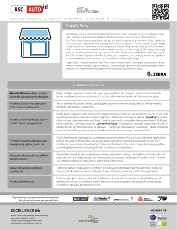 Białołęcka 158E • 03-253 Warszawa • tel.: +48+48 22 510 14 40 • fax: +48+48 22 741 69 33 • hotline 24h:24h: +48+48 22 510 14 79 • e-mail: [email protected] • www.rscautoid.pl Białołęcka 158E • 03-253 Warszawa • tel.: 22 510 14 40 • fax: 22 741 69 33 • hotline 22 510 14 79 • e-mail: [email protected] • www.rscautoid.pl AppGallery INTERMEC INTERMECPC23D PC23D Wyjątkowy sklep z aplikacjami dla przedsiębiorstw, który pozwala łatwo wyszukiwać, kupować, wdrażać i aktualizować aplikacje dla komputerów przenośnych Zebra dla firm. Drukarka Intermec PC23d jestjest małym gabarytowo urządzeniem, które nadaje sięsię dodo Drukarka Intermec PC23d małym gabarytowo urządzeniem, które nadaje Czy Twoi klienci zamierzają kupić, czy też już kupili urządzenia przenośne Zebra, zależy im wielu zastosowań, gdzie najczęściej potrzebna jest mniejsza ilość etykiet czy też opawielu zastosowań, gdzie najczęściej potrzebna jest mniejsza ilość etykiet czy też opana znalezieniu odpowiednich aplikacji dla swoich urządzeń – takich, dzięki którym będą sek. Drukarka PC23d jest prosta ww obsłudze. Posiada wbudowany wyświetlacz LCD. sek. Drukarka PC23d jest prosta obsłudze. Posiada wbudowany wyświetlacz LCD. mogli umożliwić swoim pracownikom pracę z maksymalną wydajnością, podnieść efektywność działań w firmie i wyeliminować błędy w pracy, a także osiągnąć jak najwyższą stopę zwrotu z inwestycji firmy w urządzenia przenośne Zebra. A po znalezieniu właściwych aplikacji Twoi klienci będą musieli kupić, wdrożyć i zapewnić dystrybucję aktualizacji aplikacji w odpowiednim czasie. Wszystko to umożliwi im sklep AppGallery. INTERMEC PC23D AppGallery – prosty sposób, aby Twoi klienci korporacyjni używający komputerów przenośnych mogli znaleźć, kupić, wdrożyć i aktualizować aplikacje dla przedsiębiorstw, które pozwolą im maksymalnie wykorzystywać komputery przenośne Zebra. SPECYFIKACJA TECHNICZNA SPECYFIKACJA TECHNICZNA Metoda Druku Metoda Druku Max. szer. druku Max. szer. druku Max długość druku Max długość druku Termiczna Termiczna 5454 mm mm 5656 mm mm 1727 mm 1727 mm CHARAKTERYSTYKA 900 mm 900 mm Standardowe Standardowe Zegar Czasu Rzeczywistego (RTC) Zegar Czasu Rzeczywistego (RTC) wyposażenie wyposażenie Mając dostęp w jednym miejscu do całej gamy aplikacji do naszych urządzeń przenośnych, Galeria Główna: sklep z aplikaPrędkość druku Prędkość druku 8 dots/mm cjami do zastosowań mobilnych 8 dots/mmłatwo znajdziesz, ocenisz przydatność i kupisz12odpowiednie dots/mm 12 dots/mm aplikacje klasy korporacyjnej. Rozdzielczość Rozdzielczość 203 dpi 203 dpi Prostota użycia i wyczerpujące 6060 mm mm Max. szer. etykiety Max. szer. etykiety informacje o aplikacjach Komunikacja Komunikacja 300dpi 300dpi Ten w pełni funkcjonalny sklep z aplikacjami pozwala klientom przeszukiwać ofertę według kategorii lub rodzaju urządzenia. Standardowo: USB 2.0, USB Host Opcjonalnie: Serial, parallel, WiFi, Bluetooth Standardowo: USB 2.0, USB Host Opcjonalnie: Serial, parallel, WiFi, Bluetooth Każda aplikacja przechodzi testowanie bezpieczeństwa, w którym sprawdzamy, czy nie ma w nich PL,PL, Fingerprint, ZSim (ZPLII Simulation), (EPL2 Simulation), DSim (DPL Fingerprint, ZSim (ZPLII Simulation), ESim (EPL2 Simulation), DSim (DPL status „Zgodna” (CompaFirmware Firmware złośliwego oprogramowania iESim innych zagrożeń. Aplikacje posiadające Przetestowane aplikacje, którym Simulation), XML enabled for SAP® AII and Oracle® WMS Simulation), XML enabled for SAP® AII and Oracle® WMS tible) zostały przetestowane pod kątem pełnej zgodności z urządzeniem przenośnym. Aplikacje, TwoimWewn. klienci mogą zaufać które uzyskały najwyższy poziom „Zweryfikowana” (Validation), przeszły wszechstronne testy średnica Wewn. średnica 12,7mm(1/2”); 26mm (1”) 12,7mm(1/2”); 26mm (1”) rolki taśmy każdej funkcji wykorzystywanej w aplikacji – takich jak skanowanie i roaming – dając klientom rolki taśmy pewność, że aplikacja zapewni pracownikom ich firmy optymalną funkcjonalność. Max. długość taśmy Max. długość taśmy 91,1m lub 274,32m 91,1m lub 274,32m 2,36” – 4,33” Szerokość taśmy 2,36” – 4,33” Szerokość taśmy Twoi klienci mogą udostępniać swoim pracownikom pełną ofertę z Galerii Głównej AppGallery, 128MB Flash memory, 128MB SDRAM (opcjonalnie dodo 32GB) 128MB Flash memory, 128MB SDRAM (opcjonalnie 32GB) Pamięć wbudowana Pamięć wbudowana Tworzenie galerii ułatwiających jednak dla większych klientów korporacyjnych prawdziwy potencjał AppGallery kryje się w możliwości tworzenia indywidualnych firmowych Galerii, które upraszczają dystrybucję aplikadystrybucję aplikacji w firmie Fonty wbudowane Fonty wbudowane 1212 Monotype True Type fonts i 4i bitmap fonts (tylko IPL) Monotype True Type fonts 4 bitmap fonts (tylko IPL) cji wśród pracowników oraz programów kupionych w AppGallery. 1D1D - wszystkie główne kody jednowymiarowe - wszystkie główne kody jednowymiarowe 2D Aztec, Code 16K, Code 49, Data Dot Code, EAN-8, EAN-13, EAN.UCC 128, Grid Matrix, Drukowane kody Drukowane kody 2D - Aztec,AppGallery Code 16K,znajduje Code 49, Data Matrix, Dot Code, EAN-8, EAN-13, EAN.UCC 128, Grid Matrix, się naMatrix, głównym ekranie wszystkich naszych urządzeń przenośnych i dlaWygodny dostęp dla wszystkich HIBC 39, HIBC 128, MaxiCode, MSI, PDF417, Micro PDF417, Planet, Plessey, Postnet, QR-Code, HIBC 39, HIBC 128, MaxiCode, MSI, PDF417, Micro PDF417, Planet, Plessey, Postnet, QR-Code, RSS-14 tego pracownicy mają dostęp do wszystkich potrzebnych aplikacji w każdej chwili –RSS-14 wystarużytkowników 5 –5 40˚C Temperatura – 40˚C czy dotknąć ekranu w AppGallery lub w Galerii firmowej. Temperatura 10-80 %% bez kondensacji Wilgotność 10-80 bez kondensacji Wilgotność Administratorzy AppGallery w firmach otrzymują ele