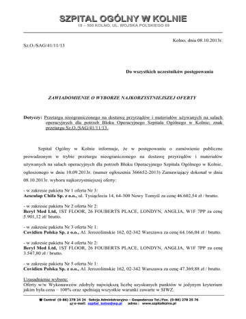 SZPITAL OGÓLNY W KOLNIE 18 – 500 KOLNO, UL. WOJSKA POLSKIEGO 69 Kolno, dnia 08.10.2013r. Sz.O./SAG/41/11/13 Do wszystkich uczestników postępowania ZAWIADOMIENIE O WYBORZE NAJKORZYSTNIEJSZEJ OFERTY Dotyczy: Przetargu nieograniczonego na dostawę przyrządów i materiałów używanych na salach operacyjnych dla potrzeb Bloku Operacyjnego Szpitala Ogólnego w Kolnie; znak przetargu Sz.O./SAG/41/11/13. Szpital Ogólny w Kolnie informuje, że w postępowaniu o zamówienie publiczne prowadzonym w trybie przetargu nieograniczonego na dostawę przyrządów i materiałów używanych na salach operacyjnych dla potrzeb Bloku Operacyjnego Szpitala Ogólnego w Kolnie, ogłoszonego w dniu 10.09.2013r. (numer ogłoszenia 366652-2013) Zamawiający dokonał w dniu 08.10.2013r. wyboru najkorzystniejszej oferty: - w zakresie pakietu Nr 1 oferta Nr 3: Aesculap Chifa Sp. z o.o., ul. Tysiąclecia 14, 64-300 Nowy Tomyśl za cenę 46.602,54 zł / brutto. - w zakresie pakietu Nr 2 oferta Nr 2: Beryl Med Ltd, 1ST FLOOR, 26 FOUBERTS PLACE, LONDYN, ANGLIA, W1F 7PP za cenę 5.901,12 zł/ brutto. - w zakresie pakietu Nr 3 oferta Nr 1: Covidien Polska Sp. z o.o., Al. Jerozolimskie 162, 02-342 Warszawa za cenę 64.166,04 zł / brutto. - w zakresie pakietu Nr 4 oferta Nr 2: Beryl Med Ltd, 1ST FLOOR, 26 FOUBERTS PLACE, LONDYN, ANGLIA, W1F 7PP za cenę 3.547,80 zł / brutto. - w zakresie pakietu Nr 5 oferta Nr 1: Covidien Polska Sp. z o.o., Al. Jerozolimskie 162, 02-342 Warszawa za cenę 47.369,88 zł / brutto. Uzasadnienie wyboru: Oferty w/w Wykonawców zdobyły największą liczbę uzyskanych punktów w jedynym kryterium jakim była cena – 100% oraz spełniają wszystkie warunki zawarte w SIWZ. Central (0-86) 278 24 24 Sekcja Administracyjno – Gospodarcza Tel./Fax. (0-86) 278 25 76 e-mail: [email protected] adres : www.szpitalkolno.pl SZPITAL OGÓLNY W KOLNIE 18 – 500 KOLNO, UL. WOJSKA POLSKIEGO 69 Zgodnie z art. 92 ust. 1 pkt. 1 ustawy Prawo zamówień publicznych, Zamawiający podaje nazwy (firmy), albo imina i nazwiska, siedziby albo miejsca zamieszkania i adresy wykonawców, którzy złożyli oferty, a także punktację przyznaną ofertom w każdym kryterium oceny ofert i łączną punktację: Pakiet Nr 1 Aesculap Chifa Sp. z o.o., ul. Tysiąclecia 14, 64-300 Nowy Tomyśl – oferta Nr 3. Liczba pkt. w kryterium cena – 100 pkt. Razem: 100 pkt. Pakiet Nr 2 Beryl Med Ltd, 1ST FLOOR, 26 FOUBERTS PLACE, LONDYN, ANGLIA, W1F 7PP – oferta Nr 2. Liczba pkt. w kryterium cena – 100 pkt. Razem: 100 pkt. Pakiet Nr 3 Covidien Polska Sp. z o.o., Al. Jerozolimskie 162, 02-342 Warszawa – oferta Nr 1. Liczba pkt. w kryterium cena – 100 pkt. Razem: 100 pkt. Pakiet Nr 4 Beryl Med Ltd, 1ST FLOOR, 26 FOUBERTS PLACE, LONDYN, ANGLIA, W1F 7PP – oferta Nr 2. Liczba pkt. w kryterium cena – 100 pkt. Razem: 100 pkt. Pakiet Nr 5 Covidien Polska Sp. z o.o., Al. Jerozolimskie 162, 02-342 Warszawa – oferta Nr 1. Liczba pkt. w kryterium cena – 100 pkt. Razem: 100 pkt. Jednocześnie Szpital Ogólny w Kolnie zawiadamia zgodnie z art. 92 ust. 1 pkt. 4 ustawy z dnia 29 stycznia 2004 roku Prawo zamówień publicznych ( tekst jednolity - Dz. U. z 2013r. poz. 907), że umowa w sprawie zamówienia publicznego z zastrzeżeniem art. 183 ustawy w/w może być zawarta po dniu 13.10.2013r. - podstawa art. 94 ust.1 pkt. 2 ustawy Prawo zamówień publicznych. Do wiadomości: Wykonawcy, którzy złożyli oferty. Treść ogłoszenia obwieszczono: - tablica ogłoszeń Szpitala Ogólnego w Kolnie - strona internetowa Zamawiającego – www.szpitalkolno.pl Central (0-86) 278 24 24 Sekcja Administracyjno – Gospodarcza Tel./Fax. (0-86) 278 25 76 e-mail: [email protected] adres : www.szpitalkolno.pl