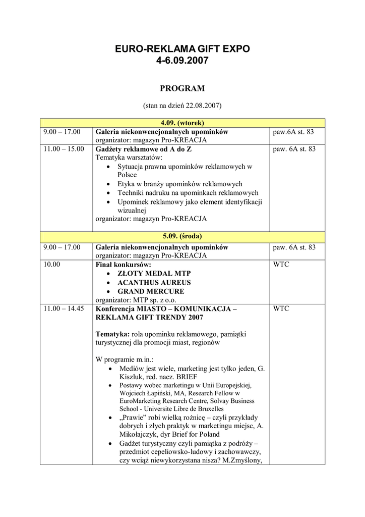 EURO-REKLAMA GIFT EXPO 4-6.09.2007 PROGRAM (stan na dzień 22.08.2007) 9.00 – 17.00 11.00 – 15.00 4.09. (wtorek) Galeria niekonwencjonalnych upominków organizator: magazyn Pro-KREACJA Gadżety reklamowe od A do Z Tematyka warsztatów: • Sytuacja prawna upominków reklamowych w Polsce • Etyka w branży upominków reklamowych • Techniki nadruku na upominkach reklamowych • Upominek reklamowy jako element identyfikacji wizualnej organizator: magazyn Pro-KREACJA paw.6A st. 83 paw. 6A st. 83 5.09. (środa) 9.00 – 17.00 10.00 11.00 – 14.45 Galeria niekonwencjonalnych upominków organizator: magazyn Pro-KREACJA Finał konkursów: • ZŁOTY MEDAL MTP • ACANTHUS AUREUS • GRAND MERCURE organizator: MTP sp. z o.o. Konferencja MIASTO – KOMUNIKACJA – REKLAMA GIFT TRENDY 2007 Tematyka: rola upominku reklamowego, pamiątki turystycznej dla promocji miast, regionów W programie m.in.: • Mediów jest wiele, marketing jest tylko jeden, G. Kiszluk, red. nacz. BRIEF • • • Postawy wobec marketingu w Unii Europejskiej, Wojciech Łapiński, MA, Research Fellow w EuroMarketing Research Centre, Solvay Business School - Universite Libre de Bruxelles „Prawie” robi wielką rożnicę – czyli przykłady dobrych i złych praktyk w marketingu miejsc, A. Mikołajczyk, dyr Brief for Poland Gadżet turystyczny czyli pamiątka z podróży – przedmiot cepeliowsko-ludowy i zachowawczy, czy wciąż niewykorzystana nisza? M.Zmyślony, paw. 6A st. 83 WTC WTC • • • • 9.00 – 17.00 12.00 dyrektor kreatywny, Grupa ESKADRA Uściski z Warszawy. Pożytki z konkursów dla młodych dizajnerów na wybranych przykładach, B. Świątkowska, prez. Fundacji Nowej Kultury BĘC ZMIANA Niekonwencjonalne rozwiązania w dziedzinie upominków reklamowych, magazyn ProKREACJA Ogłoszenie konkursu na gadżet promujący turystykę rowerową w Wielkopolsce, Wielkopolska Organizacja Turystyczna Panel Dyskusyjny organizatorzy: Brief, Brief for Poland, MTP sp. z o.o. 6.09. (czwartek) Galeria niekonwencjonalnych upominków organizator: magazyn Pro-KREACJA Finał konkursu na najbardziej niekonwencjonalny gadżet targów Euro-Reklama GIFT EXPO 2007 Organizator: magazyn Pro-KREACJA paw. 6A st. 83 paw. 6A st. 83
