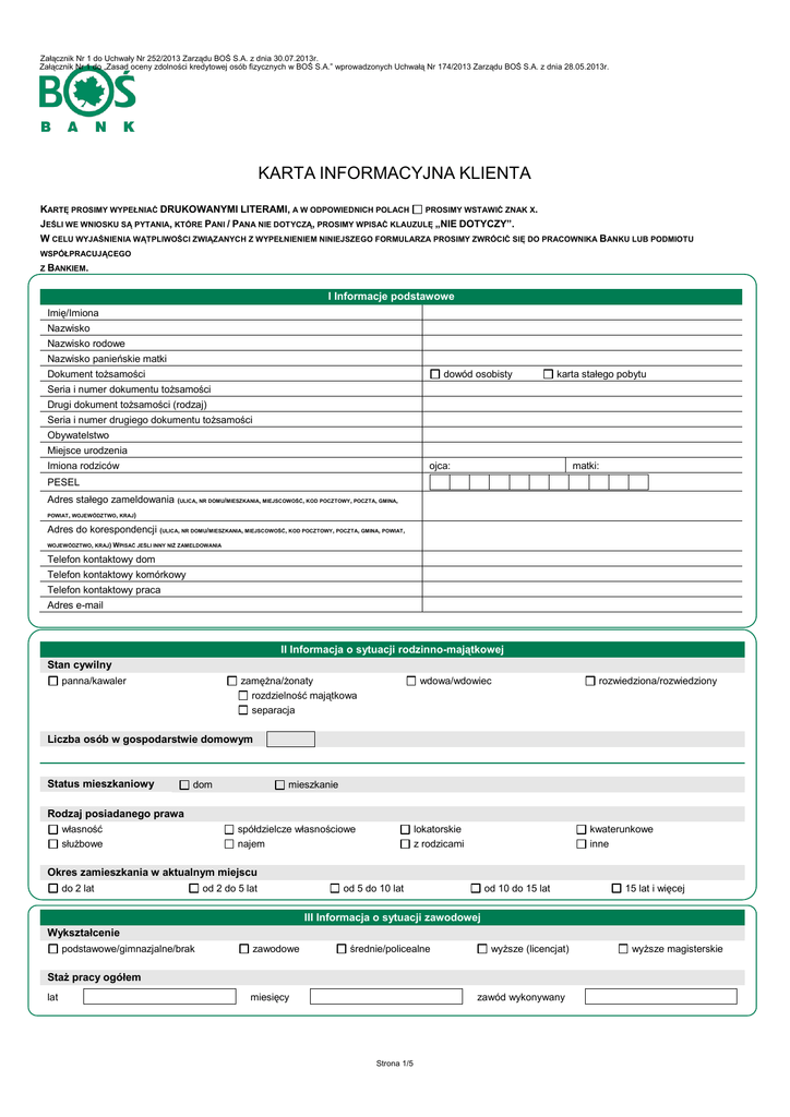 Załącznik Nr 1 do Uchwały Nr 252/2013 Zarządu BOŚ S.A. z dnia 30.07.2013r. Załącznik Nr 1 do „Zasad oceny zdolności kredytowej osób fizycznych w BOŚ S.A.” wprowadzonych Uchwałą Nr 174/2013 Zarządu BOŚ S.A. z dnia 28.05.2013r. KARTA INFORMACYJNA KLIENTA KARTĘ PROSIMY WYPEŁNIAĆ DRUKOWANYMI LITERAMI, A W ODPOWIEDNICH POLACH PROSIMY WSTAWIĆ ZNAK X. JEŚLI WE WNIOSKU SĄ PYTANIA, KTÓRE PANI / PANA NIE DOTYCZĄ, PROSIMY WPISAĆ KLAUZULĘ „NIE DOTYCZY”. W CELU WYJAŚNIENIA WĄTPLIWOŚCI ZWIĄZANYCH Z WYPEŁNIENIEM NINIEJSZEGO FORMULARZA PROSIMY ZWRÓCIĆ SIĘ DO PRACOWNIKA BANKU LUB PODMIOTU WSPÓŁPRACUJĄCEGO Z BANKIEM. I Informacje podstawowe Imię/Imiona Nazwisko Nazwisko rodowe Nazwisko panieńskie matki Dokument tożsamości dowód osobisty karta stałego pobytu Seria i numer dokumentu tożsamości Drugi dokument tożsamości (rodzaj) Seria i numer drugiego dokumentu tożsamości Obywatelstwo Miejsce urodzenia Imiona rodziców ojca: matki: PESEL Adres stałego zameldowania (ULICA, NR DOMU/MIESZKANIA, MIEJSCOWOŚĆ, KOD POCZTOWY, POCZTA, GMINA, POWIAT, WOJEWÓDZTWO, KRAJ) Adres do korespondencji (ULICA, NR DOMU/MIESZKANIA, MIEJSCOWOŚĆ, KOD POCZTOWY, POCZTA, GMINA, POWIAT, WOJEWÓDZTWO, KRAJ) WPISAĆ JEŚLI INNY NIŻ ZAMELDOWANIA Telefon kontaktowy dom Telefon kontaktowy komórkowy Telefon kontaktowy praca Adres e-mail II Informacja o sytuacji rodzinno-majątkowej Stan cywilny zamężna/żonaty rozdzielność majątkowa separacja panna/kawaler wdowa/wdowiec rozwiedziona/rozwiedziony Liczba osób w gospodarstwie domowym Status mieszkaniowy dom mieszkanie Rodzaj posiadanego prawa własność służbowe spółdzielcze własnościowe najem lokatorskie z rodzicami kwaterunkowe inne Okres zamieszkania w aktualnym miejscu do 2 lat od 2 do 5 lat od 5 do 10 lat od 10 do 15 lat 15 lat i więcej III Informacja o sytuacji zawodowej Wykształcenie podstawowe/gimnazjalne/brak zawodowe średnie/policealne wyższe (licencjat) Staż pracy ogółem lat miesięcy zawód wykonywany Strona 1/5 wyższe magisterskie IV Informacja o sytuacji finansowej Okres zatrudnienia u obecnego pracodawcy / prowadzenia działalności w danej branży (lata i miesiące) Źródło dochodu Wysokość średniego m-cznego dochodu netto Zatrudnienie na czas nieokreślony za ost. 3 m-ce Zatrudnienie na czas określony (data) od do za ost. 3 m-ce Działalność gospodarcza: Księga przychodów i rozchodów lub księga rachunkowa -- za ost. 12 m-cy Ryczałt ewidencjonowany -- za ost. 12 m-cy Karta podatkowa -- za ost. 12 m-cy Renta (data) od Emerytura do za ost. m-c -- za ost. m-c Dział specjalny prod. rolnej za ost. 12 m-cy Rolnictwo za ost. 12 m-cy Wolny zawód za ost. 12 m-cy Kontrakt za ost. 6 m-cy Brak źródła dochodu -- -- Najem, dzierżawa nieruchomości -- za ost. 12 m-cy Umowy zlecenia umowy o dzieło -- za ost. 12 m-cy Inne (jakie?) -- za ost. 12 m-cy Dane pracodawcy Adres siedziby pracodawcy Nr NIP REGON Adres zatrudnienia wnioskodawcy Częstotliwość uzyskiwania głównego dochodu rocznie tygodniowo półrocznie codziennie miesięcznie nieznane kwartalnie inne co dwa tygodnie Pracodawca o najdłuższym okresie uzyskiwania dochodu jednostka samorządowa prywatna firma – os. prawna administracja państwowa spółdzielnia firma państwowa nie dotyczy prywatna firma – os.fiz. inne (jakie?) Obciążenia dochodu (kwota w skali miesiąca) czynsz, CO, gaz, energia elektryczna opłaty alimenty inne zobowiązania POSIADANE RACHUNKI BANKOWE: Rodzaj (ROR, rach. oszczędnościowe, lokaty, inne) Bank Waluta (nie dot. ROR) Okres posiadania (lata, miesiące) Okres jaki upłynął od otwarcia pierwszego rachunku bankowego typu ROR: nie posiada od 2 lat do mniej niż 5 lat mniej niż 6 m-cy od 5 lat i więcej od 6 m-cy do mniej niż 1 rok Posiadane ubezpieczenia indywidualne na życie Nazwa ubezpieczyciela : nieruchomości Nazwa ubezpieczyciela : POSIADANY MAJĄTEK Rodzaj nieruchomości (grunt, dom, mieszkanie, inne) Adres Strona 2/5 od 1 roku do mniej niż 2 lata ZOBOWIĄZANIA FINANSOWE, W TYM ZACIĄGNIĘTE NA DZIAŁALNOŚĆ GOSPODARCZĄ: ZACIĄGNIĘTE I WNIOSKOWANE KREDYTY/POŻYCZKI (PROSZĘ PODAĆ WSZYSTKIE KREDYTY I POŻYCZKI POZA LIMITAMI KREDYTOWYMI) Rodzaj kredytu/pożyczki Nazwa banku / instytucji Pozostała do spłaty kwota i waluta zaciągniętego/wnioskowanego kredytu/pożyczki Miesięczna spłata (kwota i waluta) Data wygaśnięcia posiadanego lub wnioskowanego zobowiązania PRZYZNANE LIMITY KREDYTOWE (LIMITY W ROR, KARTY KREDYTOWE, KARTY Z ODROCZONYM TERMINEM PŁATNOŚCI) Nazwa banku / instytucji Rodzaj limitu Kwota i waluta limitu Od kiedy posiadana jest karta kredytowa mniej niż 12 m-cy od 48 m-cy i więcej nie posiada od 36 do mniej niż 48 m-cy od 12 do mniej niż 24 m-cy od 24 do mniej niż 36 m-cy UDZIELONE PORĘCZENIA: Rodzaj kredytu/pożyczki/karty/ limitu Nazwa banku / instytucji Kwota kredytu/pożyczki pozostała do spłaty, kwota udzielonego limitu Miesięczna spłata (kwota i waluta) Data wygaśnięcia zobowiązania V Moje powiązania POWIĄZANIA KAPITAŁOWE I ORGANIZACYJNE brak powiązań posiadane powiązania (wymienić poniżej) Nazwa, siedziba i forma prawna podmiotu powiązanego Powiązania kapitałowe (% kapitału/%głosów/stanowiska i funkcje/osoby) REGON/ PESEL Powiązania organizacyjne (stopień pokrewieństwa/rodzaj poręczenia/zależności handlowe) Powiązania z BOŚ SA brak powiązań pracownik akcjonariusz członek organów Banku inne (jakie?) W okresie ostatnich 10 lat złożyłem wniosek o upadłość nie złożyłem wniosku o upadłość ogłoszono moją upadłość nie ogłoszono mojej upadłości VI Zobowiązania finansowe i inne współmałżonka jeżeli nie jest współwnioskodawcą ** Imię / Imiona Nazwisko Nazwisko rodowe matki Pesel Dokument tożsamości Seria i nr Adres stałego zameldowania ZACIĄGNIĘTE I WNIOSKOWANE KREDYTY/POŻYCZKI/ZOBOWIĄZANIA (PROSZĘ PODAĆ WSZYSTKIE KREDYTY, POŻYCZKI, ZOBOWIĄZANIA (NP. ALIMENTACYJNE) POZA LIMITAMI KREDYTOWYMI