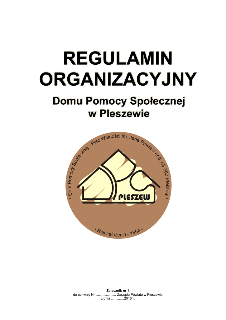 REGULAMIN ORGANIZACYJNY Domu Pomocy Społecznej w Pleszewie Załącznik nr 1 do uchwały Nr ……………… Zarządu Powiatu w Pleszewie z dnia ………...2016 r. SPIS TREŚCI str. I. Postanowienia ogólne ……………...………………………………………………………………………………… II. Zakres działania Domu Pomocy Społecznej w Pleszewie III. Kierownictwo Domu IV. Struktura organizacyjna Domu Pomocy Społecznej w Pleszewie, zakres działania i podział zadań V. Zasady podpisywania dokumentacji VI. Postanowienia końcowe …..…………………………………………………… ………………………………………………………………………………………………….. 4 7 ……… 8 ............................................................................................ 20 ............................................................................................................. 21 Zał. 1 Procedura przyjmowania mieszkańca do Domu Pomocy Społecznej w Pleszewie Zał. 2 Regulamin uprawnień i obowiązków mieszkańca Domu Pomocy Społecznej w Pleszewie Zał. 3 Procedura postępowania w sprawach nieobecności mieszkańca Domu Pomocy Społecznej w Pleszewie Zał. 4 3 …... 24 ..…….. 26 ……………………………………..……….. 31 Procedura odwiedzin mieszkańców i korzystania z pokoju gościnnego Domu Pomocy Społecznej w Pleszewie …………..…………………………….. Zał. 5 Procedura postępowania z depozytami mieszkańców Domu Pomocy Społecznej w Pleszewie Zał. 6 Procedura przyjmowania interesantów oraz załatwiania skarg 33 ..... 35 …………………………………….. 38 i wniosków zgłaszanych przez pracowników i mieszkańców Domu Pomocy Społecznej w Pleszewie oraz inne osoby Zał. 7 Procedura ciągłości kierownictwa Domu Pomocy Społecznej w Pleszewie Zał. 8 Procedura postępowania w razie nieszczęśliwych zdarzeń w Domu Pomocy Społecznej w Pleszewie Zał. 9 ………………………. 40 …………..………………………………………. 41 Procedura postępowania w przypadkach umierania i zgonu mieszkańca Domu Pomocy Społecznej w Pleszewie Zał. 10 ……………………………………….. 47 ……………………………………….. 49 Procedura postępowania z chwilą wystąpienia choroby zakaźnej w Domu Pomocy Społecznej w Pleszewie Zał. 11 Procedura funkcjonowania Samorządu Mieszkańców w Domu Pomocy Społecznej w Pleszewie Zał. 12 Procedura spożywania alkoholu w Domu Pomocy Społecznej w Pleszewie Zał. 13 Procedura palenia tytoniu w Domu Pomocy Społecznej w Pleszewie Zał. 14 Procedura higieny osobistej i przyjmowania leków przez mieszkańców Domu Pomocy Społecznej w Pleszewie .. 50 ………………………. 52 …….…….………………….. 53 ……………………………………….. 54 Zał. 15 Procedura rezygnacji mieszkańca z pobytu w Domu Pomocy Społecznej w Pleszewie Zał. 16 Procedura żywienia w Domu Pomocy Społecznej w Pleszewie …………... 55 …………..………………………... Zał. 17 Procedura ochrony danych osobowych mieszkańców Domu Pomocy Społecznej w Pleszewie 56 Zał. 18 Procedura postępowania z mieszkańcem agresywnym Zał. 19 Procedura zabezpieczenia obiektów Domu Pomocy Społecznej w Pleszewie Zał. 20 Regulamin Pododdziału dla osób uzależnionych od alkoholu Zał. 21 Procedura likwidacji niepodjętych depozytów Zał. 22 Regulamin punktów bibliotecznych Domu Pomocy Społecznej w Pleszewie ….………………….... 67 Zał. 23 Regulamin Dziennego Domu „Senior-Wigor” ……..…….……………………………………………... 68 Zał. 24 Oznaczenia Działów i Stanowisk Pracy dla potrzeb organizacyjnych ………….....………………….. 70 Zał. 25 Struktura organizacyjna Domu Pomocy Społecznej w Pleszewie 71 …. 57 …………….………………………………… 58 …………….……… 60 ……………........……………………. 62 ……………............................................................... 66 ……………..……………………. Strona 2 z 71 ROZDZIAŁ I Postanowienia ogólne §1 Dom Pomocy Społecznej w Pleszewie, zwany dalej „Domem”, działa na podstawie: 1. Statutu nadanego przez Radę Powiatu. 2. Ustawy z dnia 12 marca 2004 r. o pomocy społecznej (Dz. U. z 2016 r., poz. 930 z późniejszymi zmianami). 3. Rozporządzenia Ministra Pracy i Polityki Społecznej z dnia 23 sierpnia 2012 r. w sprawie domów pomocy społecznej (Dz. U. z 2012 r., poz. 964). 4. Ustawy z dnia 5 czerwca 1998 r. o samorządzie powiatowym (Dz. U. z 2016 r., poz. 814). 5. Ustawy z dnia 13 listopada 2003 r. o dochodach jednostek samorządu terytorialnego (Dz. U. z 2016 r., poz. 198). 6. Przepisów prawnych dotyczących jednostek organizacyjnych pomocy społecznej, samorządowych jednostek organizacyjnych i jednostek budżetowych. 7. Niniejszego regulaminu. §2 Do zakresu działania Domu należy wykonywanie zadań z zakresu pomocy społecznej, a w szczególności zadań wynikających z: 1. Ustawy z dnia 12 marca 2004 r. o pomocy społecznej (Dz. U. z 2016 r., poz. 930 z późniejszymi zmianami). 2. Ustawy z dnia 19 sierpnia 1994 r. o ochronie zdrowia psychicznego (Dz. U. z 2016 r., poz. 546 z późniejszymi zmianami). 3. Ustawy z dnia 27 sierpnia 1997 r. o rehabilitacji zawodowej i społecznej oraz zatrudnianiu osób niepełnosprawnych (Dz. U. z 2011 r. Nr 127 poz. 721 z późniejszymi zmianami). §3 1. Dom jest jednostką organizacyjną pomocy społecznej podległą Radzie Powiatu. 2. Siedziba Domu mieści się w Pleszewie. §4 1. Dom jest stacjonarną jednostką organizacyjną pomocy społecznej przeznaczoną dla osób dorosłych obojga płci, przewlekle somatycznie chorych oraz przewlekle psychicznie chorych, których stan zdrowia nie wymaga leczenia szpitalnego, a uzasadnia konieczność zapewnien