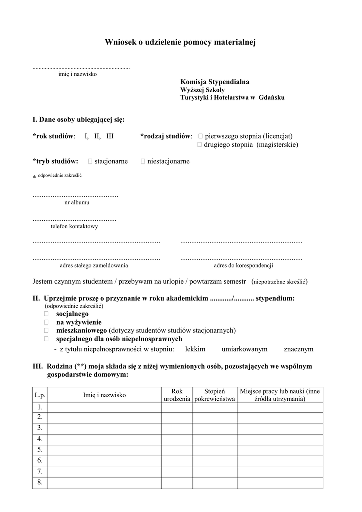 Wniosek o udzielenie pomocy materialnej ................................................................ imię i nazwisko Komisja Stypendialna WyŜszej Szkoły Turystyki i Hotelarstwa w Gdańsku I. Dane osoby ubiegającej się: *rok studiów: *tryb studiów: I, II, III  stacjonarne *rodzaj studiów:  pierwszego stopnia (licencjat)  drugiego stopnia (magisterskie)  niestacjonarne * odpowiednie zakreślić ............................................... nr albumu .............................................. telefon kontaktowy ...................................................................... ................................................................... ...................................................................... ................................................................... adres stałego zameldowania adres do korespondencji Jestem czynnym studentem / przebywam na urlopie / powtarzam semestr (niepotrzebne skreślić) II. Uprzejmie proszę o przyznanie w roku akademickim ............/........... stypendium: (odpowiednie zakreślić)     socjalnego na wyŜywienie mieszkaniowego (dotyczy studentów studiów stacjonarnych) specjalnego dla osób niepełnosprawnych - z tytułu niepełnosprawności w stopniu: lekkim umiarkowanym znacznym III. Rodzina (**) moja składa się z niŜej wymienionych osób, pozostających we wspólnym gospodarstwie domowym: L.p. 1. 2. 3. 4. 5. 6. 7. 8. Imię i nazwisko Rok Stopień Miejsce pracy lub nauki (inne urodzenia pokrewieństwa źródła utrzymania) IV. Dane dotyczące dochodu w rodzinie: 1. Łączna kwota alimentów świadczonych na rzecz innych osób wyniosła w roku ........... *) ............ zł 2. Łączna kwota opłat poniesionych z tytułu przebywania członka rodziny w instytucji zapewniającej całodobowe utrzymanie w roku ........... *) ........ .... zł 3. Dochód utracony w roku ............. *) wyniósł ............. zł miesięcznie 4. Dochód uzyskany w roku ............. *) wyniósł ............. zł miesięcznie *) Wpisać rok, z którego dochód stanowi podstawę ustalenia dochodu rodziny. V. Dokumenty dołączone do wniosku: 1. ........................................................................................................................................ 2. ........................................................................................................................................ 3. ........................................................................................................................................ 4. ........................................................................................................................................ 5. ......................................................................................................................................... 6. ......................................................................................................................................... 7. ......................................................................................................................................... VI. Oświadczenia: 1. Oświadczam, Ŝe nie prowadzę/ prowadzę wspólnego gospodarstwa domowego z rodzicami lub jednym z nich. (odpowiednie podkreślić) 2. Oświadczam, Ŝe studiuję tylko na jednym kierunku i nie ubiegam się o przyznanie ani nie pobieram stypendium socjalnego w innej uczelni. 3. Oświadczam, Ŝe zapoznałem/am się z zasadami i warunkami przyznawania stypendiów: socjalnego, mieszkaniowego i na wyŜywienie oraz, Ŝe podane wyŜej informacje są kompletne i zgodne ze stanem faktycznym. Pouczenie: podanie nieprawdziwych danych podlega odpowiedzialności karnej zgodnie z art. 233 Kodeksu karnego i odpowiedzialności dyscyplinarnej z art. 211 ustawy Prawo o szkolnictwie wyŜszym z dnia 27 lipca 2005 roku, do wydalenia włącznie. Podanie o przesyłanie stypendium na konto bankowe bądź przeksięgowanie na poczet czesnego naleŜy składać oddzielnie w Kwesturze. (druki do pobrania w Kwesturze, w Dziekanacie bądź na stronie internetowej we wzorach podań). Data: ................................................................ ................................................................. (podpis studenta) **/ Ilekroć mówi się o rodzinie oznacza to odpowiednio następujących członków rodziny: a) studenta; b) małŜonka studenta, a takŜe będące na utrzymaniu studenta lub jego małŜonka dzieci niepełnoletnie, dzieci pobierające naukę do 26. roku Ŝycia, a jeŜeli 26. rok Ŝycia przypada w ostatnim roku studiów, do ich ukończenia, oraz dzieci niepełnosprawne bez względu na wiek; c) rodziców, opiekunów prawnych lub faktycznych studenta i będące na ich utrzymaniu dzieci niepełnoletnie, dzieci pobierające naukę do 26. roku Ŝycia, a jeŜeli 26. rok Ŝycia przypada w ostatnim roku studiów, do ich ukończenia, oraz dzieci niepełnosprawne bez względu na wiek. Osób wymienionych w pkt c) nie wlicza się do rodziny jeŜeli student jest samodzielny finansowo. Student jest samodzielny finansowo, jeŜeli on lub jego małŜonek spełnia łącznie następujące warunki: a) posiadał stałe źródło dochodów w ostatnim roku podatkowym; b) posiada stałe źródło dochodów w roku bieŜącym; c) jego miesięczny dochód w okresach, o których mowa w pkt a i b, nie jest mniejszy od minimalnego wynagrodzenia za pracę pracowników ogłaszanego na podstawie przepisów o minimalnym wynagrodzeniu za pracę, obowiązującego w ostatnim miesiącu ostatniego roku podatkowego w przypadku dochodu studenta z ostatniego roku podatkowego i obowiązującego w miesiącu złoŜenia wniosku o przyznanie stypendium (w 2007r. – 936,-zł brutto, w 2008r. – 1.126,-zł brutto, w 2009r. – 1.276,-zł); d) nie złoŜył oświadczenia o prowadzeniu wspólnego gospodarstwa domowego z rodzicami bądź jednym z nich. W opinii Ministerstwa za samodzielnego finansowo moŜe być uznany student, który łącznie z małŜonk