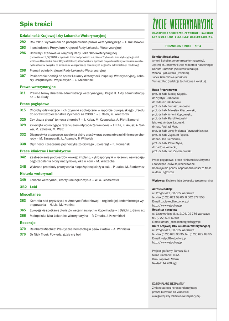 Spis treści Działalność Krajowej Izby Lekarsko-Weterynaryjnej 292 293 296 Rok 2011 wyzwaniem do porządkowania prawa weterynaryjnego – T. Jakubowski II posiedzenie Prezydium Krajowej Rady Lekarsko-Weterynaryjnej Pisma i opinie Krajowej Rady Lekarsko-Weterynaryjnej Posiedzenie Komisji do spraw Lekarzy Weterynarii Inspekcji Weterynaryjnej, Lekarzy Urzędowych i Wojskowych – J. Krzemiński Prawo weterynaryjne 311 Prawne formy działania administracji weterynaryjnej. Część II. Akty administracyjne – M. Rudy Prace poglądowe 315 325 329 332 Choroby odzwierzęce i ich czynniki etiologiczne w raporcie Europejskiego Urzędu do spraw Bezpieczeństwa Żywności za 2008 r. – J. Osek, K. Wieczorek Czy „kozia grypa” to nowa choroba? – J. Kaba, M. Czopowicz, A. Platt-Samoraj Zwierzęta wolno żyjące rezerwuarem Mycobacterium bovis – J. Kita, K. Anusz, A. Salwa, M. Zaleska, M. Welz Diagnostyka atopowego zapalenia skóry u psów oraz ocena obrazu klinicznego choroby – M. Szczepanik, Ł. Adamek, P. Wilkołek 338 Czynności i znaczenie pęcherzyka żółciowego u zwierząt – K. Romański Prace kliniczne i kazuistyczne 342 Zastosowanie podtwardówkowego implantu cyklosporyny A w leczeniu nawracającego zapalenia błony naczyniowej oka u koni – M. Warzecha 345 Wybrane protokoły przerywania niepożądanej ciąży u suk – P. Jurka, M. Słotkowicz Historia weterynarii 349 Lekarze weterynarii, którzy uniknęli Katynia – W. A. Gibasiewicz 352 Leki Miscellanea 363 Kontrola nad pryszczycą w Ameryce Południowej – regionie jej endemicznego występowania – H. Lis, M. Iwanina 365 366 Europejskie spotkanie okulistów weterynaryjnych w Kopenhadze – I. Balicki, J. Garncarz Małopolska Izba Lekarsko-Weterynaryjna – P. Żmuda, J. Krzemiński Recenzje 370 370 ROCZNIK 85 • 2010 • NR 4 Uchwały i stanowiska Krajowej Rady Lekarsko-Weterynaryjnej (Uchwała nr 1 /V/2010 w sprawie treści odpowiedzi na pismo Trybunału Konstytucyjnego dot. wniosku Rzecznika Praw Obywatelskich; stanowisko w sprawie projektu ustawy o zmianie niektórych ustaw w związku ze zmianami w organizacji terenowych organów administracji rządowej) 298 307 CZASOPISMO SPOŁECZNO-ZAWODOWE I NAUKOWE K R A J O W E J I Z B Y L E K A R S K O - W E T E R Y N A R YJ N E J Reinhard Mischke: Praktyczna hematologia psów i kotów – A. Winnicka Dr Nick Trout: Powiedz, gdzie cię boli Komitet Redakcyjny: Antoni Schollenberger (redaktor naczelny), Jędrzej M. Jaśkowski (z-ca redaktora naczelnego), Danuta Trafalska (sekretarz redakcji), Wanda Fijałkowska (redaktor), Jacek Krzemiński (redaktor), Tomasz Kuc (redakcja techniczna i korekta). Rada Programowa: prof. dr hab. Maciej Gajęcki, dr Krystyn Grabowski, dr Tadeusz Jakubowski, prof. dr hab. Tomasz Janowski, prof. dr hab. Mirosław Kleczkowski, prof. dr hab. Antoni Kopczewski, prof. dr hab. Karol Kotowski, lek. wet. Andrzej Lisowski, dr hab. Andrzej Max, prof. dr hab. Jerzy Molenda (przewodniczący), prof. dr hab. Zygmunt Pejsak, dr hab. Jan Siemionek, prof. dr hab. Paweł Sysa, dr Bartosz Winiecki, prof. dr hab. Jan Zwierzchowski. Prace poglądowe, prace kliniczno-kazuistyczne i dotyczące leków są recenzowane. Redakcja nie ponosi odpowiedzialności za treść reklam i ogłoszeń. Wydawca: Krajowa Izba Lekarsko-Weterynaryjna Adres Redakcji: al. Przyjaciół 1, 00-565 Warszawa tel./fax (0 22) 621 09 60, 0 602 377 553 E-mail: [email protected] http://www.vetpol.org.pl Redaktor naczelny: ul. Ciszewskiego 8, p. 2104, 02-786 Warszawa tel. (0 22) 593 60 69 E-mail: [email protected] Biuro Krajowej Izby Lekarsko-Weterynaryjnej al. Przyjaciół 1, 00-565 Warszawa tel./fax (0 22) 628 93 35, tel. (0 22) 622 09 55 E-mail: [email protected] http://www.vetpol.org.pl Projekt graficzny: Tomasz Kuc Skład i łamanie: TEKA Druk i oprawa: MDruk Nakład: 14 700 egz. EGZEMPLARZ BEZPŁATNY Zmianę adresu korespondencyjnego proszę kierować do właściwej okręgowej izby lekarsko-weterynaryjnej.