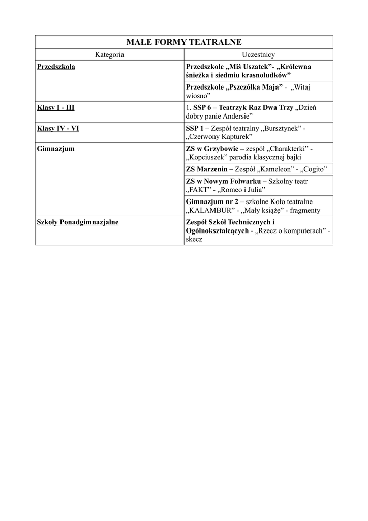 MAŁE FORMY TEATRALNE Kategoria Przedszkola Uczestnicy Przedszkole „Miś Uszatek”- „Królewna śnieżka i siedmiu krasnoludków” Przedszkole „Pszczółka Maja” - „Witaj wiosno” Klasy I - III 1. SSP 6 – Teatrzyk Raz Dwa Trzy „Dzień dobry panie Andersie” Klasy IV - VI SSP 1 – Zespół teatralny „Bursztynek” „Czerwony Kapturek” Gimnazjum ZS w Grzybowie – zespół „Charakterki” „Kopciuszek” parodia klasycznej bajki ZS Marzenin – Zespół „Kameleon” - „Cogito” ZS w Nowym Folwarku – Szkolny teatr „FAKT” - „Romeo i Julia” Gimnazjum nr 2 – szkolne Koło teatralne „KALAMBUR” - „Mały książę” - fragmenty Szkoły Ponadgimnazjalne Zespół Szkół Technicznych i Ogólnokształcących - „Rzecz o komputerach” skecz