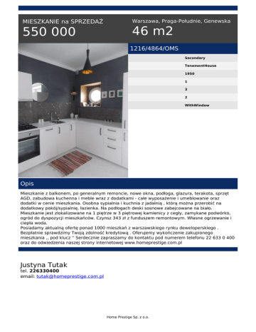 MIESZKANIE na SPRZEDAŻ 550 000 Warszawa, Praga-Południe, Genewska 46 m2 1216/4864/OMS Secondary TenementHouse 1950 1 3 2 WithWindow Opis Mieszkanie z balkonem, po generalnym remoncie, nowe okna, podłoga, glazura, terakota, sprzęt AGD, zabudowa kuchenna i meble wraz z dodatkami - całe wyposażenie i umeblowanie oraz dodatki w cenie mieszkania. Osobna sypialnia i kuchnia z jadalnią , którą można przerobić na dodatkowy pokój/sypialnię, łazienka. Na podłogach deski sosnowe zabejcowane na biało. Mieszkanie jest zlokalizowane na 1 piętrze w 3 piętrowej kamienicy z cegły, zamykane podwórko, ogród do dyspozycji mieszkańców. Czynsz 343 zł z funduszem remontowym. Własne ogrzewanie i ciepła woda. Posiadamy aktualną ofertę ponad 1000 mieszkań z warszawskiego rynku deweloperskiego . Bezpłatnie sprawdzimy Twoją zdolność kredytową . Oferujemy wykończenie zakupionego mieszkania ,, pod klucz '' Serdecznie zapraszamy do kontaktu pod numerem telefonu 22 633 0 400 oraz do odwiedzenia naszej strony internetowej www.homeprestige.com.pl Justyna Tutak tel. 226330400 email: [email protected] Home Prestige Sp. z o.o. Powered by TCPDF (www.tcpdf.org)
