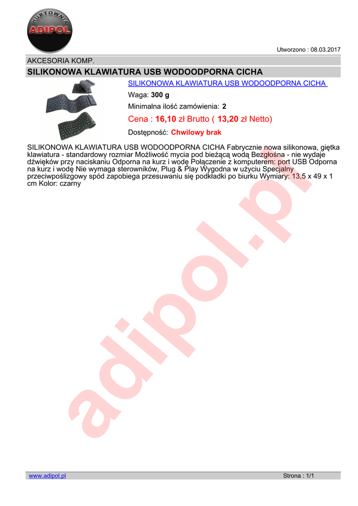 Utworzono : 08.03.2017 AKCESORIA KOMP. SILIKONOWA KLAWIATURA USB WODOODPORNA CICHA SILIKONOWA KLAWIATURA USB WODOODPORNA CICHA Waga: 300 g Minimalna ilość zamówienia: 2 Cena : 16,10 zł Brutto ( 13,20 zł Netto) Dostępność: Chwilowy brak ad ip ol .p l SILIKONOWA KLAWIATURA USB WODOODPORNA CICHA Fabrycznie nowa silikonowa, giętka klawiatura - standardowy rozmiar Możliwość mycia pod bieżącą wodą Bezgłośna - nie wydaje dźwięków przy naciskaniu Odporna na kurz i wodę Połączenie z komputerem: port USB Odporna na kurz i wodę Nie wymaga sterowników, Plug & Play Wygodna w użyciu Specjalny przeciwpoślizgowy spód zapobiega przesuwaniu się podkładki po biurku Wymiary: 13,5 x 49 x 1 cm Kolor: czarny www.adipol.pl Powered by TCPDF (www.tcpdf.org) Strona : 1/1