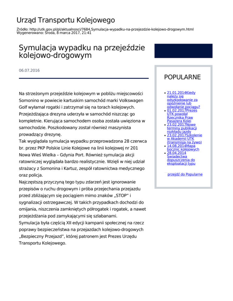 Urząd Transportu Kolejowego Źródło: http://utk.gov.pl/pl/aktualnosci/7684,Symulacja-wypadku-na-przejezdzie-kolejowo-drogowym.html Wygenerowano: Środa, 8 marca 2017, 21:41 Symulacja wypadku na przejeździe kolejowo-drogowym 06.07.2016 POPULARNE Na strzeżonym przejeździe kolejowym w pobliżu miejscowości ● Somonino w powiecie kartuskim samochód marki Volkswagen Golf wyłamał rogatki i zatrzymał się na torach kolejowych. ● Przejeżdżająca drezyna uderzyła w samochód niszcząc go kompletnie. Kierująca samochodem osoba została uwięziona w samochodzie. Poszkodowany został również maszynista prowadzący drezynę. ● ● Tak wyglądała symulacja wypadku przeprowadzona 28 czerwca br. przez PKP Polskie Linie Kolejowe na linii kolejowej nr 201 ● Nowa Wieś Wielka – Gdynia Port. Również symulacja akcji ● ratowniczej wyglądała bardzo realistycznie. Wzięli w niej udział 21.01.2014Kiedy należy się odszkodowanie za opóźnienie lub odwołanie pociągu? 01.02.2017Prezes UTK powołał Rzecznika Praw Pasażera Kolei 23.02.2017Nowe terminy publikacji rozkładu jazdy 23.02.2017Szkolenie w Akademii UTK (transmisja na żywo) 14.08.2014Mapa bocznic kolejowych 28.04.2014 Świadectwa dopuszczenia do eksploatacji typu strażacy z Somonina i Kartuz, zespół ratownictwa medycznego oraz policja. Najczęstszą przyczyną tego typu zdarzeń jest ignorowanie przepisów o ruchu drogowym i próba przejechania przejazdu przed zbliżającym się pociągiem mimo znaków „STOP” i sygnalizacji ostrzegawczej. W takich przypadkach dochodzi do omijania, niszczenia zamkniętych półrogatek i rogatek, a nawet przejeżdżania pod zamykającymi się szlabanami. Symulacja była częścią XII edycji kampanii społecznej na rzecz poprawy bezpieczeństwa na przejazdach kolejowo-drogowych „Bezpieczny Przejazd”, której patronem jest Prezes Urzędu Transportu Kolejowego. przejdź do Popularne Sceny z symulacji wypadku na przejeździe kolejowym Sceny z symulacji wypadku na przejeździe kolejowym Sceny z symulacji wypadku na przejeździe kolejowym Sceny z symulacji wypadku na przejeździe kolejowym Sceny z symulacji wypadku na przejeździe kolejowym Sceny z symulacji wypadku na przejeździe kolejowym Sceny z symulacji wypadku na przejeździe kolejowym