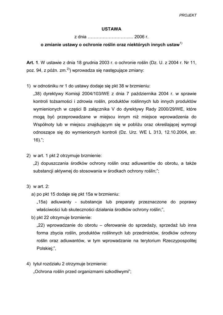 PROJEKT USTAWA z dnia ……………………….... 2006 r. o zmianie ustawy o ochronie roślin oraz niektórych innych ustaw1) Art. 1. W ustawie z dnia 18 grudnia 2003 r. o ochronie roślin (Dz. U. z 2004 r. Nr 11, poz. 94, z późn. zm.2)) wprowadza się następujące zmiany: 1) w odnośniku nr 1 do ustawy dodaje się pkt 38 w brzmieniu: „38) dyrektywy Komisji 2004/103/WE z dnia 7 października 2004 r. w sprawie kontroli toŜsamości i zdrowia roślin, produktów roślinnych lub innych produktów wymienionych w części B załącznika V do dyrektywy Rady 2000/29/WE, które mogą być przeprowadzane w miejscu innym niŜ miejsce wprowadzenia do Wspólnoty lub w miejscu znajdującym się w pobliŜu oraz określającej wymogi odnoszące się do wymienionych kontroli (Dz. Urz. WE L 313, 12.10.2004, str. 16).”; 2) w art. 1 pkt 2 otrzymuje brzmienie: „2) dopuszczania środków ochrony roślin oraz adiuwantów do obrotu, a takŜe substancji aktywnej do stosowania w środkach ochrony roślin;”; 3) w art. 2: a) po pkt 15 dodaje się pkt 15a w brzmieniu: „15a) adiuwanty - substancje lub preparaty przeznaczone do poprawy właściwości lub skuteczności działania środków ochrony roślin;”, b) pkt 22 otrzymuje brzmienie: „22) wprowadzanie do obrotu – oferowanie do sprzedaŜy, sprzedaŜ lub inna forma zbycia roślin, produktów roślinnych lub przedmiotów, środków ochrony roślin oraz adiuwantów, w tym wprowadzanie na terytorium Rzeczypospolitej Polskiej;”, 4) tytuł rozdziału 2 otrzymuje brzmienie: „Ochrona roślin przed organizmami szkodliwymi”; 5) w art. 5 ust. 2 otrzymuje brzmienie: „2. Poświadczeniem stosowania integrowanej produkcji jest certyfikat, stanowiący zaświadczenie w rozumieniu Kodeksu postępowania administracyjnego, wydawany przez wojewódzkiego inspektora właściwego ze względu na miejsce prowadzenia upraw, na wniosek producenta roślin oraz znak integrowanej produkcji wraz z numerem producenta.”; 6) w art. 6: a) w ust. 4 pkt 3 otrzymuje brzmienie: „3) za pomocą oceny organoleptycznej, badań makroskopowych, badań laboratoryjnych lub kontroli dokumentów.”, b) ust. 5 otrzymuje brzmienie: „5. W przypadku stwierdzenia lub podejrzenia wystąpienia organizmów kwarantannowych wojewódzki inspektor ustala: 1) zasięg ich występowania lub moŜliwego rozprzestrzenienia się lub 2) zasięg prawdopodobnego poraŜenia roślin, produktów roślinnych lub przedmiotów, lub 3) źródło infekcji, lub 4) strefy, w których mogą być podjęte działania w celu zwalczania i zapobiegania rozprzestrzenianiu się tych organizmów, lub 5) rośliny, produkty roślinne lub przedmioty poraŜone lub podejrzane o poraŜenie.” c) ust. 6 otrzymuje brzmienie: „6. Kontrolowany podmiot jest obowiązany do współdziałania z wojewódzkim inspektoratem przy wykonywaniu czynności kontrolnych, o których mowa w ust. 2, 4 i 5.”, d) dodaje się ust. 7 w brzmieniu: „7. Wojewódzki inspektor znosi strefy, o których mowa w ust. 5 pkt 4, jeŜeli urzędowe kontrole, przeprowadzone na ich obszarze, potwierdzą niewystępowanie organizmu kwarantannowego ze względu na który zostały ustalone te strefy.”; 7) w art. 8: a) dodaje się ust. 1a w brzmieniu: 2 „1a. Przepis ust. 1 stosuje się odpowiednio do przypadku potwierdzenia przez organ innego państwa członkowskiego, właściwy do spraw zdrowia roślin, poraŜenia przez organizmy kwarantannowe roślin, produktów roślinnych lub przedmiotów pochodzących z terytorium Rzeczypospolitej Polskiej.”, b) po ust. 2a dodaje się ust. 2b w brzmieniu: „2b. Zmiana decyzji, o której mowa w ust. 1, nie wymaga zgody strony.” c) ust. 3 otrzymuje brzmienie: „3. Organy administracji rządowej i samorządowej, Agencja Restrukturyzacji i Modernizacji Rolnictwa, Agencja Rynku Rolnego oraz inne państwowe osoby prawne, na wniosek wojewódzkiego inspektora, udostępniają nieodpłatnie dane niezbędne do wydania decyzji, o której mowa w ust. 1, oraz do przeprowadzenia urzędowej kontroli, oraz działań, o których mowa w art. 6 ust. 5.”, d) dodaje się ust. 6 w brzmieniu: „6. JeŜeli zakazy lub nakazy, wprowadzone na podstawie ust. 5, dotyczą stref ustalanych na podstawie art. 6 ust. 5 pkt 4, informację o ustaleniu i zniesieniu tych stref ogłasza się w wojewódzkim dzienniku urzędowym.”; 8) po art. 8 dodaje się art. 8a w brzmieniu: „Art. 8a. 1. Podmiot wykonujący działalność, w zakresie przemysłowego przetwarzania roślin, produktów roślinnych lub przedmiotów poraŜonych lub podejrzanych o poraŜenie przez organizm kwarantannowy, jest obowiązany stosować technologię przetwarzania zapewniającą zniszczenie tego organizmu. 2. O zamiarze podjęcia działalności, o której mowa w ust. 1, podmiot informuje w formie pisemnej wojewódzkiego inspektora właściwego ze względu na swoją siedzibę albo miejsce zamieszkania, nie później niŜ na 14 dni przed rozpoczęciem takiej działalności. 3. W przypadku, gdy zastosowana technologia przemysłowego przetwarzania roślin, produktów roślinnych lub przedmiotów, o których mowa w ust. 1, nie zapewniła zniszczenia określonego organizmu kwarantannowego, wojewódzki inspektor stosuje odpowiednio przepisy art. 8 ust.1. 4. Wojewódzki inspektor prowadzi wykaz podmiotów wykonujących działalność, w zakresie przemysłowego przetwarzania roślin, produktów roślinnych lub przedmiotów poraŜonych lub podejrzanych o poraŜenie przez organizm kwarantannowy. 3 5. Wykaz, o którym mowa w ust. 4, jest jawny.”; 9) art. 9 otrzymuje brzmienie: „Art. 9. Przepisy art. 6 ust. 2-7, art. 7 ust. 1 pkt 2 i art. 8 stosuje się odpowiednio do organizmów niekwarantannowych, mając na uwadze ujednolicenie podejmowanych w tym zakresie działań na terytorium Wspólnoty.”; 10) po art. 10 dodaje się art. 10a i 10b w brzmieniu: „Art. 10a. 1. W przypadku niewystępowania określonego organizmu szkodliwego na danym obszarze, obszar ten moŜe uzyskać status obs
