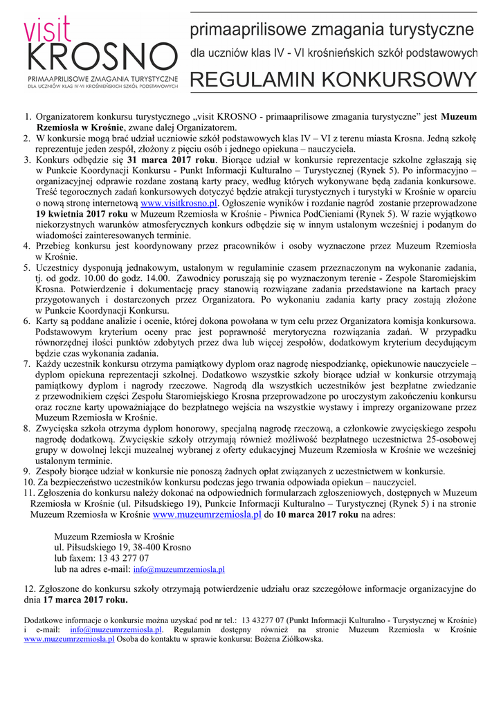 1. Organizatorem konkursu turystycznego „visit KROSNO - primaaprilisowe zmagania turystyczne” jest Muzeum Rzemiosła w Krośnie, zwane dalej Organizatorem. 2. W konkursie mogą brać udział uczniowie szkół podstawowych klas IV – VI z terenu miasta Krosna. Jedną szkołę reprezentuje jeden zespół, złożony z pięciu osób i jednego opiekuna – nauczyciela. 3. Konkurs odbędzie się 31 marca 2017 roku. Biorące udział w konkursie reprezentacje szkolne zgłaszają się w Punkcie Koordynacji Konkursu - Punkt Informacji Kulturalno – Turystycznej (Rynek 5). Po informacyjno – organizacyjnej odprawie rozdane zostaną karty pracy, według których wykonywane będą zadania konkursowe. Treść tegorocznych zadań konkursowych dotyczyć będzie atrakcji turystycznych i turystyki w Krośnie w oparciu o nową stronę internetową www.visitkrosno.pl. Ogłoszenie wyników i rozdanie nagród zostanie przeprowadzone 19 kwietnia 2017 roku w Muzeum Rzemiosła w Krośnie - Piwnica PodCieniami (Rynek 5). W razie wyjątkowo niekorzystnych warunków atmosferycznych konkurs odbędzie się w innym ustalonym wcześniej i podanym do wiadomości zainteresowanych terminie. 4. Przebieg konkursu jest koordynowany przez pracowników i osoby wyznaczone przez Muzeum Rzemiosła w Krośnie. 5. Uczestnicy dysponują jednakowym, ustalonym w regulaminie czasem przeznaczonym na wykonanie zadania, tj. od godz. 10.00 do godz. 14.00. Zawodnicy poruszają się po wyznaczonym terenie - Zespole Staromiejskim Krosna. Potwierdzenie i dokumentację pracy stanowią rozwiązane zadania przedstawione na kartach pracy przygotowanych i dostarczonych przez Organizatora. Po wykonaniu zadania karty pracy zostają złożone w Punkcie Koordynacji Konkursu. 6. Karty są poddane analizie i ocenie, której dokona powołana w tym celu przez Organizatora komisja konkursowa. Podstawowym kryterium oceny prac jest poprawność merytoryczna rozwiązania zadań. W przypadku równorzędnej ilości punktów zdobytych przez dwa lub więcej zespołów, dodatkowym kryterium decydującym będzie czas wykonania zadania. 7. Każdy uczestnik konkursu otrzyma pamiątkowy dyplom oraz nagrodę niespodziankę, opiekunowie nauczyciele – dyplom opiekuna reprezentacji szkolnej. Dodatkowo wszystkie szkoły biorące udział w konkursie otrzymają pamiątkowy dyplom i nagrody rzeczowe. Nagrodą dla wszystkich uczestników jest bezpłatne zwiedzanie z przewodnikiem części Zespołu Staromiejskiego Krosna przeprowadzone po uroczystym zakończeniu konkursu oraz roczne karty upoważniające do bezpłatnego wejścia na wszystkie wystawy i imprezy organizowane przez Muzeum Rzemiosła w Krośnie. 8. Zwycięska szkoła otrzyma dyplom honorowy, specjalną nagrodę rzeczową, a członkowie zwycięskiego zespołu nagrodę dodatkową. Zwycięskie szkoły otrzymają również możliwość bezpłatnego uczestnictwa 25-osobowej grupy w dowolnej lekcji muzealnej wybranej z oferty edukacyjnej Muzeum Rzemiosła w Krośnie we wcześniej ustalonym terminie. 9. Zespoły biorące udział w konkursie nie ponoszą żadnych opłat związanych z uczestnictwem w konkursie. 10. Za bezpieczeństwo uczestników konkursu podczas jego trwania odpowiada opiekun – nauczyciel. 11. Zgłoszenia do konkursu należy dokonać na odpowiednich formularzach zgłoszeniowych, dostępnych w Muzeum Rzemiosła w Krośnie (ul. Piłsudskiego 19), Punkcie Informacji Kulturalno – Turystycznej (Rynek 5) i na stronie Muzeum Rzemiosła w Krośnie www.muzeumrzemiosla.pl do 10 marca 2017 roku na adres: Muzeum Rzemiosła w Krośnie ul. Piłsudskiego 19, 38-400 Krosno lub faxem: 13 43 277 07 lub na adres e-mail: [email protected] 12. Zgłoszone do konkursu szkoły otrzymają potwierdzenie udziału oraz szczegółowe informacje organizacyjne do dnia 17 marca 2017 roku. Dodatkowe informacje o konkursie można uzyskać pod nr tel.: 13 43277 07 (Punkt Informacji Kulturalno - Turystycznej w Krośnie) i e-mail: [email protected]. Regulamin dostępny również na stronie Muzeum Rzemiosła w Krośnie www.muzeumrzemiosla.pl Osoba do kontaktu w sprawie konkursu: Bożena Ziółkowska.