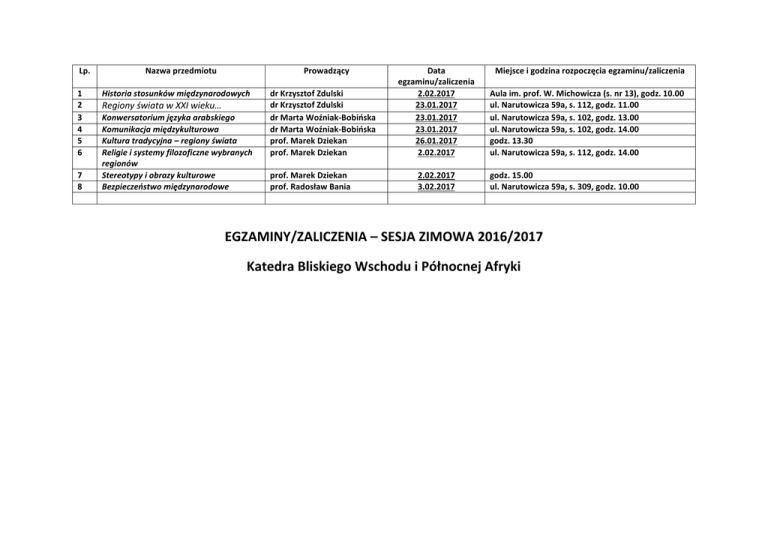 Lp. 1 2 3 4 5 6 7 8 Nazwa przedmiotu Prowadzący Historia stosunków międzynarodowych Regiony świata w XXI wieku… Konwersatorium języka arabskiego Komunikacja międzykulturowa Kultura tradycyjna – regiony świata Religie i systemy filozoficzne wybranych regionów Stereotypy i obrazy kulturowe Bezpieczeństwo międzynarodowe dr Krzysztof Zdulski dr Krzysztof Zdulski dr Marta Woźniak-Bobińska dr Marta Woźniak-Bobińska prof. Marek Dziekan prof. Marek Dziekan prof. Marek Dziekan prof. Radosław Bania Data egzaminu/zaliczenia 2.02.2017 23.01.2017 23.01.2017 23.01.2017 26.01.2017 2.02.2017 2.02.2017 3.02.2017 Miejsce i godzina rozpoczęcia egzaminu/zaliczenia Aula im. prof. W. Michowicza (s. nr 13), godz. 10.00 ul. Narutowicza 59a, s. 112, godz. 11.00 ul. Narutowicza 59a, s. 102, godz. 13.00 ul. Narutowicza 59a, s. 102, godz. 14.00 godz. 13.30 ul. Narutowicza 59a, s. 112, godz. 14.00 godz. 15.00 ul. Narutowicza 59a, s. 309, godz. 10.00 EGZAMINY/ZALICZENIA – SESJA ZIMOWA 2016/2017 Katedra Bliskiego Wschodu i Północnej Afryki