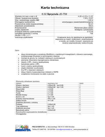 Karta techniczna 6.02 Spryciula JD-759 Wymiary (m) wys x szer x dł Obszar bezpiecznej obwiedni Wys. swobodnego upadku HIC Wymagana nawierzchnia Powierzchnia strefy bezpieczeństwa Głębokość posadowienia Przeznaczenie Części zapasowe Przedział wiekowy użytkowników Certyfikat zgodności z normą PN-EN 1176-1, 2, 7 Instrukcja użytkowania 4,20 x 4,10 x 11,57 7,25 x 15,57 1,30 m amortyzująca: piasek/żwirek/kora/guma 64 m² 50cm Plenerowe place zabaw Dostępne u producenta 3-12 lat Tak Urządzenie służy do zjeżdżania ze zjeżdżalni, wspinania po trapie i drabinkach, przechodzenia w tunelu, po mostku linowym, wspinania po ściance wspinaczkowej i siatce linowej. Opis: słupy konstrukcyjne o przekroju 95x95mm o zaoblonych krawędziach z drewna sosnowego, przecieranego krzyżowo (z pominięciem rdzenia) montaż do gruntu na kotwach stalowych ocynkowanych elementy drewniane impregnowane ciśnieniowo daszki z HPL i żywicy epoksydowej balustrady pełne z HPL tunel z żywicy epoksydowej drążki drabinek ocynkowane liny PP z rdzeniem stalowym ślizg z blachy kwasoodpornej z bokami z HDPE urządzenie montowane na stałe w gruncie Elementy składowe zestawu nazwa wymiary /m/ Wieża z dachem 0,90x0,90 hp=0,95 Wieża z dachem 0,90x0,90 hp=1,45 Ślizg krótki L=2,00 Ślizg długi L=2,50 Tunel L=1,50 Mostek linowy L=1,50 Komin z lin hp=1,45 Ścianka wspinaczkowa HIC=1,45 Siatka linowa H=1,90 Drabinka pionowa z ukośną Podesty 0,90x0,90 Trap wejściowy hp=1,45 Drabinka pionowa hp=1,45 Balustrady pełne 0,60x0,60 Ewentualne wyposażenie dodatkowe: Chorągiewka ilość 1 2 1 1 1 1 1 1 1 1 5 1 1 9 1 PRO-SYMPATYK ul. Bacciarellego 10b/10 51-649 Wrocław Tel/fax 0713487745 501297954 [email protected] www.prosympatyk.pl Karta techniczna 6.02 Spryciula JD-759 Przedstawione wzory urządzeń mogą nieznacznie odbiegać od aktualnie produkowanych przez naszą firmę, ponieważ wciąż staramy się wytwarzać urządzenia o coraz wyższym standardzie i dokonujemy pewnych modyfikacji. PRO-SYMPATYK ul. Bacciarellego 10b/10 51-649 Wrocław Tel/fax 0713487745 501297954 [email protected] www.prosympatyk.pl Karta techniczna 6.02 Spryciula JD-759 Przedstawione wzory urządzeń mogą nieznacznie odbiegać od aktualnie produkowanych przez naszą firmę, ponieważ wciąż staramy się wytwarzać urządzenia o coraz wyższym standardzie i dokonujemy pewnych modyfikacji. PRO-SYMPATYK ul. Bacciarellego 10b/10 51-649 Wrocław Tel/fax 0713487745 501297954 [email protected] www.prosympatyk.pl