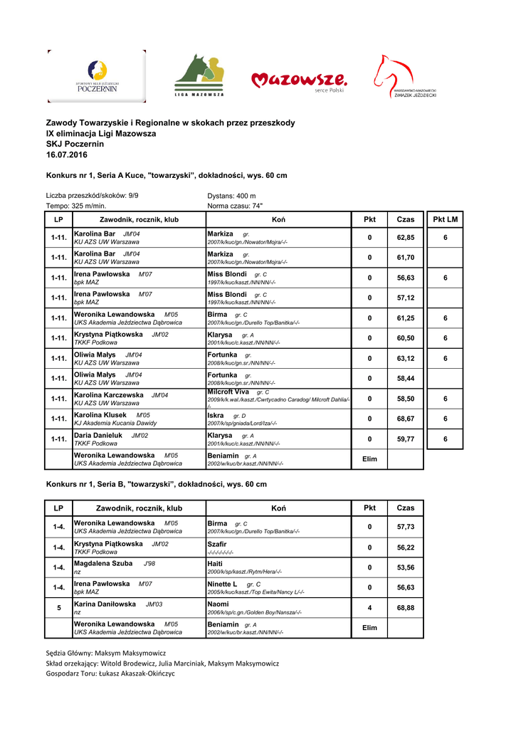 Zawody Towarzyskie i Regionalne w skokach przez przeszkody IX eliminacja Ligi Mazowsza SKJ Poczernin 16.07.2016 Konkurs nr 1, Seria A Kuce, "towarzyski”, dokładności, wys. 60 cm Liczba przeszkód/skoków: 9/9 Tempo: 325 m/min. LP 1-11. 1-11. 1-11. 1-11. 1-11. 1-11. 1-11. 1-11. 1-11. 1-11. 1-11. Dystans: 400 m Norma czasu: 74" Koń Zawodnik, rocznik, klub Karolina Bar JM'04 KU AZS UW Warszawa Markiza Karolina Bar JM'04 KU AZS UW Warszawa Markiza Irena Pawłowska M'07 Miss Blondi M'07 Miss Blondi gr. 2007/k/kuc/gn./Nowator/Mojra/-/gr. 2007/k/kuc/gn./Nowator/Mojra/-/- bpk MAZ Irena Pawłowska gr. C 1997/k/kuc/kaszt./NN/NN/-/- bpk MAZ gr. C 1997/k/kuc/kaszt./NN/NN/-/- Weronika Lewandowska M'05 UKS Akademia Jeździectwa Dąbrowica Birma Krystyna Piątkowska Klarysa JM'02 gr. C 2007/k/kuc/gn./Durello Top/Banitka/-/- TKKF Podkowa gr. A 2001/k/kuc/c.kaszt./NN/NN/-/- Oliwia Małys JM'04 KU AZS UW Warszawa Fortunka Oliwia Małys Fortunka Karolina Karczewska Milcroft Viva gr. 2008/k/kuc/gn.sr./NN/NN/-/- JM'04 KU AZS UW Warszawa gr. 2008/k/kuc/gn.sr./NN/NN/-/- JM'04 KU AZS UW Warszawa Karolina Klusek gr. C 2009/k/k.wal./kaszt./Cwrtycadno Caradog/ Milcroft Dahlia//- M'05 KJ Akademia Kucania Dawidy Iskra Daria Danieluk Klarysa JM'02 gr. D 2007/k/sp/gniada/Lord/Iza/-/- TKKF Podkowa gr. A 2001/k/kuc/c.kaszt./NN/NN/-/- Weronika Lewandowska Beniamin M'05 UKS Akademia Jeździectwa Dąbrowica gr. A 2002/w/kuc/br.kaszt./NN/NN/-/- Pkt Czas Pkt LM 0 62,85 6 0 61,70 0 56,63 0 57,12 0 61,25 6 0 60,50 6 0 63,12 6 0 58,44 0 58,50 6 0 68,67 6 0 59,77 6 Elim Konkurs nr 1, Seria B, "towarzyski”, dokładności, wys. 60 cm LP 1-4. 1-4. 1-4. 1-4. 5 Koń Zawodnik, rocznik, klub Weronika Lewandowska M'05 UKS Akademia Jeździectwa Dąbrowica Birma Krystyna Piątkowska Szafir JM'02 TKKF Podkowa Magdalena Szuba -/-/-/-/-/-/-/- J'98 nz Irena Pawłowska Haiti 2000/k/sp/kaszt./Rytm/Hera/-/- M'07 bpk MAZ Karina Daniłowska gr. C 2007/k/kuc/gn./Durello Top/Banitka/-/- Ninette L gr. C 2005/k/kuc/kaszt./Top Ewita/Nancy L/-/- JM'03 Naomi nz 2006/k/sp/c.gn./Golden Boy/Nansza/-/- Weronika Lewandowska Beniamin M'05 UKS Akademia Jeździectwa Dąbrowica gr. A 2002/w/kuc/br.kaszt./NN/NN/-/- Sędzia Główny: Maksym Maksymowicz Skład orzekający: Witold Brodewicz, Julia Marciniak, Maksym Maksymowicz Gospodarz Toru: Łukasz Akaszak-Okioczyc Pkt Czas 0 57,73 0 56,22 0 53,56 0 56,63 4 68,88 Elim 6 Zawody Towarzyskie i Regionalne w skokach przez przeszkody IX eliminacja Ligi Mazowsza SKJ Poczernin 16.07.2016 Konkurs nr 2, Seria A Kuce i MK, zwykły , wys. 80 cm Liczba przeszkód/skoków: 10/11 Tempo: 325 m/min. LP 1 2 3 4 5 6 7 8 Dystans: 420 m Norma czasu: 78" Koń Zawodnik, rocznik, klub Jagna Grabowska M'05 Cytrynka KU AZS UW Warszawa gr. 2002/k/kuc/izab./Filip/Crazy/-/- Wiktoria Żelazny Andros GB JM'04 SJ Szarża Popówek gr. D 2003/w/kuc/-/Karino GB/Andora GB/-/- Rita Rogalska JM'02 KJ Akademia Kucania Daiwdy Emma Karolina Bar JM'04 KU AZS UW Warszawa Lukrecja Karolina Klusek Iskra gr. A 2006/k/kuc/gn./Lukas/Gwiazdka/-/- M'05 KJ Akademia Kucania Dawidy Karolina Karczewska JM'04 KU AZS UW Warszawa Irena Pawłowska gr. C 2007/k/k.fel./buł./Romus/Empatia/-/- M'07 gr. D 2007/k/sp/gniada/Lord/Iza/-/- Czas Pkt LM 0 48,97 6 0 53,51 6 0 55,43 6 0 55,86 6 0 61,81 6 4 63,39 4 66,22 8 74,19 Milcroft Viva gr. C 2009/k/k.wal./kaszt./Cwrtycadno Caradog/ Milcroft Dahlia//- Ninette L gr. C bpk MAZ 2005/k/kuc/kaszt./Top Ewita/Nancy L/-/- Karolina Bar Iguana Dany's Girl JM'04 KU AZS UW Warszawa Pkt gr. C -/-/-/-/-/-/-/- Sędzia Główny: Maksym Maksymowicz Skład orzekający: Patrycja Supernak, Julia Marciniak, Maksym Maksymowicz Gospodarz Toru: Łukasz Akaszak-Okioczyc Zawody Towarzyskie i Regionalne w skokach przez przeszkody IX eliminacja Ligi Mazowsza SKJ Poczernin 16.07.2016 Konkurs nr 2, Seria B, klasa LL, "towarzyski", zwykły , wys. 80 cm Liczba przeszkód/skoków: 10/11 Tempo: 350 m/min. LP 1 2 3 4 5 6 7 8 9 10 11 12 13 14 15 16 Dystans: 420 m Norma czasu: 72" Koń Zawodnik, rocznik, klub Zbigniew Krasowski Delilah S KJ Dworek Okuniew Wiktoria Żelazny 2010/k/m/gn./Awans/Decybela/-/- Andros GB JM'04 SJ Szarża Popówek gr. D 2003/w/kuc/-/Karino GB/Andora GB/-/- Daria Chilińska JM'02 KKJ Hippika Ostrołęka Kadra Karolina Bar JM'04 KU AZS UW Warszawa Iguana Dany's Girl Zofia Sinczak Berenica 2002/k/sp/c.kaszt./Consor/Kwarta/-/gr. C -/-/-/-/-/-/-/- J'99 nz 2005/k/m/gn./Demon/Baria/-/- Jagna Grabowska Cytrynka M'05 KU AZS UW Warszawa gr. 2002/k/kuc/izab./Filip/Crazy/-/- Karolina Bar Lukrecja JM'04 KU AZS UW Warszawa Kinga Ciszewska gr. A 2006/k/kuc/gn./Lukas/Gwiazdka/-/- Lavan JM'01 bpk MAZ 2003/w/sp/gn./Leo/Litka/-/- Karina Daniłowska Naomi JM'03 nz 2006/k/sp/c.gn./Golden Boy/Nansza/-/- Rita Rogalska JM'02 KJ Akademia Kucania Daiwdy Emma Julia Mroczek Bravado Queen gr. C 2007/k/k.fel./buł./Romus/Empatia/-/- J'99 nz -/-/-/-/-/-/-/- Ewa Siara Szafir JM'00 TKKF Podkowa -/-/-/-/-/-/-/- Magdalena Szuba Haiti J'98 nz Tadeusz Roman 2000/k/sp/kaszt./Rytm/Hera/-/- Dama R S KKJ Hippika Ostrołęka 2006/k/sp/siwa/Loxley/Drygula/-/- Agnieszka Kotwa-Grudzińska bpk MAZ J'98 nz nz Gamberro 2008/w/m/gn./Saganek/Genossin/-/- Kamila Ronowska Mikołaj Gonciarz S Poncesja 2007/k/wlkp/siwa/Espedero/Plecionka/-/- S Aisab 2006/w/sp/gn./Howel/Alfa/-/- Sędzia Główny: Maksym Maksymowicz Skład orzekający: Patrycja Supernak, Julia Marciniak, Maksym Maksymowicz Gospodarz Toru: Łukasz Akaszak-Okioczyc Pkt Czas Pkt LM 0 53,51 6 0 54,23 6 0 57,90 6 0 61,55 6 0 63,40 6 4 47,53 4 54,59 4 57,50 4 58,20 4 58,33 4 63,41 8 52,78 12 62,04 12 63,53 12 68,02 13 75,71 Elim Zawody Towarzyskie i Regionalne w skokach przez przeszkody IX eliminacja Ligi Mazowsza SKJ Poczernin 16.07.2016 Konkurs nr 3, „towarzyski”, kl. L, z ustalonym czasem, wys. 100 cm Czas ustalony: 60" LP 1 2 3 4 5 6 7 8 9 10 11 Koń Zawodnik, rocznik, klub Wiktoria Pawlik JM'02 KJ Szwadron Jazdy RP Stara Miłosna Dancer Paulina Misior JM 02 KJ Akademia Kucania Dawidy El - Vis Zbigniew Krasowski Delilah
