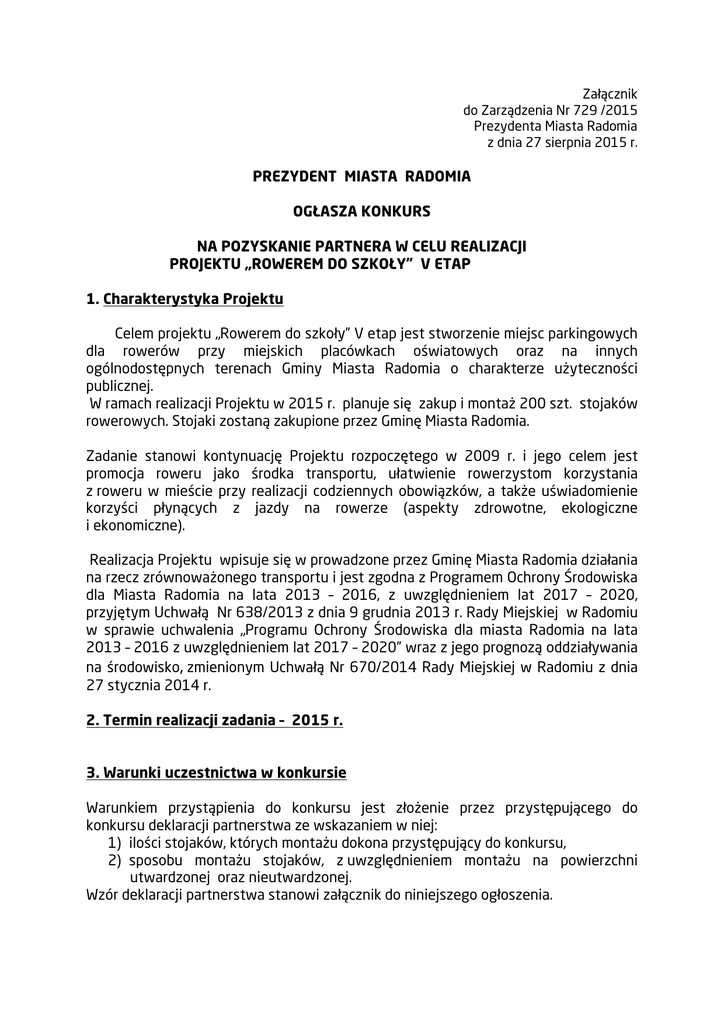 Załącznik do Zarządzenia Nr 729 /2015 Prezydenta Miasta Radomia z dnia 27 sierpnia 2015 r. PREZYDENT MIASTA RADOMIA OGŁASZA KONKURS NA POZYSKANIE PARTNERA W CELU REALIZACJI PROJEKTU „ROWEREM DO SZKOŁY” V ETAP 1. Charakterystyka Projektu Celem projektu „Rowerem do szkoły” V etap jest stworzenie miejsc parkingowych dla rowerów przy miejskich placówkach oświatowych oraz na innych ogólnodostępnych terenach Gminy Miasta Radomia o charakterze użyteczności publicznej. W ramach realizacji Projektu w 2015 r. planuje się zakup i montaż 200 szt. stojaków rowerowych. Stojaki zostaną zakupione przez Gminę Miasta Radomia. Zadanie stanowi kontynuację Projektu rozpoczętego w 2009 r. i jego celem jest promocja roweru jako środka transportu, ułatwienie rowerzystom korzystania z roweru w mieście przy realizacji codziennych obowiązków, a także uświadomienie korzyści płynących z jazdy na rowerze (aspekty zdrowotne, ekologiczne i ekonomiczne). Realizacja Projektu wpisuje się w prowadzone przez Gminę Miasta Radomia działania na rzecz zrównoważonego transportu i jest zgodna z Programem Ochrony Środowiska dla Miasta Radomia na lata 2013 – 2016, z uwzględnieniem lat 2017 – 2020, przyjętym Uchwałą Nr 638/2013 z dnia 9 grudnia 2013 r. Rady Miejskiej w Radomiu w sprawie uchwalenia „Programu Ochrony Środowiska dla miasta Radomia na lata 2013 – 2016 z uwzględnieniem lat 2017 – 2020” wraz z jego prognozą oddziaływania na środowisko, zmienionym Uchwałą Nr 670/2014 Rady Miejskiej w Radomiu z dnia 27 stycznia 2014 r. 2. Termin realizacji zadania – 2015 r. 3. Warunki uczestnictwa w konkursie Warunkiem przystąpienia do konkursu jest złożenie przez przystępującego do konkursu deklaracji partnerstwa ze wskazaniem w niej: 1) ilości stojaków, których montażu dokona przystępujący do konkursu, 2) sposobu montażu stojaków, z uwzględnieniem montażu na powierzchni utwardzonej oraz nieutwardzonej. Wzór deklaracji partnerstwa stanowi załącznik do niniejszego ogłoszenia. Montaż zakupionych przez Gminę Miasta Radomia 200 sztuk stojaków rowerowych będzie się odbywał we wskazanych miejscach na terenie Gminy Miasta Radomia. Gmina Miasta Radomia zobowiązuje się do informowania opinii publicznej o udziale partnera wyłonionego w drodze niniejszego konkursu w realizacji Projektu oraz do umieszczenia informacji danych adresowych partnera przynajmniej na jednym ze stojaków montowanych w danej lokalizacji (stojak z reklamą). Deklarację partnerstwa w formie pisemnej, czytelnej oferty należy złożyć w terminie 7 dni od daty ukazania się ogłoszenia w sekretariacie Wydziału Ochrony Środowiska i Rolnictwa Urzędu Miejskiego w Radomiu, ul. Kilińskiego 30, pok. 310 lub wysłać drogą pocztową na adres: Urząd Miejski, Wydział Ochrony Środowiska i Rolnictwa 26-610 Radom, ul. J. Kilińskiego 30 (liczy się data wpływu oferty). Deklaracja partnerstwa winna być opatrzona pieczęcią przystępującego do konkursu oraz pieczęcią imienną i podpisem osób upoważnionych do składania oświadczeń woli w jego imieniu, złożona w jednym egzemplarzu, w zamkniętej kopercie opatrzonej napisem „Konkurs” oraz nazwą zadania wymienionego w ogłoszeniu. O wyborze partnera zadecyduje komisja konkursowa powołana przez Prezydenta Miasta Radomia. Szczegółowe warunki współpracy z wyłonionym partnerem zostaną określone w odrębnej umowie. Wyniki konkursu zostaną podane do publicznej wiadomości na stronie internetowej www.radom.pl.