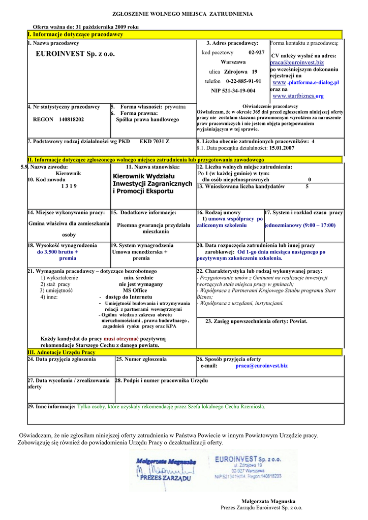 ZGŁOSZENIE WOLNEGO MIEJSCA ZATRUDNIENIA Oferta ważna do: 31 października 2009 roku I. Informacje dotyczące pracodawcy 1. Nazwa pracodawcy 3. Adres pracodawcy: kod pocztowy EUROINVEST Sp. z o.o. 02-927 Warszawa ulica Zdrojowa 19 telefon 0-22-885-91-91 NIP 521-34-19-004 4. Nr statystyczny pracodawcy REGON 140818202 5. 6. Forma własności: prywatna Forma prawna: Spółka prawa handlowego 7. Podstawowy rodzaj działalności wg PKD EKD 7031 Z Forma kontaktu z pracodawcą: CV należy wysłać na adres: [email protected] po wcześniejszym dokonaniu rejestracji na www .platforma.e-dialog.pl oraz na www.startbiznes.org Oświadczenie pracodawcy Oświadczam, że w okresie 365 dni przed zgłoszeniem niniejszej oferty pracy nie zostałam skazana prawomocnym wyrokiem za naruszenie praw pracowniczych i nie jestem objęta postępowaniem wyjaśniającym w tej sprawie. 8. Liczba obecnie zatrudnionych pracowników: 4 8.1. Data początku działalności: 15.01.2007 II. Informacje dotyczące zgłoszonego wolnego miejsca zatrudnienia lub przygotowania zawodowego 5.9. Nazwa zawodu: 11. Nazwa stanowiska: 12. Liczba wolnych miejsc zatrudnienia: Kierownik Po 1 (w każdej gminie) w tym: Kierownik Wydziału 10. Kod zawodu dla osób niepełnosprawnych Inwestycji Zagranicznych 13. Wnioskowana liczba kandydatów 1319 i Promocji Eksportu 14. Miejsce wykonywania pracy: Gmina właściwa dla zamieszkania osoby 18. Wysokość wynagrodzenia do 3.500 brutto + premia 15. Dodatkowe informacje: Pisemna gwarancja przydziału mieszkania 19. System wynagrodzenia Umowa menedżerska + premia 21. Wymagania pracodawcy – dotyczące bezrobotnego 1) wykształcenie min. średnie 2) staż pracy nie jest wymagany 3) umiejętność MS Office 4) inne: - dostęp do Internetu - Umiejętność budowania i utrzymywania relacji z partnerami wewnętrznymi - Ogólna wiedza z zakresu obrotu nieruchomościami , prawa budowlnaego , zagadnień rynku pracy oraz KPA Każdy kandydat do pracy musi otrzymać pozytywną rekomendacje Starszego Cechu z danego powiatu. III. Adnotacje Urzędu Pracy 24. Data przyjęcia zgłoszenia 25. Numer zgłoszenia 0 5 16. Rodzaj umowy 17. System i rozkład czasu pracy 1) umowa współpracy po zaliczonym szkoleniu jednozmianowy (9:00 – 17:00) 20. Data rozpoczęcia zatrudnienia lub innej pracy zarobkowej: Od 1-go dnia miesiąca następnego po pozytywnym zakończeniu szkolenia. 22. Charakterystyka lub rodzaj wykonywanej pracy: - Przygotowanie umów z Gminami na realizacje inwestycji tworzących stałe miejsca pracy w gminach; - Współpraca z Partnerami Krajowego Sztabu programu Start Biznes; - Współpraca z urzędami, instytucjami. 23. Zasięg upowszechnienia oferty: Powiat. 26. Sposób przyjęcia oferty e-mail: [email protected] 27. Data wycofania / zrealizowania 28. Podpis i numer pracownika Urzędu oferty 29. Inne informacje: Tylko osoby, które uzyskały rekomendację przez Szefa lokalnego Cechu Rzemiosła. Oświadczam, że nie zgłosiłam niniejszej oferty zatrudnienia w Państwa Powiecie w innym Powiatowym Urzędzie pracy. Zobowiązuję się również do powiadomienia Urzędu Pracy o dezaktualizacji oferty. Małgorzata Magnuska Prezes Zarządu Euroinvest Sp. z o.o.