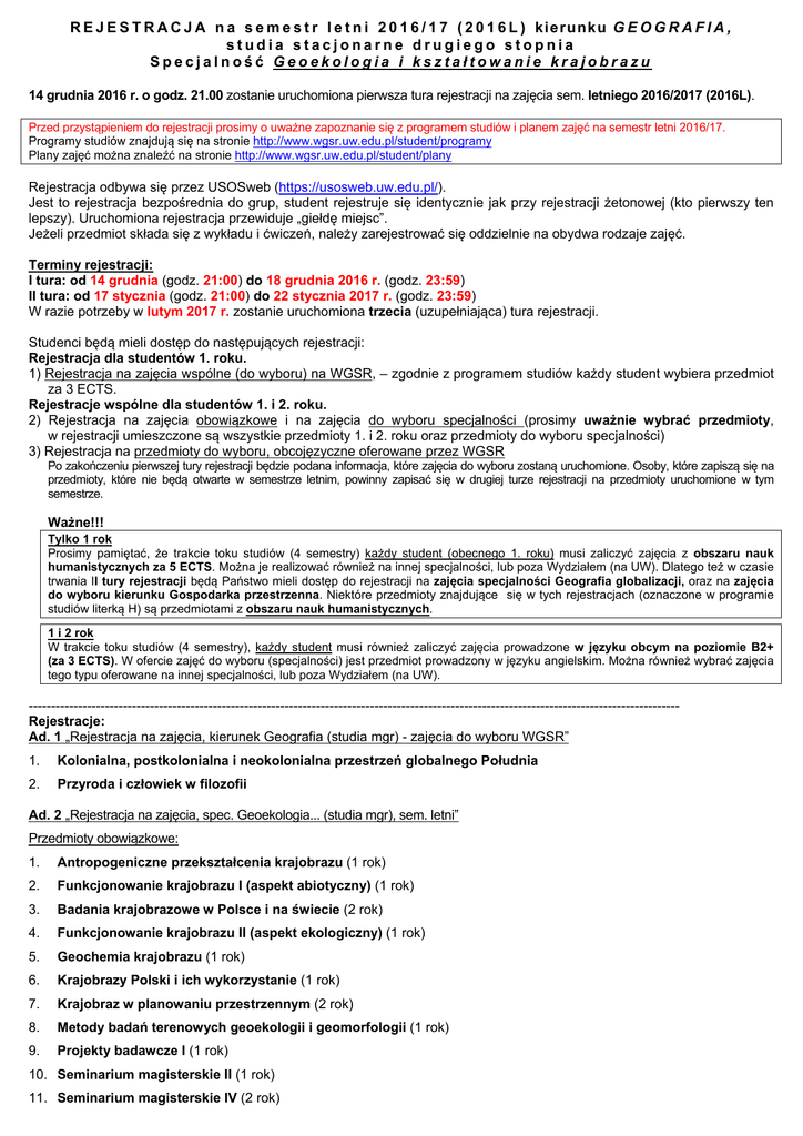 R E J E S T R A C J A n a s e m e s t r l e t n i 2 0 1 6 / 1 7 ( 2 0 1 6 L ) kierunku G E O G R A F I A , studia stacjonarne drugiego stopnia Specjalność Geoekologia i kształtowanie krajobrazu 14 grudnia 2016 r. o godz. 21.00 zostanie uruchomiona pierwsza tura rejestracji na zajęcia sem. letniego 2016/2017 (2016L). Przed przystąpieniem do rejestracji prosimy o uważne zapoznanie się z programem studiów i planem zajęć na semestr letni 2016/17. Programy studiów znajdują się na stronie http://www.wgsr.uw.edu.pl/student/programy Plany zajęć można znaleźć na stronie http://www.wgsr.uw.edu.pl/student/plany Rejestracja odbywa się przez USOSweb (https://usosweb.uw.edu.pl/). Jest to rejestracja bezpośrednia do grup, student rejestruje się identycznie jak przy rejestracji żetonowej (kto pierwszy ten lepszy). Uruchomiona rejestracja przewiduje „giełdę miejsc”. Jeżeli przedmiot składa się z wykładu i ćwiczeń, należy zarejestrować się oddzielnie na obydwa rodzaje zajęć. Terminy rejestracji: I tura: od 14 grudnia (godz. 21:00) do 18 grudnia 2016 r. (godz. 23:59) II tura: od 17 stycznia (godz. 21:00) do 22 stycznia 2017 r. (godz. 23:59) W razie potrzeby w lutym 2017 r. zostanie uruchomiona trzecia (uzupełniająca) tura rejestracji. Studenci będą mieli dostęp do następujących rejestracji: Rejestracja dla studentów 1. roku. 1) Rejestracja na zajęcia wspólne (do wyboru) na WGSR, – zgodnie z programem studiów każdy student wybiera przedmiot za 3 ECTS. Rejestracje wspólne dla studentów 1. i 2. roku. 2) Rejestracja na zajęcia obowiązkowe i na zajęcia do wyboru specjalności (prosimy uważnie wybrać przedmioty, w rejestracji umieszczone są wszystkie przedmioty 1. i 2. roku oraz przedmioty do wyboru specjalności) 3) Rejestracja na przedmioty do wyboru, obcojęzyczne oferowane przez WGSR Po zakończeniu pierwszej tury rejestracji będzie podana informacja, które zajęcia do wyboru zostaną uruchomione. Osoby, które zapiszą się na przedmioty, które nie będą otwarte w semestrze letnim, powinny zapisać się w drugiej turze rejestracji na przedmioty uruchomione w tym semestrze. Ważne!!! Tylko 1 rok Prosimy pamiętać, że trakcie toku studiów (4 semestry) każdy student (obecnego 1. roku) musi zaliczyć zajęcia z obszaru nauk humanistycznych za 5 ECTS. Można je realizować również na innej specjalności, lub poza Wydziałem (na UW). Dlatego też w czasie trwania II tury rejestracji będą Państwo mieli dostęp do rejestracji na zajęcia specjalności Geografia globalizacji, oraz na zajęcia do wyboru kierunku Gospodarka przestrzenna. Niektóre przedmioty znajdujące się w tych rejestracjach (oznaczone w programie studiów literką H) są przedmiotami z obszaru nauk humanistycznych. 1 i 2 rok W trakcie toku studiów (4 semestry), każdy student musi również zaliczyć zajęcia prowadzone w języku obcym na poziomie B2+ (za 3 ECTS). W ofercie zajęć do wyboru (specjalności) jest przedmiot prowadzony w języku angielskim. Można również wybrać zajęcia tego typu oferowane na innej specjalności, lub poza Wydziałem (na UW). ------------------------------------------------------------------------------------------------------------------------------------------------Rejestracje: Ad. 1 „Rejestracja na zajęcia, kierunek Geografia (studia mgr) - zajęcia do wyboru WGSR” 1. Kolonialna, postkolonialna i neokolonialna przestrzeń globalnego Południa 2. Przyroda i człowiek w filozofii Ad. 2 „Rejestracja na zajęcia, spec. Geoekologia... (studia mgr), sem. letni” Przedmioty obowiązkowe: 1. Antropogeniczne przekształcenia krajobrazu (1 rok) 2. Funkcjonowanie krajobrazu I (aspekt abiotyczny) (1 rok) 3. Badania krajobrazowe w Polsce i na świecie (2 rok) 4. Funkcjonowanie krajobrazu II (aspekt ekologiczny) (1 rok) 5. Geochemia krajobrazu (1 rok) 6. Krajobrazy Polski i ich wykorzystanie (1 rok) 7. Krajobraz w planowaniu przestrzennym (2 rok) 8. Metody badań terenowych geoekologii i geomorfologii (1 rok) 9. Projekty badawcze I (1 rok) 10. Seminarium magisterskie II (1 rok) 11. Seminarium magisterskie IV (2 rok) Przedmioty do wyboru specjalności: 1. Funkcjonowanie dolin i renaturyzacja rzek 2. Geomorfologia świata 3. Geoekolog we współczesnym świecie 4. Kształtowanie równowagi w krajobrazie rolniczym 5. Krajobraz w GIS 6. Rzeźbotwórcza rola procesów ekstremalnych Ad. 3 „Rejestracja na przedmioty do wyboru, obcojęzyczne oferowane przez WGSR”: 1. Contemporary changes of tourism space (przedmiot oferowany przez specjalność Geografia miast i turystyki) 2. Contemporary changes of urban space (przedmiot oferowany przez specjalność Geografia miast i turystyki) 3. Culture and spatial planning (przedmiot oferowany na kierunku Gospodarka przestrzenna) 4. Field remote sensing data analysis (przedmiot oferowany przez specjalność Geoinformatyka, kartografia, teledetekcja) 5. From sustainable to smart city (przedmiot oferowany na kierunku Gospodarka przestrzenna) 6. Human bioclimatology (przedmiot oferowany przez specjalność Hydrologia i klimatologia) 7. Landscape of the Earth (przedmiot oferowany przez specjalność Geoekologia i kształtowanie krajobrazu) 8. Nature, Culture, and Tourism in North America (przedmiot oferowany przez specjalność Geografia globalizacji) ------------------------------------------------------------------------------------------------------------------------------------------------Informacje o rejestracji żetonowej na zajęcia ogólnouniwersyteckie (lOGUNy) można znaleźć na stronie http://rejestracja.usos.uw.edu.pl/ Prosimy o rozważne i przemyślane wybory!!!, ponieważ po zakończeniu rejestracji jedynie w uzasadnionych przypadkach, będzie możliwa zamiana grup, lub dopisanie się na zajęcia. Prosimy pamiętać, że zarówno zarejestrowanie, jak i wyrejestrowanie się z zajęć jest możliwe tylko w czasie trwania rejestracji. Po jej zakończeniu studenci mogą tylko zgłosić prośbę o „r