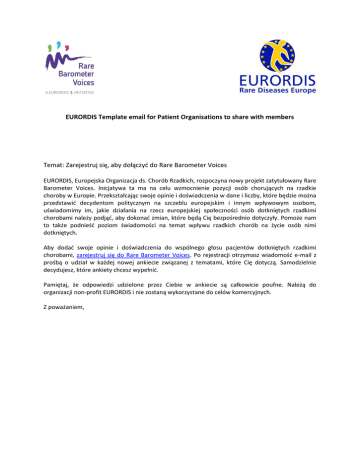 EURORDIS Template email for Patient Organisations to share with members Temat: Zarejestruj się, aby dołączyć do Rare Barometer Voices EURORDIS, Europejska Organizacja ds. Chorób Rzadkich, rozpoczyna nowy projekt zatytułowany Rare Barometer Voices. Inicjatywa ta ma na celu wzmocnienie pozycji osób chorujących na rzadkie choroby w Europie. Przekształcając swoje opinie i doświadczenia w dane i liczby, które będzie można przedstawić decydentom politycznym na szczeblu europejskim i innym wpływowym osobom, uświadomimy im, jakie działania na rzecz europejskiej społeczności osób dotkniętych rzadkimi chorobami należy podjąć, aby dokonać zmian, które będą Cię bezpośrednio dotyczyły. Pomoże nam to także podnieść poziom świadomości na temat wpływu rzadkich chorób na życie osób nimi dotkniętych. Aby dodać swoje opinie i doświadczenia do wspólnego głosu pacjentów dotkniętych rzadkimi chorobami, zarejestruj się do Rare Barometer Voices. Po rejestracji otrzymasz wiadomość e-mail z prośbą o udział w każdej nowej ankiecie związanej z tematami, które Cię dotyczą. Samodzielnie decydujesz, które ankiety chcesz wypełnić. Pamiętaj, że odpowiedzi udzielone przez Ciebie w ankiecie są całkowicie poufne. Należą do organizacji non-profit EURORDIS i nie zostaną wykorzystane do celów komercyjnych. Z poważaniem,