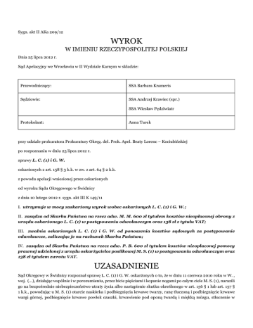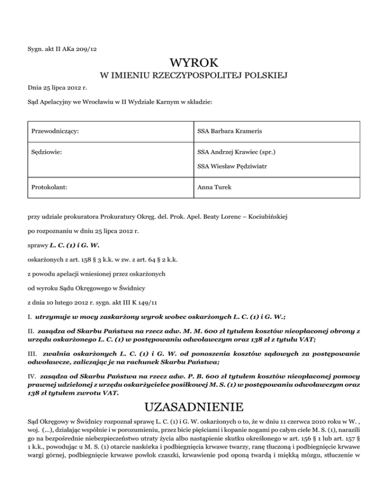 Sygn. akt II AKa 209/12 WYROK W IMIENIU RZECZYPOSPOLITEJ POLSKIEJ Dnia 25 lipca 2012 r. Sąd Apelacyjny we Wrocławiu w II Wydziale Karnym w składzie: Przewodniczący: SSA Barbara Krameris Sędziowie: SSA Andrzej Krawiec (spr.) SSA Wiesław Pędziwiatr Protokolant: Anna Turek przy udziale prokuratora Prokuratury Okręg. del. Prok. Apel. Beaty Lorenc – Kociubińskiej po rozpoznaniu w dniu 25 lipca 2012 r. sprawy L. C. (1) i G. W. oskarżonych z art. 158 § 3 k.k. w zw. z art. 64 § 2 k.k. z powodu apelacji wniesionej przez oskarżonych od wyroku Sądu Okręgowego w Świdnicy z dnia 10 lutego 2012 r. sygn. akt III K 149/11 I. utrzymuje w mocy zaskarżony wyrok wobec oskarżonych L. C. (1) i G. W.; II. zasądza od Skarbu Państwa na rzecz adw. M. M. 600 zł tytułem kosztów nieopłaconej obrony z urzędu oskarżonego L. C. (1) w postępowaniu odwoławczym oraz 138 zł z tytułu VAT; III. zwalnia oskarżonych L. C. (1) i G. W. od ponoszenia kosztów sądowych za postępowanie odwoławcze, zaliczając je na rachunek Skarbu Państwa; IV. zasądza od Skarbu Państwa na rzecz adw. P. B. 600 zł tytułem kosztów nieopłaconej pomocy prawnej udzielonej z urzędu oskarżycielce posiłkowej M. S. (1) w postępowaniu odwoławczym oraz 138 zł tytułem zwrotu VAT. UZASADNIENIE Sąd Okręgowy w Świdnicy rozpoznał sprawę L. C. (1) i G. W. oskarżonych o to, że w dniu 11 czerwca 2010 roku w W. , woj. (...), działając wspólnie i w porozumieniu, przez bicie pięściami i kopanie nogami po całym ciele M. S. (1), narazili go na bezpośrednie niebezpieczeństwo utraty życia albo nastąpienie skutku określonego w art. 156 § 1 lub art. 157 § 1 k.k., powodując u M. S. (1) otarcie naskórka i podbiegnięcia krwawe twarzy, ranę tłuczoną i podbiegnięcie krwawe wargi górnej, podbiegnięcie krwawe powłok czaszki, krwawienie pod oponą twardą i miękką mózgu, stłuczenie w płatach skroniowym i potylicznym lewym mózgu z następowym masywnym obrzękiem mózgu, podbiegnięcia krwawe języka, tkanek grzbietu w okolicy lędźwiowej i pośladka, okolicy biodra lewego, na lewym udzie, prawym kolanie, lewej pięcie, lewym podudziu, ranę i podbiegnięcie krwawe w okolicy zausznej lewej, otarcie naskórka na czole, w okolicy obu łokci, na dłoni lewej, na lewym kolanie, wybroczyny krwawe w skórze okolicy lędźwiowej prawej i na lewym udzie, gdzie następstwem urazu głowy, wywołującym krwawienie do jamy czaszkowej i stłuczenie mózgu była śmierć M. S. (1), przy czym L. C. (1) czynu tego dopuścił się będąc uprzednio skazany wyrokiem Sądu Rejonowego w Wałbrzychu z dnia 12 lipca 2001 roku, sygn. akt: II K 298/2001 za czyn z art. 280 § 1 k.k. i art. 157 § 1 k.k. w zw. z art. 11 § 2 k.k. w zw. z art. 64 § 2 k.k. na karę 3 lat i 6 miesięcy pozbawienia wolności, objęty wyrokiem łącznym Sądu Rejonowego w Wałbrzychu z dnia 25 października 2002 roku, sygn. akt: II K 568/2002, którą odbył w okresie od dnia 21 grudnia 2000 roku do dnia 26 stycznia 2001 roku i od dnia 11 stycznia 2003 roku do dnia 4 lipca 2005 roku; natomiast G. W. czynu tego dopuścił się będąc uprzednio skazany wyrokiem Sądu Rejonowego w Wałbrzychu z dnia 25 listopada 2002 roku, sygn. akt: III K 605/02 za czyn z art. 280 §1 k.k. i art. 288 § 1 k.k. w zw. z art. 11 § 2 k.k. w zw. z art. 64 § 1 k.k. na karę 3 lat pozbawienia wolności, którą odbył w okresie od dnia 9 stycznia 2002 roku do dnia 26 marca 2004 roku oraz od dnia 11 marca 2005 roku do dnia 7 lipca 2005 roku; - to jest o czyn z art. 158 § 1 i §3 k.k. w zw. z art. 64 § 2 k.k. Po rozpoznaniu tej sprawy Sąd Okręgowy w Świdnicy wyrokiem z dnia 10 lutego 2012 roku uznał oskarżonych L. C. (1) i G. W. za winnych czynu opisanego w części wstępnej, z tym iż z opisu tego czynu wyeliminował stwierdzenie, że oskarżeni mieli kopać pokrzywdzonego nogami po całym ciele i przyjął, że spowodowali oni u M. S. (1) uraz głowy, otarcie naskórka i podbiegnięcia krwawe twarzy w okolicy obu oczodołów i okolicy ust, prawej okolicy skroniowej, prawej ciemieniowej i tylnej części okolicy ciemieniowej, otarć naskórka nosa i w okolicy obu łokci, gdzie następstwem urazu głowy wywołującym krwawienie do jamy czaszkowej i stłuczenie mózgu była śmierć M. S. (1), a nadto przyjął, że skutek w postaci śmierci pokrzywdzonego mogli oni przewidzieć – to jest uznał ich za winnych czynu z art. 158 § 3 k.k. w zw. z art. 64 § 2 k.k. i za to na podstawie art. 158 § 3 k.k. wymierzył im kary po 8 lat pozbawienia wolności. P o n a d t o: - na podstawie art. 63 § 1 k.k. na poczet orzeczonych wobec oskarżonych kar pozbawienia wolności zaliczył okresy ich rzeczywistego pozbawienia wolności w sprawie – L. C. (1) od 28 czerwca 2010 r. do 12 stycznia 2011 r., zaś G. W. od 28 czerwca 2010 r. do 30 grudnia 2011 r., - na podstawie art. 230 § 2 k.p.k. orzekł o dowodach rzeczowych, - zwolnił oskarżonych od kosztów sądowych. Wyrok powyższy zaskarżyli obrońcy obu oskarżonych. Apelacja obrońcy L. C. (1) zarzuca (dosłowny cytat): „1. naruszenie art. 5 § 2 k.p.k. sprowadzające się do tłumaczenia występujących w realiach przedmiotowej sprawy istotnych wątpliwości w zakresie ustalenia związku przyczynowego pomiędzy inkryminowanym zachowaniem oskarżonemu L. C., a skutkiem w postaci śmierci pokrzywdzonego M. S. (1), na niekorzyść tegoż oskarżonego, 2. błąd w ustaleniach faktycznych przyjętych za podstawę orzeczenia mogący mieć wpływ na jego treść, wyrażający się w arbitralnym i causalnie nieuzasadnionym przyjęciu, iż inkryminowane oskarżonemu L. C. zachowanie polegające na pobiciu pokrzywdzonego M. S., doprowadziło do powstania zmian urazowych w obrębie OUN tegoż pokrzywdzonego, które następnie skutkowały jego zgonem, 3. art. 443 k.p.k. sprowadzającego się do dokonania przez Sąd Okręgowy ustaleń faktycznych w sposób odmienny od tego, który stanowił podstawę poprzedniego orzeczenia Sądu