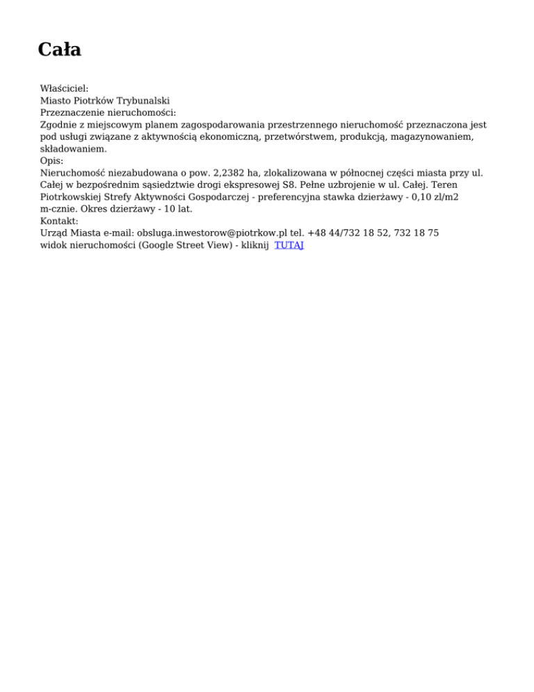 Cała Właściciel: Miasto Piotrków Trybunalski Przeznaczenie nieruchomości: Zgodnie z miejscowym planem zagospodarowania przestrzennego nieruchomość przeznaczona jest pod usługi związane z aktywnością ekonomiczną, przetwórstwem, produkcją, magazynowaniem, składowaniem. Opis: Nieruchomość niezabudowana o pow. 2,2382 ha, zlokalizowana w północnej części miasta przy ul. Całej w bezpośrednim sąsiedztwie drogi ekspresowej S8. Pełne uzbrojenie w ul. Całej. Teren Piotrkowskiej Strefy Aktywności Gospodarczej - preferencyjna stawka dzierżawy - 0,10 zl/m2 m-cznie. Okres dzierżawy - 10 lat. Kontakt: Urząd Miasta e-mail: [email protected] tel. +48 44/732 18 52, 732 18 75 widok nieruchomości (Google Street View) - kliknij TUTAJ