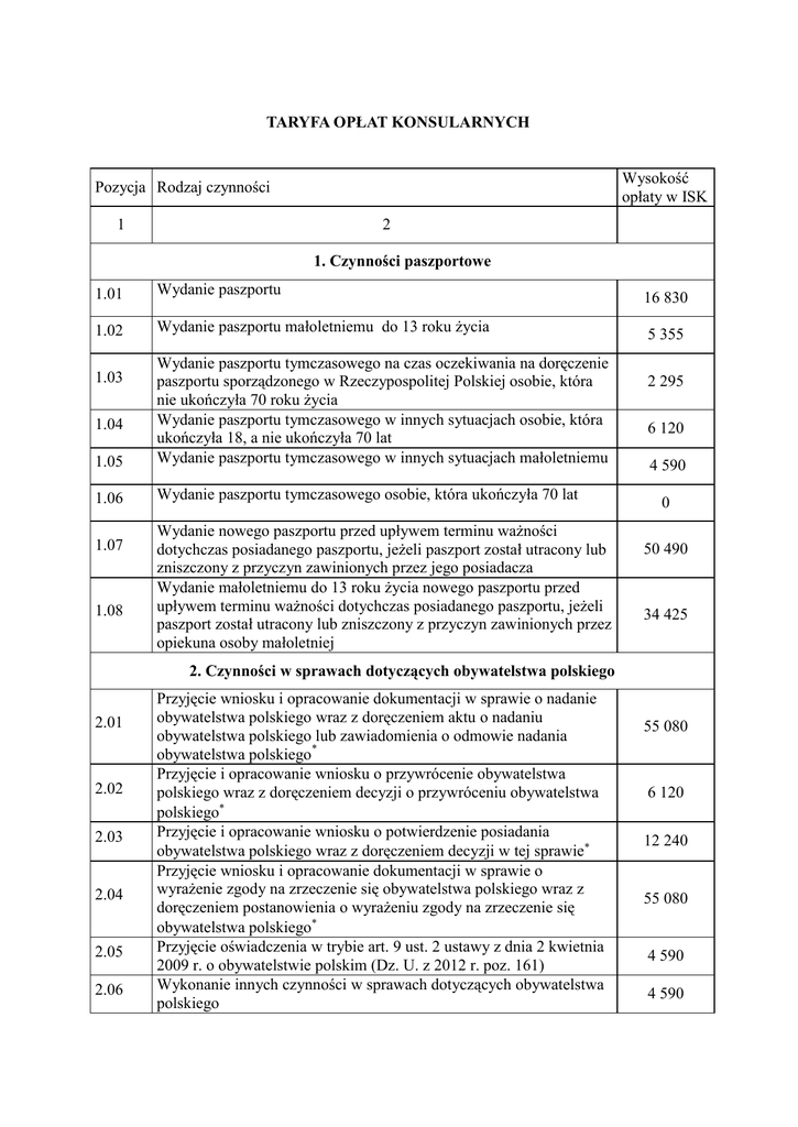 TARYFA OPŁAT KONSULARNYCH Wysokość opłaty w ISK Pozycja Rodzaj czynności 1 2 1. Czynności paszportowe 1.01 Wydanie paszportu 1.02 Wydanie paszportu małoletniemu do 13 roku życia 1.05 Wydanie paszportu tymczasowego na czas oczekiwania na doręczenie paszportu sporządzonego w Rzeczypospolitej Polskiej osobie, która nie ukończyła 70 roku życia Wydanie paszportu tymczasowego w innych sytuacjach osobie, która ukończyła 18, a nie ukończyła 70 lat Wydanie paszportu tymczasowego w innych sytuacjach małoletniemu 1.06 Wydanie paszportu tymczasowego osobie, która ukończyła 70 lat 1.03 1.04 1.07 1.08 Wydanie nowego paszportu przed upływem terminu ważności dotychczas posiadanego paszportu, jeżeli paszport został utracony lub zniszczony z przyczyn zawinionych przez jego posiadacza Wydanie małoletniemu do 13 roku życia nowego paszportu przed upływem terminu ważności dotychczas posiadanego paszportu, jeżeli paszport został utracony lub zniszczony z przyczyn zawinionych przez opiekuna osoby małoletniej 16 830 5 355 2 295 6 120 4 590 0 50 490 34 425 2. Czynności w sprawach dotyczących obywatelstwa polskiego 2.01 2.02 2.03 2.04 2.05 2.06 Przyjęcie wniosku i opracowanie dokumentacji w sprawie o nadanie obywatelstwa polskiego wraz z doręczeniem aktu o nadaniu obywatelstwa polskiego lub zawiadomienia o odmowie nadania obywatelstwa polskiego* Przyjęcie i opracowanie wniosku o przywrócenie obywatelstwa polskiego wraz z doręczeniem decyzji o przywróceniu obywatelstwa polskiego Przyjęcie i opracowanie wniosku o potwierdzenie posiadania obywatelstwa polskiego wraz z doręczeniem decyzji w tej sprawie Przyjęcie wniosku i opracowanie dokumentacji w sprawie o wyrażenie zgody na zrzeczenie się obywatelstwa polskiego wraz z doręczeniem postanowienia o wyrażeniu zgody na zrzeczenie się obywatelstwa polskiego Przyjęcie oświadczenia w trybie art. 9 ust. 2 ustawy z dnia 2 kwietnia 2009 r. o obywatelstwie polskim (Dz. U. z 2012 r. poz. 161) Wykonanie innych czynności w sprawach dotyczących obywatelstwa polskiego 55 080 6 120 12 240 55 080 4 590 4 590 –2– 3. Czynności wizowe 3.01 Przyjęcie i rozpatrzenie wniosku o wydanie wizy krajowej 3.02 Przyjęcie i rozpatrzenie wniosku o ponowne rozpatrzenie wniosku o wydanie wizy Schengen lub wizy krajowej Przyjęcie odwołania od decyzji o odmowie wydania wizy dla członka rodziny obywatela Unii Europejskiej w rozumieniu art. 2 pkt 4 w związku z pkt 3 ustawy z dnia 14 lipca 2006 roku o wjeździe na terytorium Rzeczypospolitej Polskiej, pobycie i wyjeździe z tego terytorium obywateli państw członkowskich Unii Europejskiej i członków ich rodzin (Dz. U. Nr 144, poz. 1043, z późn. zm.) Przyjęcie i rozpatrzenie wniosku o wydanie zezwolenia na przekroczenie granicy w ramach małego ruchu granicznego 3.03 3.04 9 180 9 180 0 3 060 4. Inne czynności wykonywane w sprawach cudzoziemców 4.01 4.02 4.03 4.04 Przyjęcie i opracowanie wniosku o udzielenie zezwolenia na zamieszkanie na czas oznaczony wraz z doręczeniem decyzji o udzieleniu przez wojewodę zezwolenia na zamieszkanie na czas oznaczony Doręczenie decyzji o udzieleniu przez wojewodę zezwolenia na zamieszkanie na czas oznaczony Wydanie tymczasowego polskiego dokumentu podróży cudzoziemca Wydanie tymczasowego dokumentu podróży określonego w decyzji Rady 96/409/WPZiB z dnia 25 czerwca 1996 r. w sprawie ustanowienia tymczasowego dokumentu podróży (Dz. Urz. UE L 168 z 06.07.1996, str. 4–11) 30 600 18 360 13 770 4 590 5. Zaświadczenia i zezwolenia 5.01 5.02 5.03 5.04 Uzyskanie i doręczenie informacji o osobie z Krajowego Rejestru Karnego Wydanie zaświadczenia zezwalającego na przywóz broni na terytorium Rzeczypospolitej Polskiej lub przewóz broni w tranzycie Wydanie zaświadczenia zezwalającego na przewiezienie zwłok lub szczątków ludzkich Wydanie innego zaświadczenia niż określone w pozycjach 5.01–5.03 taryfy opłat konsularnych 9 180 9 180 7 650 4 590 6. Legalizacje, uwierzytelnienia, tłumaczenia, czynności notarialne 6.01 Legalizacja dokumentu 4 590 6.02 Uwierzytelnienie dokumentu 4 590 6.03 Legalizacja i uwierzytelnienie dokumentu (legalizacja pełna) 6.04 Sporządzenie i poświadczenie tłumaczenia z języka polskiego na język obcy lub z języka obcego na język polski – za każdą rozpoczętą 9 180 13 770 –3– 6.05 6.06 6.07 6.08 6.09 stronę tłumaczenia Sprawdzenie i poświadczenie tłumaczenia z języka polskiego na język obcy lub z języka obcego na język polski – za każdą rozpoczętą stronę tłumaczenia Sporządzenie i poświadczenie tłumaczenia z języka polskiego na język obcy lub z języka obcego na język polski dokumentów stanu cywilnego lub innych dokumentów o treściach powtarzalnych Sporządzenie i poświadczenie zgodności odpisu, wypisu, wyciągu lub fotokopii z okazanym oryginałem lub uwierzytelnionym odpisem tego dokumentu Poświadczenie zgodności odpisu, wypisu, wyciągu lub fotokopii z okazanym oryginałem lub uwierzytelnionym odpisem tego dokumentu Poświadczenie własnoręczności podpisu lub znaku ręcznego 6.11 Poświadczenie daty okazania dokumentu, w tym faktury, rachunku lub świadectwa pochodzenia Sporządzenie aktu notarialnego 6.12 Wykonanie innej czynności notarialnej 6.13 Potwierdzenie profilu zaufanego ePUAP 6.10 4 590 4 590 9 180 4 590 4 590 4 590 18 360 4 590 0 7. Czynności w sprawach dotyczących stanu cywilnego 7.01 7.02 7.03 7.04 7.05 7.06 7.07 Przygotowanie dokumentacji dotyczącej zawarcia małżeństwa przed konsulem, zorganizowanie uroczystości w urzędzie konsularnym, przyjęcie oświadczeń o wstąpieniu w związek małżeński oraz oświadczeń w sprawie nazwiska małżonków i ich dzieci, sporządzenie protokołu z przyjęcia przedmiotowych oświadczeń, przekazanie dokumentacji do urzędu stanu cywilnego w kraju oraz doręczenie odpisu aktu małżeństwa Przygotowanie dokumentacji związanej z wpisaniem zagranicznego dokumentu dotyczącego stanu cywilnego do polskich ksi