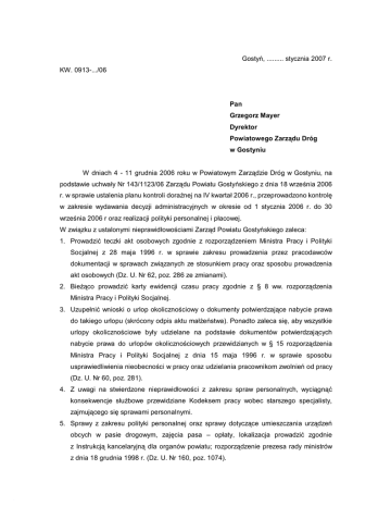 Gostyń, ......... stycznia 2007 r. KW. 0913-.../06 Pan Grzegorz Mayer Dyrektor Powiatowego Zarządu Dróg w Gostyniu W dniach 4 - 11 grudnia 2006 roku w Powiatowym Zarządzie Dróg w Gostyniu, na podstawie uchwały Nr 143/1123/06 Zarządu Powiatu Gostyńskiego z dnia 18 września 2006 r. w sprawie ustalenia planu kontroli doraźnej na IV kwartał 2006 r., przeprowadzono kontrolę w zakresie wydawania decyzji administracyjnych w okresie od 1 stycznia 2006 r. do 30 września 2006 r oraz realizacji polityki personalnej i płacowej. W związku z ustalonymi nieprawidłowościami Zarząd Powiatu Gostyńskiego zaleca: 1. Prowadzić teczki akt osobowych zgodnie z rozporządzeniem Ministra Pracy i Polityki Socjalnej z 28 maja 1996 r. w sprawie zakresu prowadzenia przez pracodawców dokumentacji w sprawach związanych ze stosunkiem pracy oraz sposobu prowadzenia akt osobowych (Dz. U. Nr 62, poz. 286 ze zmianami). 2. Bieżąco prowadzić karty ewidencji czasu pracy zgodnie z § 8 ww. rozporządzenia Ministra Pracy i Polityki Socjalnej. 3. Uzupełnić wnioski o urlop okolicznościowy o dokumenty potwierdzające nabycie prawa do takiego urlopu (skrócony odpis aktu małżeństwa). Ponadto zaleca się, aby wszystkie urlopy okolicznościowe były udzielane na podstawie dokumentów potwierdzających nabycie prawa do urlopów okolicznościowych przewidzianych w § 15 rozporządzenia Ministra Pracy i Polityki Socjalnej z dnia 15 maja 1996 r. w sprawie sposobu usprawiedliwienia nieobecności w pracy oraz udzielania pracownikom zwolnień od pracy (Dz. U. Nr 60, poz. 281). 4. Z uwagi na stwierdzone nieprawidłowości z zakresu spraw personalnych, wyciągnąć konsekwencje służbowe przewidziane Kodeksem pracy wobec starszego specjalisty, zajmującego się sprawami personalnymi. 5. Sprawy z zakresu polityki personalnej oraz sprawy dotyczące umieszczania urządzeń obcych w pasie drogowym, zajęcia pasa – opłaty, lokalizacja prowadzić zgodnie z Instrukcją kancelaryjną dla organów powiatu; rozporządzenie prezesa rady ministrów z dnia 18 grudnia 1998 r. (Dz. U. Nr 160, poz. 1074). 6. Umożliwić pracownikom odpowiedzialnym za przygotowanie projektów decyzji administracyjnych oraz pracownikowi odpowiedzialnemu za prowadzenie archiwum zakładowego odbycie szkolenia z zakresu kodeksu postępowania administracyjnego, instrukcji kancelaryjnej oraz kursu kancelaryjno – archiwistycznego w Archiwum Państwowym w Lesznie. Termin wykonania zaleceń określa się na dzień 31 marca 2007 r. Zarząd Powiatu Gostyńskiego prosi – w terminie 14 dni od daty wykonania niniejszych zaleceń pokontrolnych – o informację dot. sposobu wykorzystania uwag i wykonania wniosków, bądź podjętych działaniach na rzecz realizacji wniosków lub przyczyn niepodjęcia takich działań.