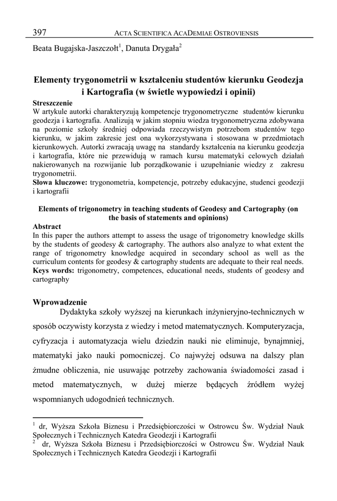 397 ACTA SCIENTIFICA ACADEMIAE OSTROVIENSIS Beata Bugajska-Jaszczołt1, Danuta Drygała2 Elementy trygonometrii w kształceniu studentów kierunku Geodezja i Kartografia (w świetle wypowiedzi i opinii) Streszczenie W artykule autorki charakteryzują kompetencje trygonometryczne studentów kierunku geodezja i kartografia. Analizują w jakim stopniu wiedza trygonometryczna zdobywana na poziomie szkoły średniej odpowiada rzeczywistym potrzebom studentów tego kierunku, w jakim zakresie jest ona wykorzystywana i stosowana w przedmiotach kierunkowych. Autorki zwracają uwagę na standardy kształcenia na kierunku geodezja i kartografia, które nie przewidują w ramach kursu matematyki celowych działań nakierowanych na rozwijanie lub porządkowanie i uzupełnianie wiedzy z zakresu trygonometrii. Słowa kluczowe: trygonometria, kompetencje, potrzeby edukacyjne, studenci geodezji i kartografii Elements of trigonometry in teaching students of Geodesy and Cartography (on the basis of statements and opinions) Abstract In this paper the authors attempt to assess the usage of trigonometry knowledge skills by the students of geodesy & cartography. The authors also analyze to what extent the range of trigonometry knowledge acquired in secondary school as well as the curriculum contents for geodesy & cartography students are adequate to their real needs. Keys words: trigonometry, competences, educational needs, students of geodesy and cartography Wprowadzenie Dydaktyka szkoły wyższej na kierunkach inżynieryjno-technicznych w sposób oczywisty korzysta z wiedzy i metod matematycznych. Komputeryzacja, cyfryzacja i automatyzacja wielu dziedzin nauki nie eliminuje, bynajmniej, matematyki jako nauki pomocniczej. Co najwyżej odsuwa na dalszy plan żmudne obliczenia, nie usuwając potrzeby zachowania świadomości zasad i metod matematycznych, w dużej mierze będących źródłem wyżej wspomnianych udogodnień technicznych. 1 dr, Wyższa Szkoła Biznesu i Przedsiębiorczości w Ostrowcu Św. Wydział Nauk Społecznych i Technicznych Katedra Geodezji i Kartografii 2 dr, Wyższa Szkoła Biznesu i Przedsiębiorczości w Ostrowcu Św. Wydział Nauk Społecznych i Technicznych Katedra Geodezji i Kartografii ACTA SCIENTIFICA ACADEMIAE OSTROVIENSIS 398 Edukacyjna marginalizacja matematyki, która zaowocowała wieloletnią jej nieobecnością jako obowiązkowego przedmiotu na egzaminie maturalnym, spowodowała również ograniczenia objętości zagadnień i umiejętności matematycznych zapisywanych w standardach kształcenia na różnych kierunkach studiów inżynieryjno-technicznych. Dzisiaj matematyka znowu od kilku lat jest obowiązkowym przedmiotem maturalnym, jednak wydaje się, że w standardach kształcenia niewiele się zmieniło, a wykładowcy różnych działów matematyki na kierunkach technicznych w dalszym ciągu próbują jak najlepiej dostosować zakres oferowanej studentom wiedzy matematycznej do ich potrzeb wynikających z przedmiotów zawodowych. Badania w zakresie potrzeb edukacyjnych kształcenia matematycznego na kierunkach inżynieryjno-technicznych przeprowadził Gustaw Treliński3. W tym celu ankietował wykładowców przedmiotów zawodowych Wyższej Szkoły Biznesu i Przedsiębiorczości w Ostrowcu, pod kątem potrzeb kształcenia matematycznego, jak też obszarów i zakresu wykorzystania treści oraz pożądanych umiejętności matematycznych w kształceniu zawodowym. W tej ankiecie znalazły się te zagadnienia matematyczne (pojęcia, algorytmy, metody), które są odnotowywane w standardach kształcenia dla kierunku studiów geodezja i kartografia. Wyniki badań G. Trelińskiego zainspirowały nas do napisania tego artykułu. Prowadząc od kilku lat ćwiczenia z matematyki na I roku geodezji i kartografii w tejże uczelni, miałyśmy okazję wielokrotnie słyszeć w rozmowach ze studentami tego kierunku, że często podczas zajęć z przedmiotów zawodowych pojawiała się konieczność wykorzystania wiedzy i umiejętności z zakresu trygonometrii. W opiniach studentów owa wiedza i umiejętności na tyle wykraczały poza ich możliwości, że wymagało to mniej lub bardziej 3 G. Treliński, Edukacja matematyczna w systemie kształcenia studentów kierunku geodezja i kartografia, „Acta Scientifica Academiae Ostroviensis” Zeszyt 35-36 Katedra Geodezji i Kartografii, Ostrowiec Św. 2011, s. 89-114. 399 ACTA SCIENTIFICA ACADEMIAE OSTROVIENSIS samodzielnego uzupełniania tych treści. W konsekwencji, przygotowując koncepcję nauczania na następny rok akademicki, w czerwcu 2011 r. przeprowadziłyśmy rozmowy diagnozujące potrzebę wprowadzenia tych wiadomości w ramy kursu matematyki w I semestrze I roku studiów. Istotnym ograniczeniem naszej inicjatywy były standardy kształcenia na kierunku geodezji i kartografii4, które nie przewidują w ramach kursu matematyki celowych działań nakierowanych na rozwijanie lub porządkowanie i uzupełnianie wiedzy z zakresu trygonometrii. Oznacza to w praktyce, że wielu studentów nie zna tych treści, a ich opracowywanie następuje dopiero w toku zajęć z przedmiotów kierunkowych, np. geodezji czy fizyki; często z tymi problemami studenci borykają się samodzielnie. Należy ponadto pamiętać, że absolwenci szkół średnich zazwyczaj nie posiadają umiejętności uczenia się z wykorzystaniem różnych źródeł informacji, w szczególności studiowania literatury matematycznej, która charakteryzuje się specyficzną konstrukcją układu treści, logiką rozumowań oraz językiem. Analiza w/w okoliczności skłoniła nas do bardziej wnikliwego zbadania kwestii związanych z koniecznością włączenia do kursu matematyki w I semestrze I roku studiów kierunku Geodezja i Kartografia zagadnień trygonometrycznych. Nieodzownym warunkiem selekcji materiału, wyboru koncepcji dydaktycznej jego opracowywania jest określenie nie tylko niezbędności wewnątrz oraz międzyprzedmiotowej tych treści, ale także określenie rzeczywistyc