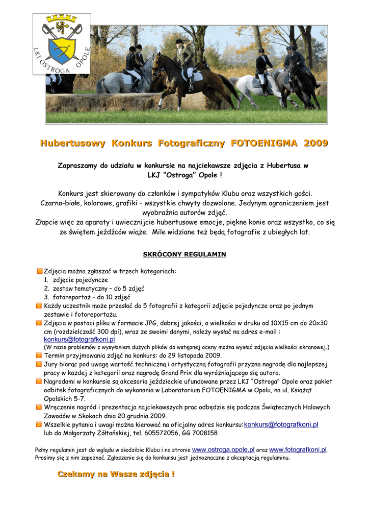 Hubertusowy Konkurs Fotograficzny FOTOENIGMA 2009 Zapraszamy do udziału w konkursie na najciekawsze zdjęcia z Hubertusa w LKJ “Ostroga” Opole ! Konkurs jest skierowany do członków i sympatyków Klubu oraz wszystkich gości. Czarno-białe, kolorowe, grafiki – wszystkie chwyty dozwolone. Jedynym ograniczeniem jest wyobraźnia autorów zdjęć. Złapcie więc za aparaty i uwiecznijcie hubertusowe emocje, piękne konie oraz wszystko, co się ze świętem jeźdźców wiąże. Mile widziane też będą fotografie z ubiegłych lat. SKRÓCONY REGULAMIN Zdjęcia można zgłaszać w trzech kategoriach: 1. zdjęcie pojedyncze 2. zestaw tematyczny – do 5 zdjęć 3. fotoreportaż – do 10 zdjęć Każdy uczestnik może przesłać do 5 fotografii z kategorii zdjęcie pojedyncze oraz po jednym zestawie i fotoreportażu. Zdjęcia w postaci pliku w formacie JPG, dobrej jakości, o wielkości w druku od 10X15 cm do 20x30 cm (rozdzielczość 300 dpi), wraz ze swoimi danymi, należy wysłać na adres e-mail : [email protected] (W razie problemów z wysyłaniem dużych plików do wstępnej oceny można wysłać zdjęcia wielkości ekranowej.) Termin przyjmowania zdjęć na konkurs: do 29 listopada 2009. Jury biorąc pod uwagę wartość techniczną i artystyczną fotografii przyzna nagrodę dla najlepszej pracy w każdej z kategorii oraz nagrodę Grand Prix dla wyróżniającego się autora. Nagrodami w konkursie są akcesoria jeździeckie ufundowane przez LKJ “Ostroga” Opole oraz pakiet odbitek fotograficznych do wykonania w Laboratorium FOTOENIGMA w Opolu, na ul. Książąt Opolskich 5-7. Wręczenie nagród i prezentacja najciekawszych prac odbędzie się podczas Świątecznych Halowych Zawodów w Skokach dnia 20 grudnia 2009. Wszelkie pytania i uwagi można kierować na oficjalny adres konkursu: [email protected] lub do Małgorzaty Żółtańskiej, tel. 605572056, GG 7008158 Pełny regulamin jest do wglądu w siedzibie Klubu i na stronie www.ostroga.opole.pl oraz www.fotografkoni.pl. Prosimy się z nim zapoznać. Zgłoszenie się do konkursu jest jednoznaczne z akceptacją regulaminu. Czekamy na Wasze zdjęcia !