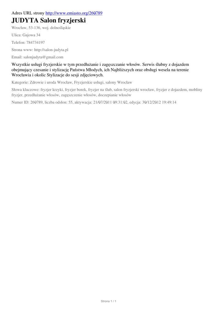 Adres URL strony http://www.emiasto.org/260789 JUDYTA Salon fryzjerski Wrocław, 53-136, woj. dolnośląskie Ulica: Gajowa 34 Telefon: 784734197 Strona www: http://salon-judyta.pl Email: [email protected] Wszystkie usługi fryzjerskie w tym przedłużanie i zagęszczanie włosów. Serwis ślubny z dojazdem obejmujący czesanie i stylizację Państwa Młodych, ich Najbliższych oraz obsługi wesela na terenie Wrocławia i okolic Stylizacje do sesji zdjęciowych. Kategorie: Zdrowie i uroda Wrocław, Fryzjerskie usługi, salony Wrocław Słowa kluczowe: fryzjer krzyki, fryzjer borek, fryzjer na ślub, salon fryzjerski wrocław, fryzjer z dojazdem, mobliny fryzjer, przedłużanie włosów, zagęszczenie włosów, doczepianie włosów Numer ID: 260789, liczba odsłon: 55, aktywacja: 21/07/2011 09:31:02, edycja: 30/12/2012 19:49:14 Strona 1 / 1